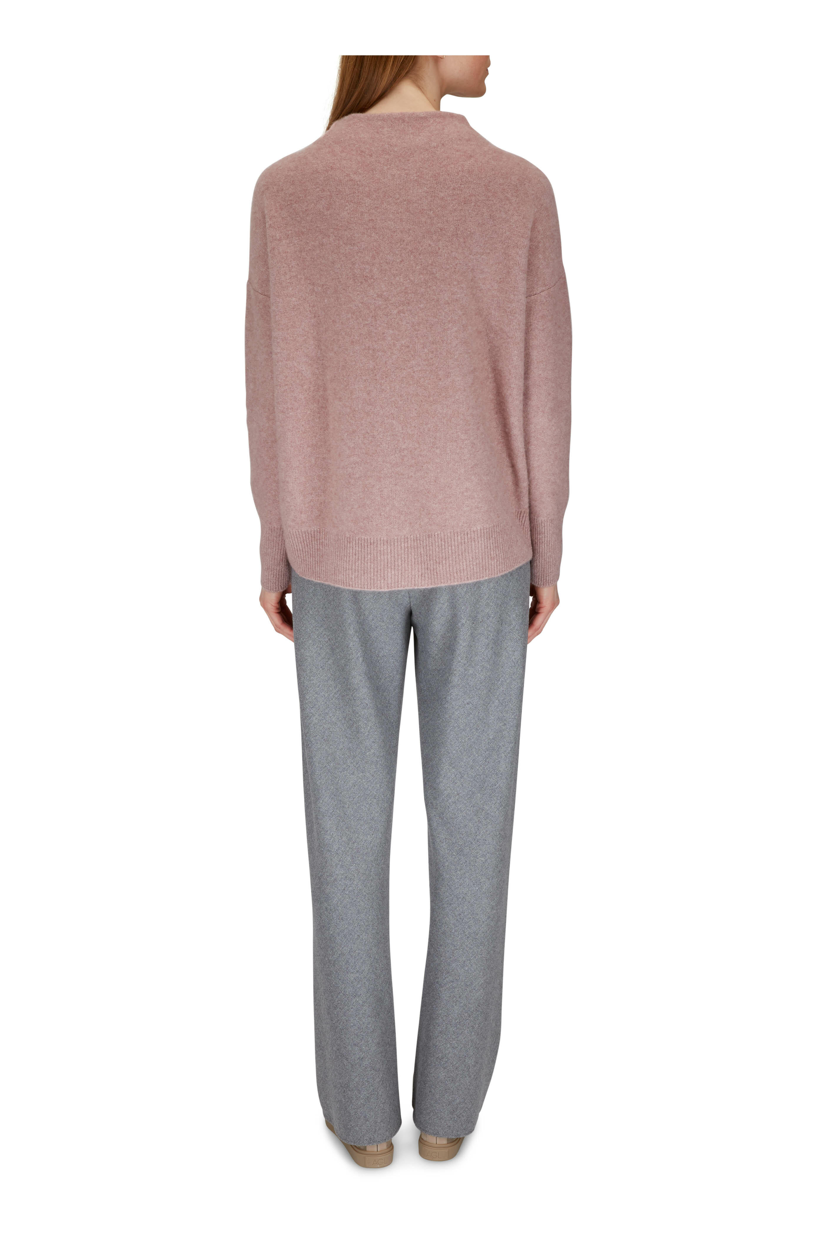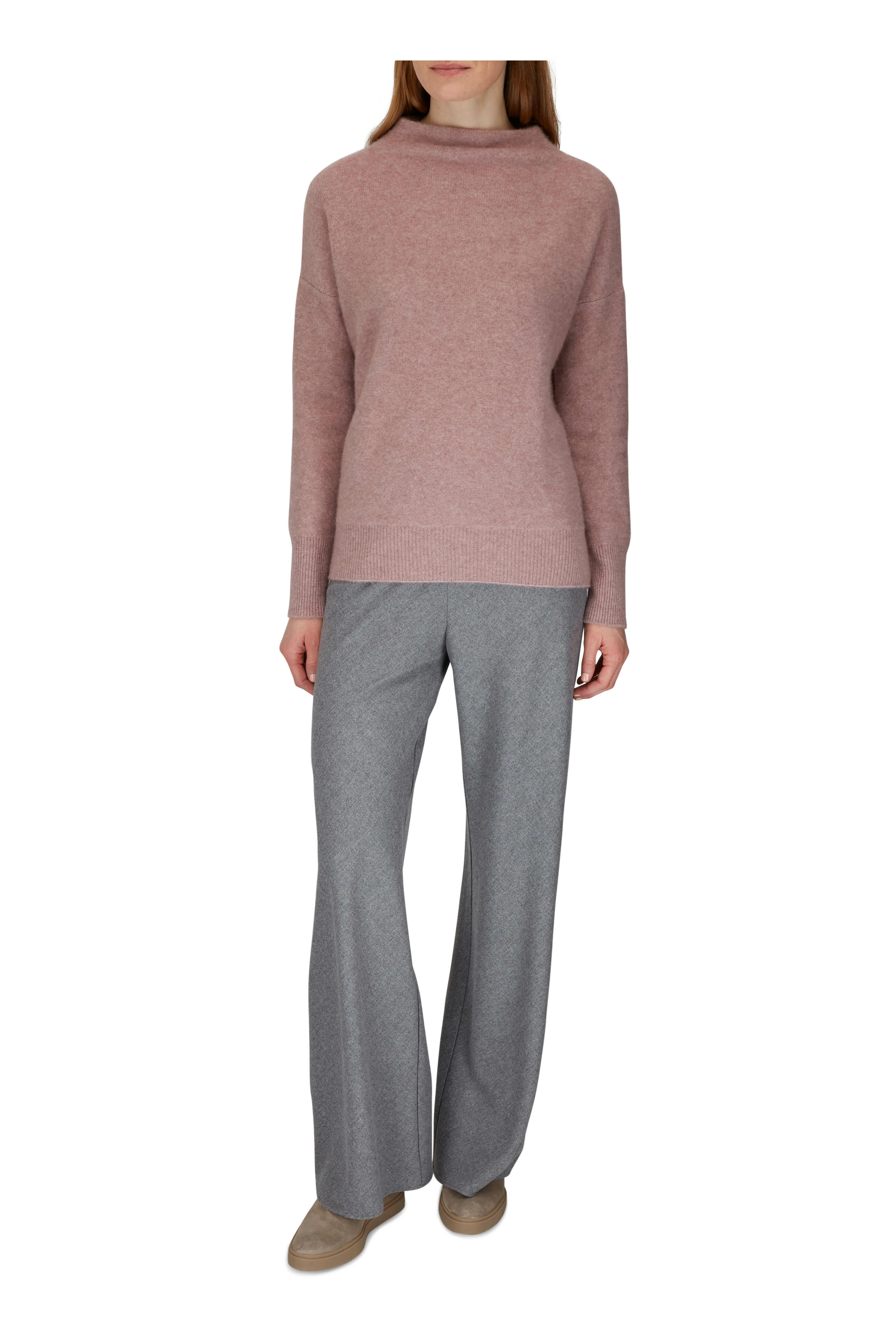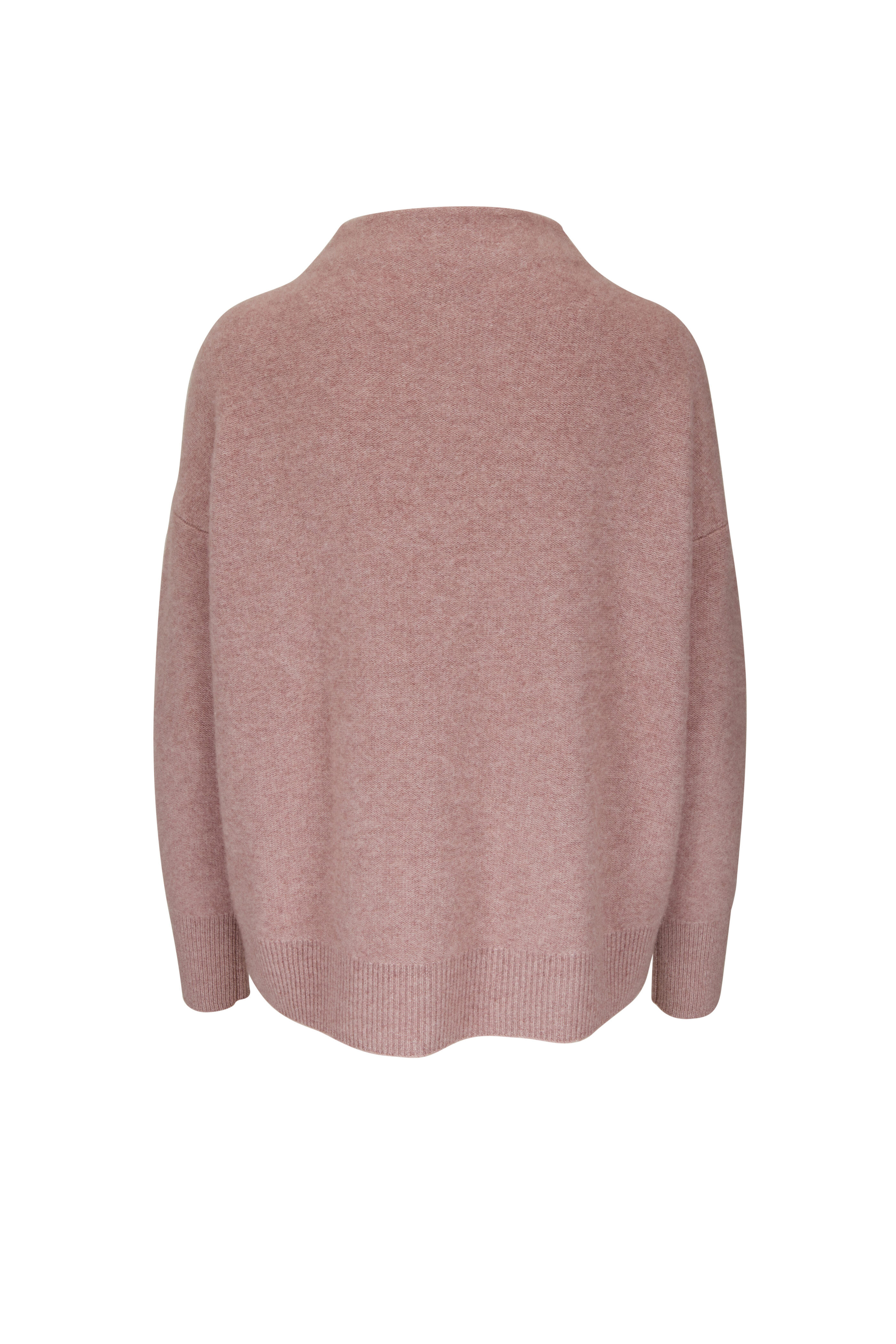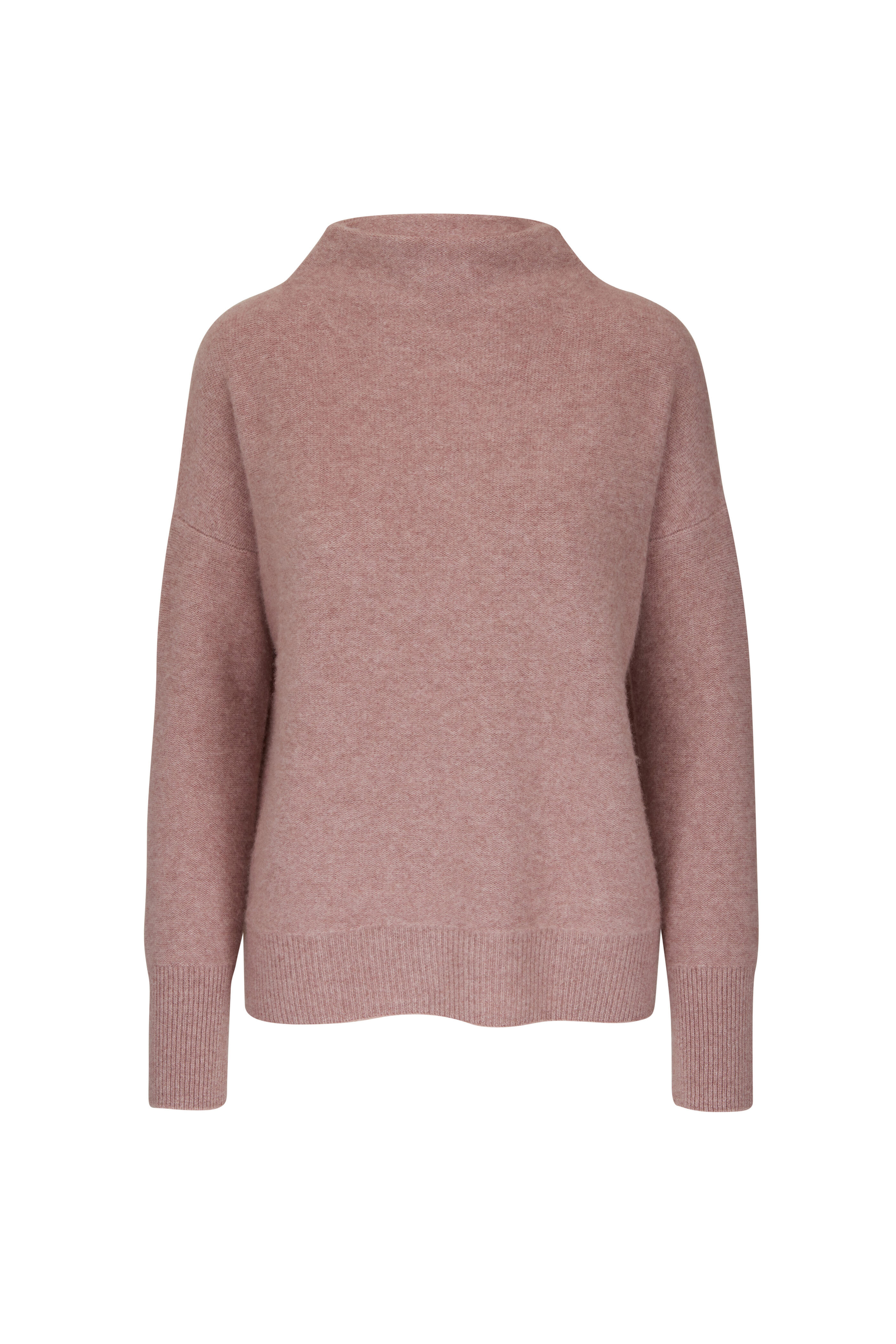 Funnel neckline. Ribbed trim. Imported. 100% boiled cashmere. Hand wash.