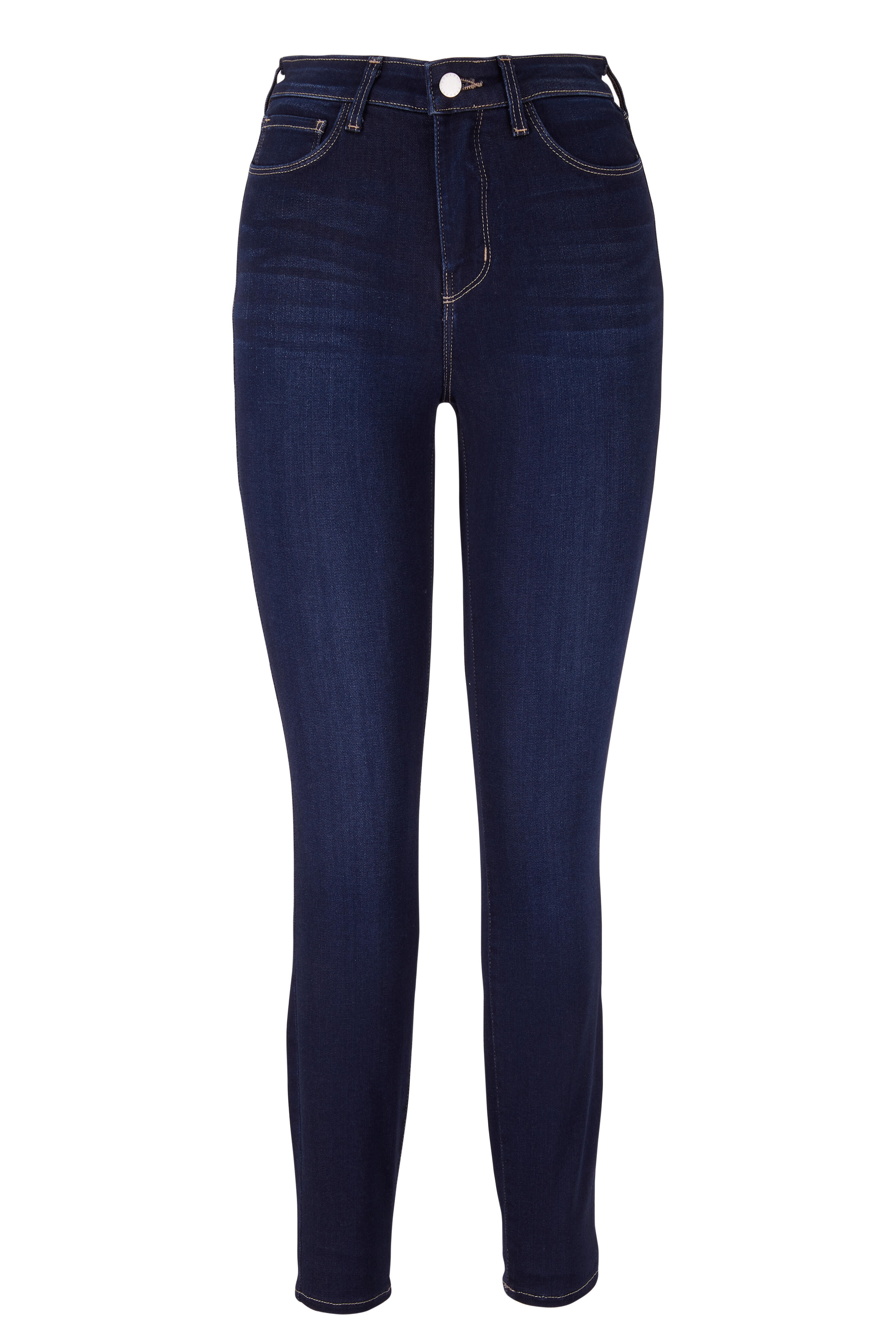 Five pocket styling. Made in the USA. Color: Haines. High-rise, skinny. 26" inseam. 43% cotton, 33% rayon, 17% lyocell, 5% polyester, 2% spandex. Machine wash.