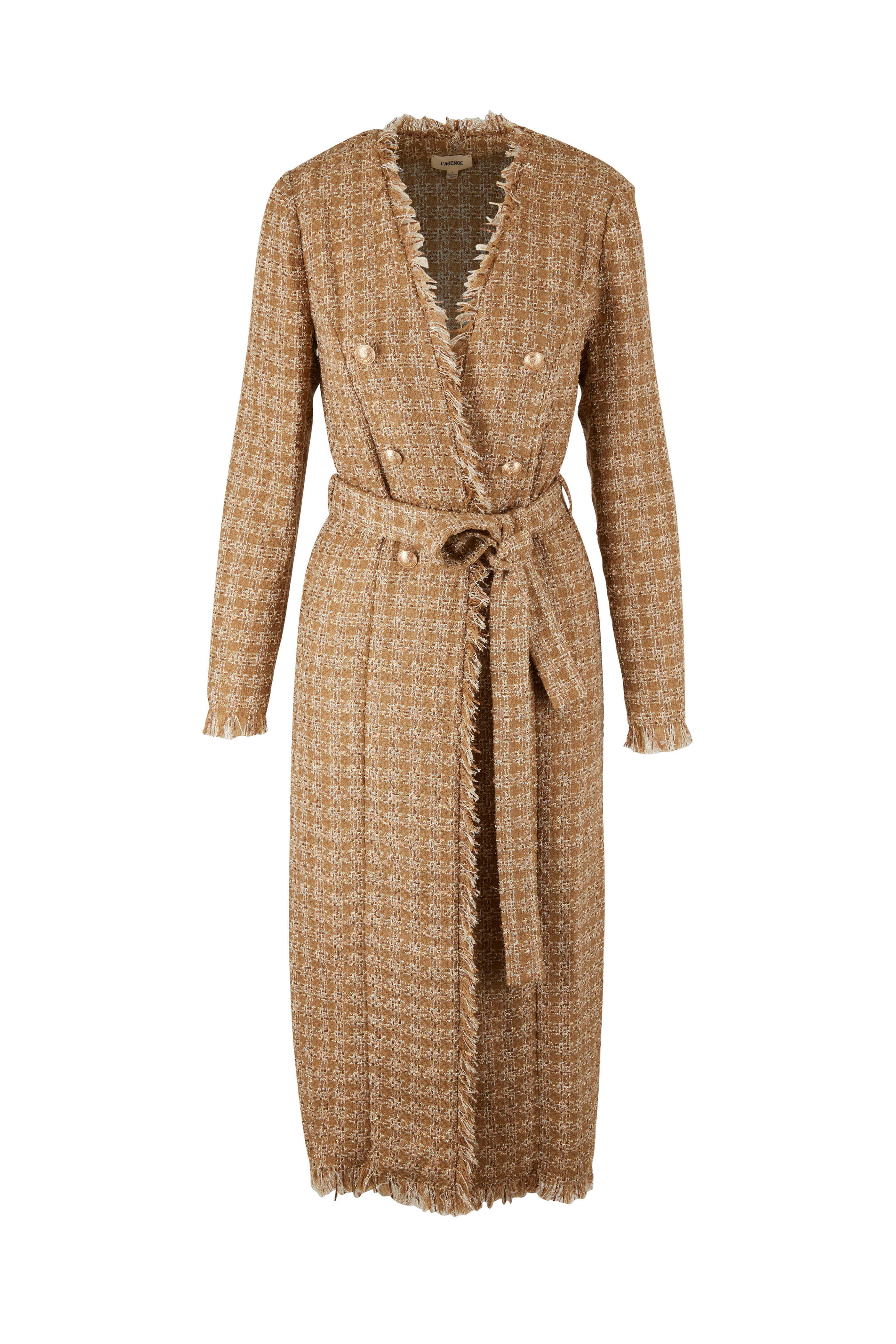 Open front. Decorative double breasted buttons. Removable self-tie. Fringe trim. Imported. 80% polyester, 20% acrylic. Dry clean.