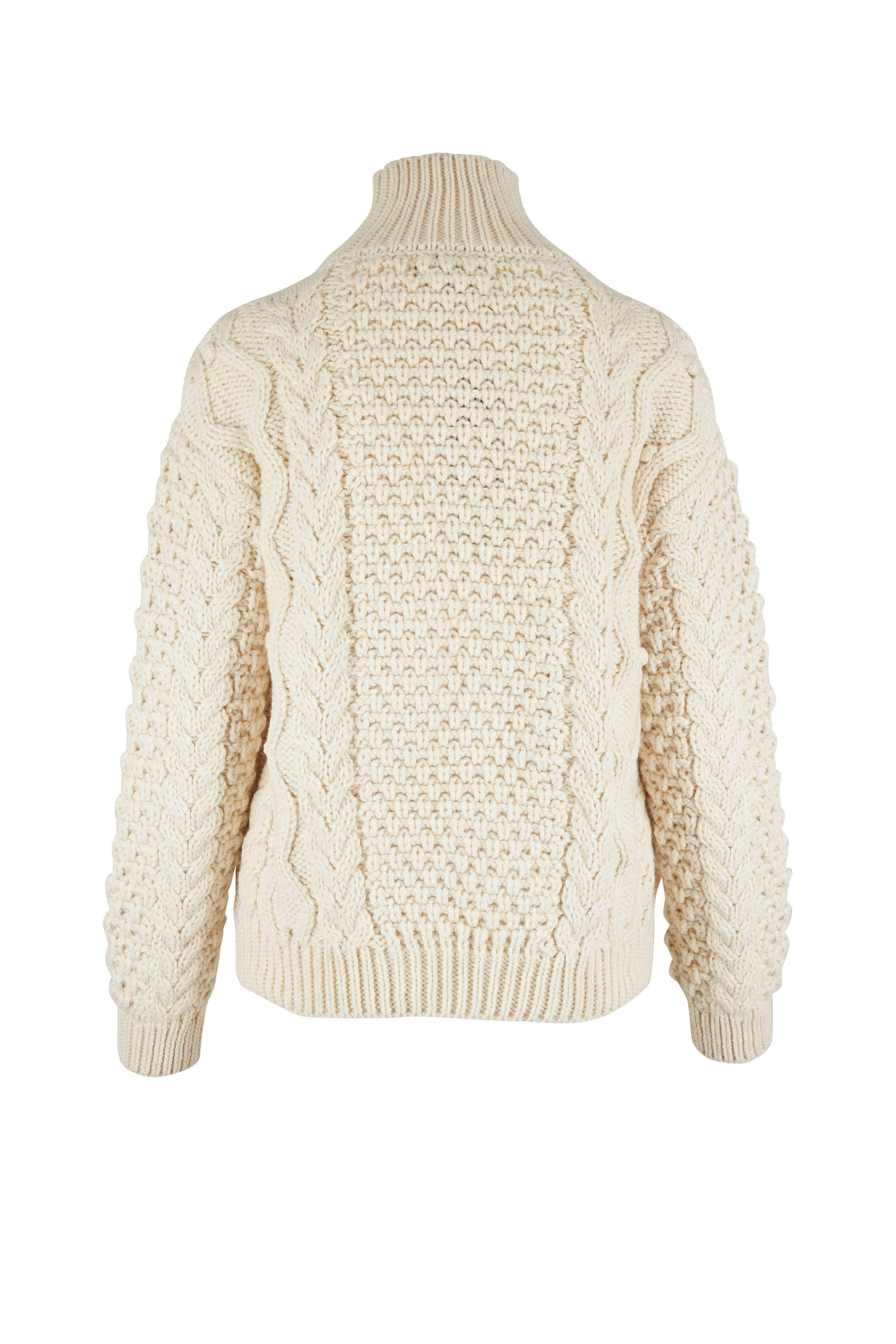 Mockneck. Contrast ribbed trim. Made in Peru. 100% wool. Dry clean.