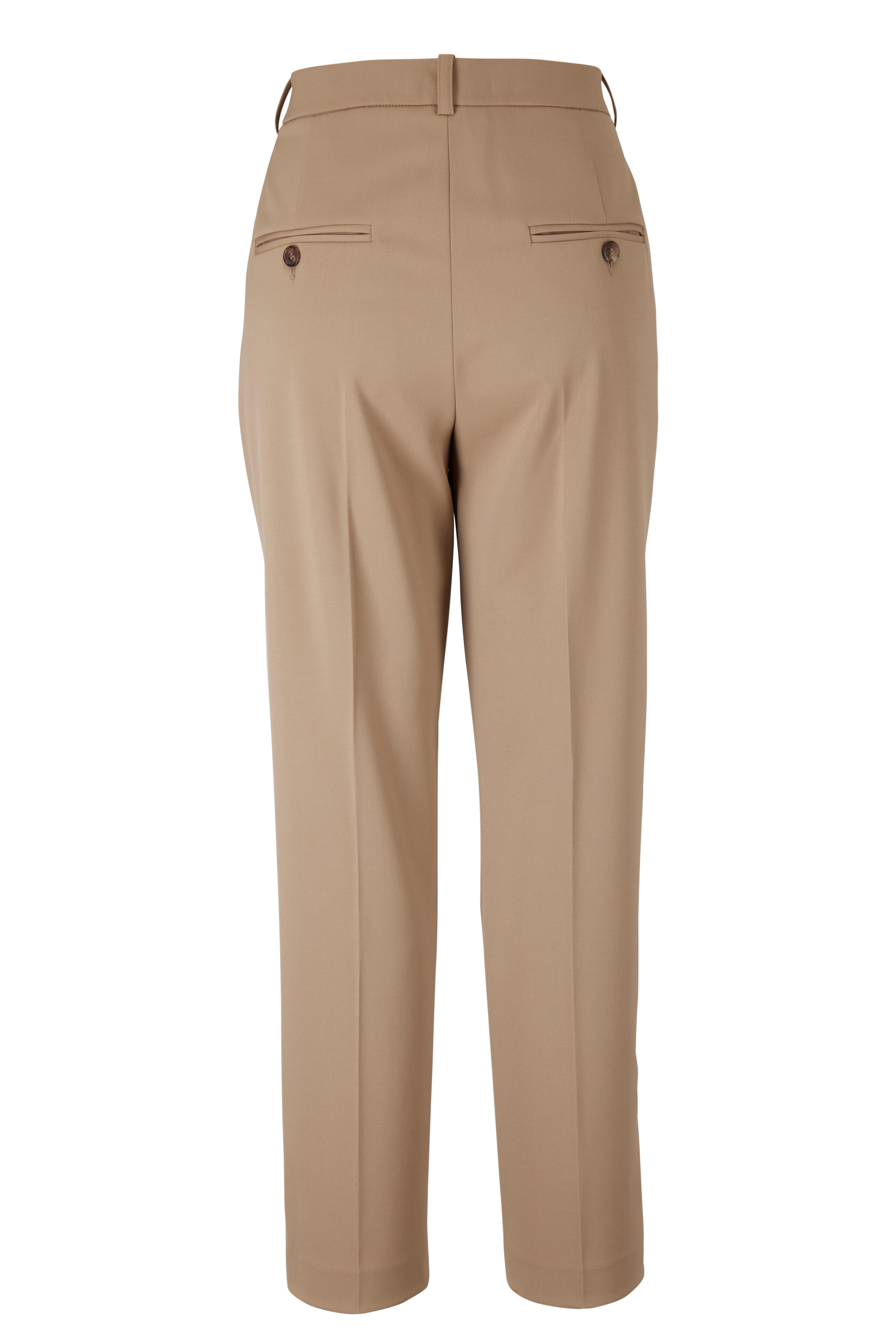 Banded waist; belt loops. Front slip pockets, back button-besom pockets. Imported. Cropped. 27" inseam. 98% wool, 2% elastane; lined: 48% polyamide, 40% silk, 12% elastane. Dry clean.
