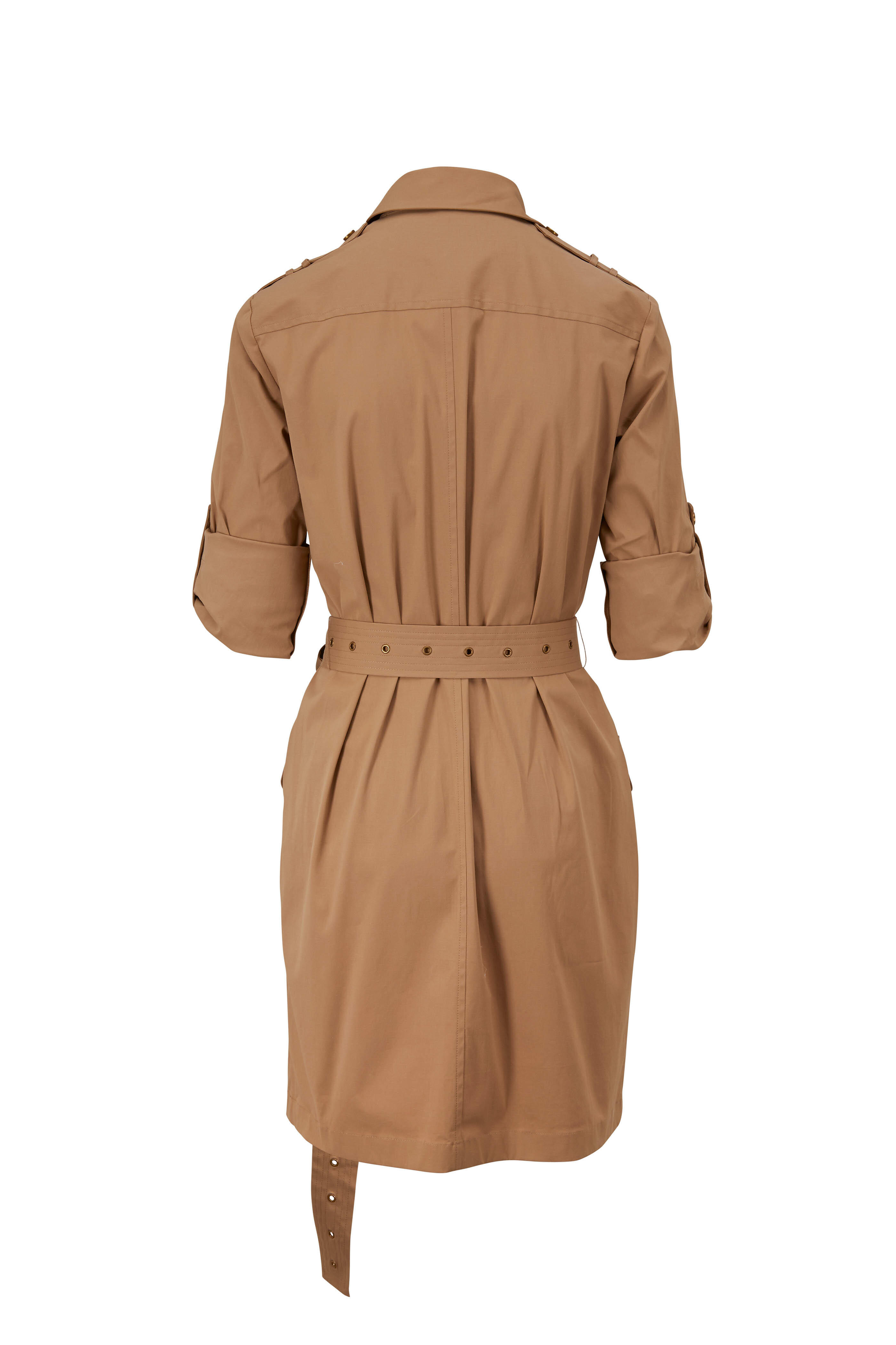 Spread collar. Front button placket; concealed front zip. Removable self-belt with grommet detailing. Single snap cuffs; option to roll up with snap fastening. Chest and lower snap flap pockets. Should epaulettes. Imported. Approx. 26" shoulder to hem. 96% organic cotton, 4% elastane. Dry clean.