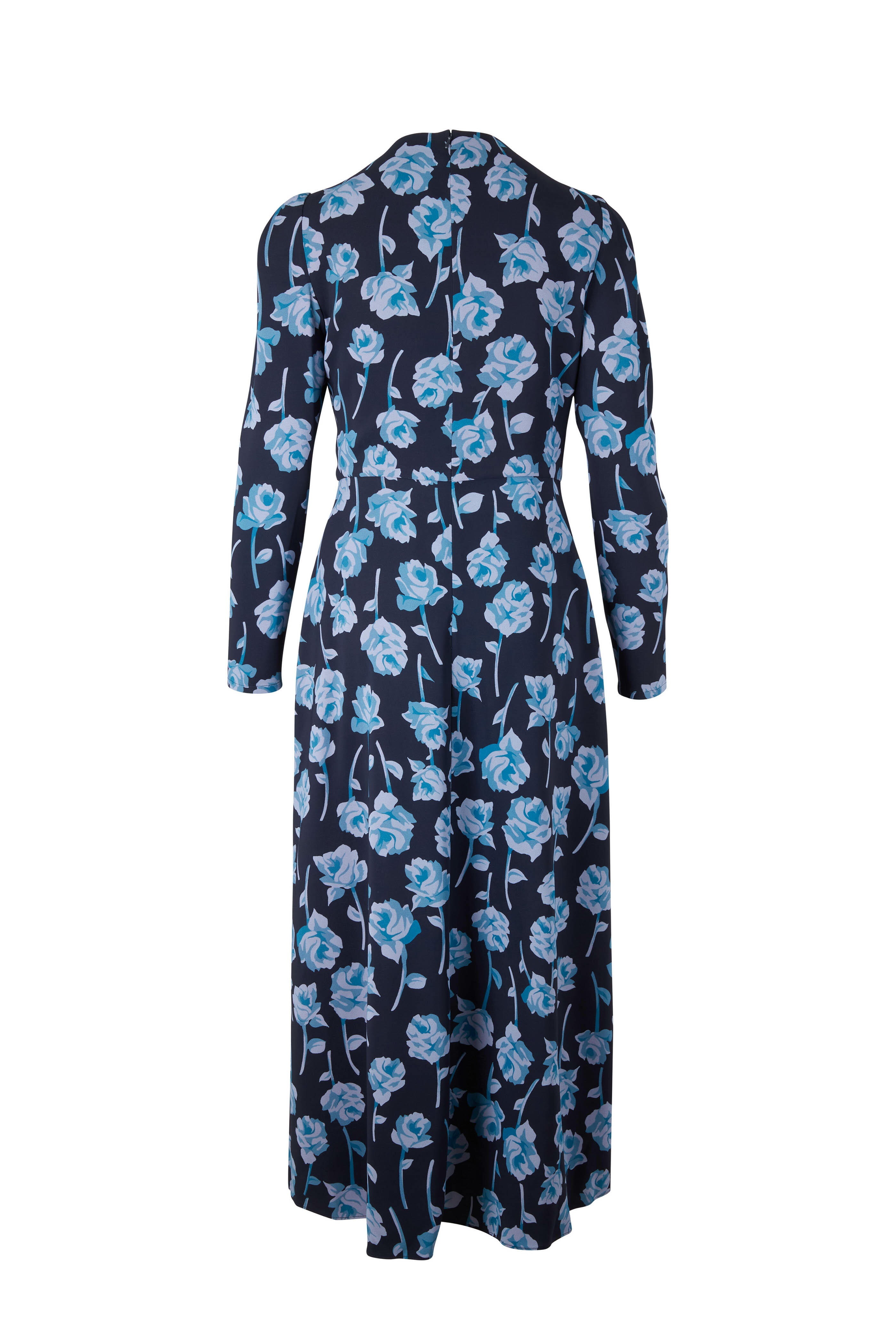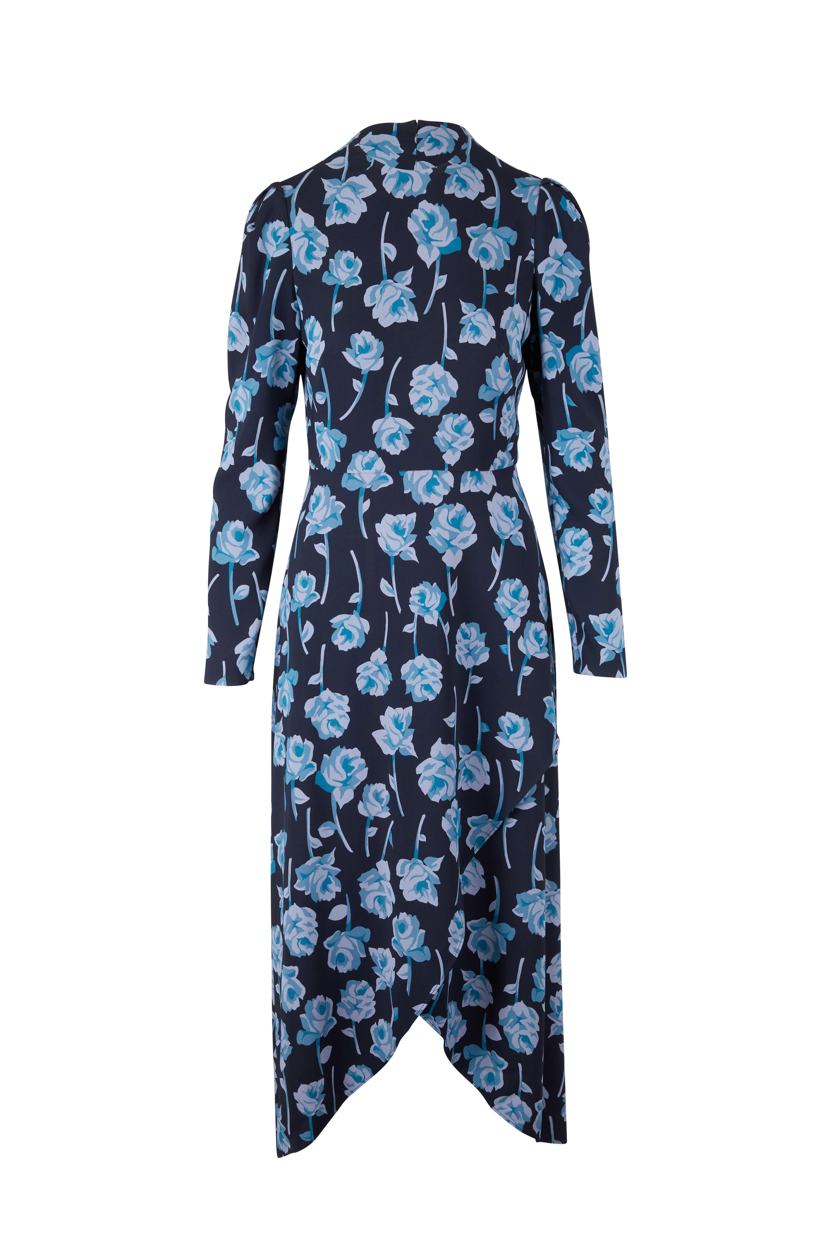 Crewneck. High-low hem. Long sleeves. Concealed back zip. Made in USA. Midi length. 54" shoulder to hem. 96% viscose, 4% elastane; lined: 100% polyester. Dry clean.