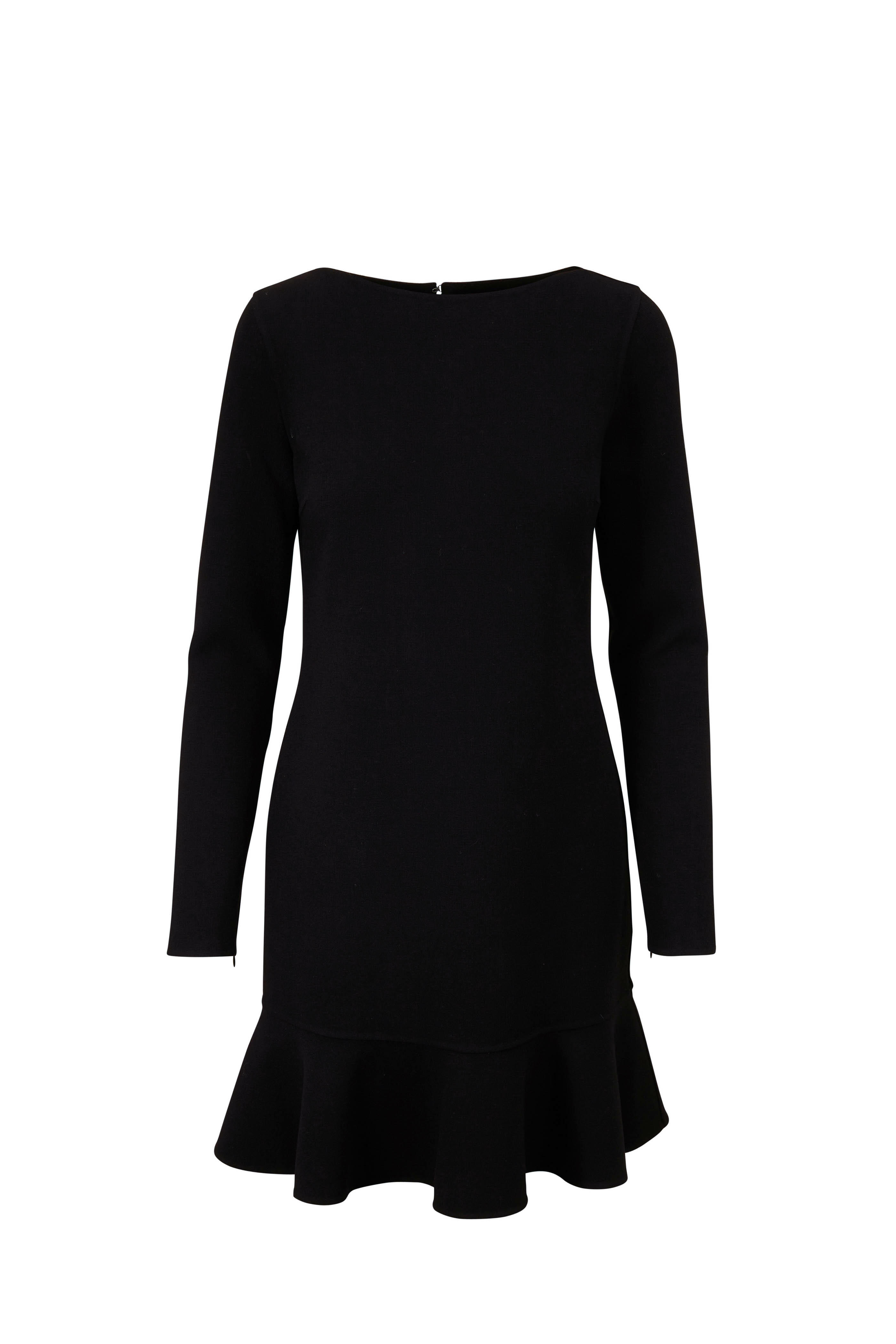 Bateau neckline. Concealed back zip. Flounce hem. Made in Italy. 35" shoulder to hem. 68% fleece wool, 28% rayon, 4% elastane. Dry clean.