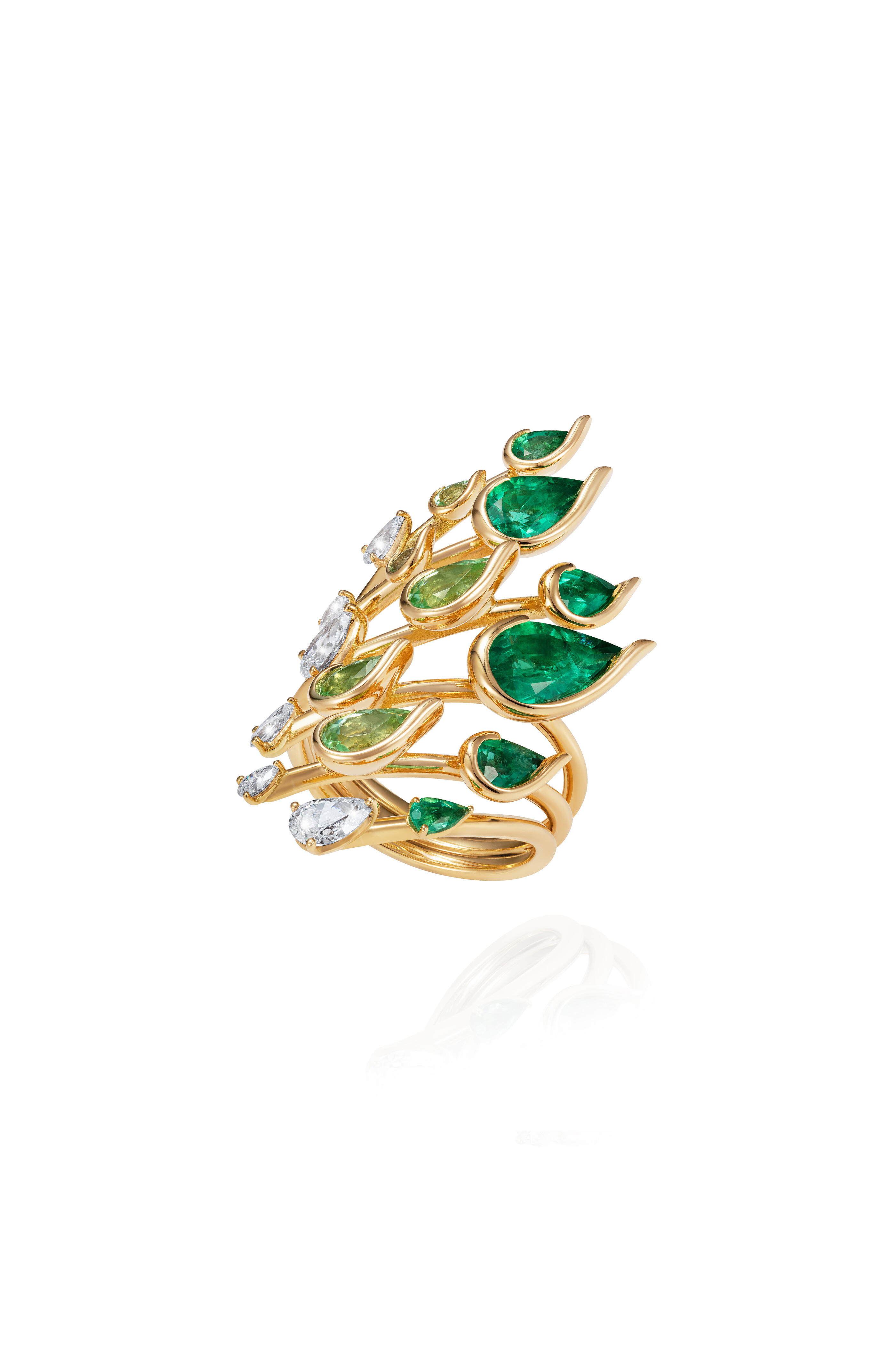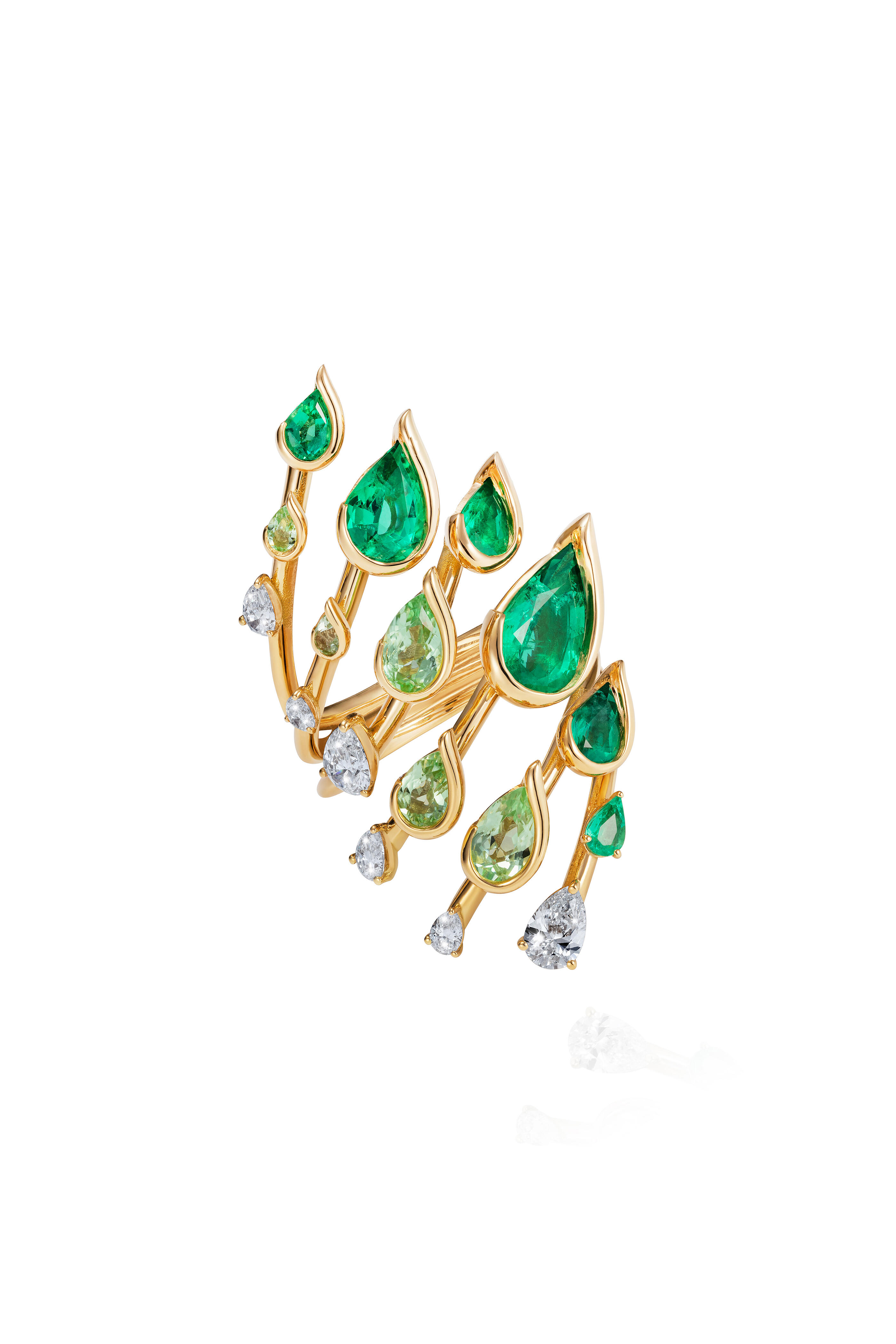 18K yellow gold. Diamond. Paraiba tourmaline. Emerald.