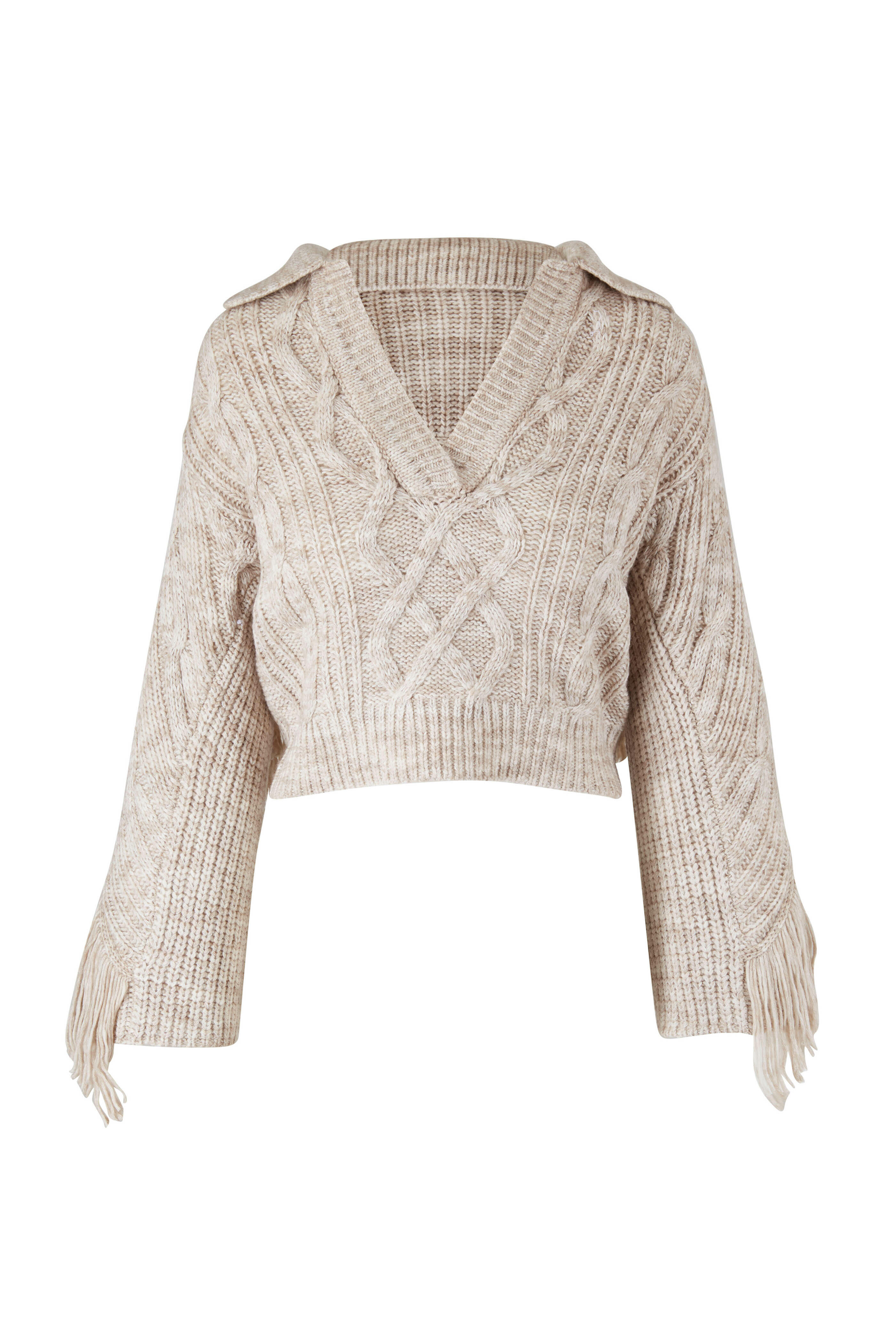 V-neckline. Fringe trim across sleeves and yoke. Imported. 58% wool, 42% cotton. Dry clean.