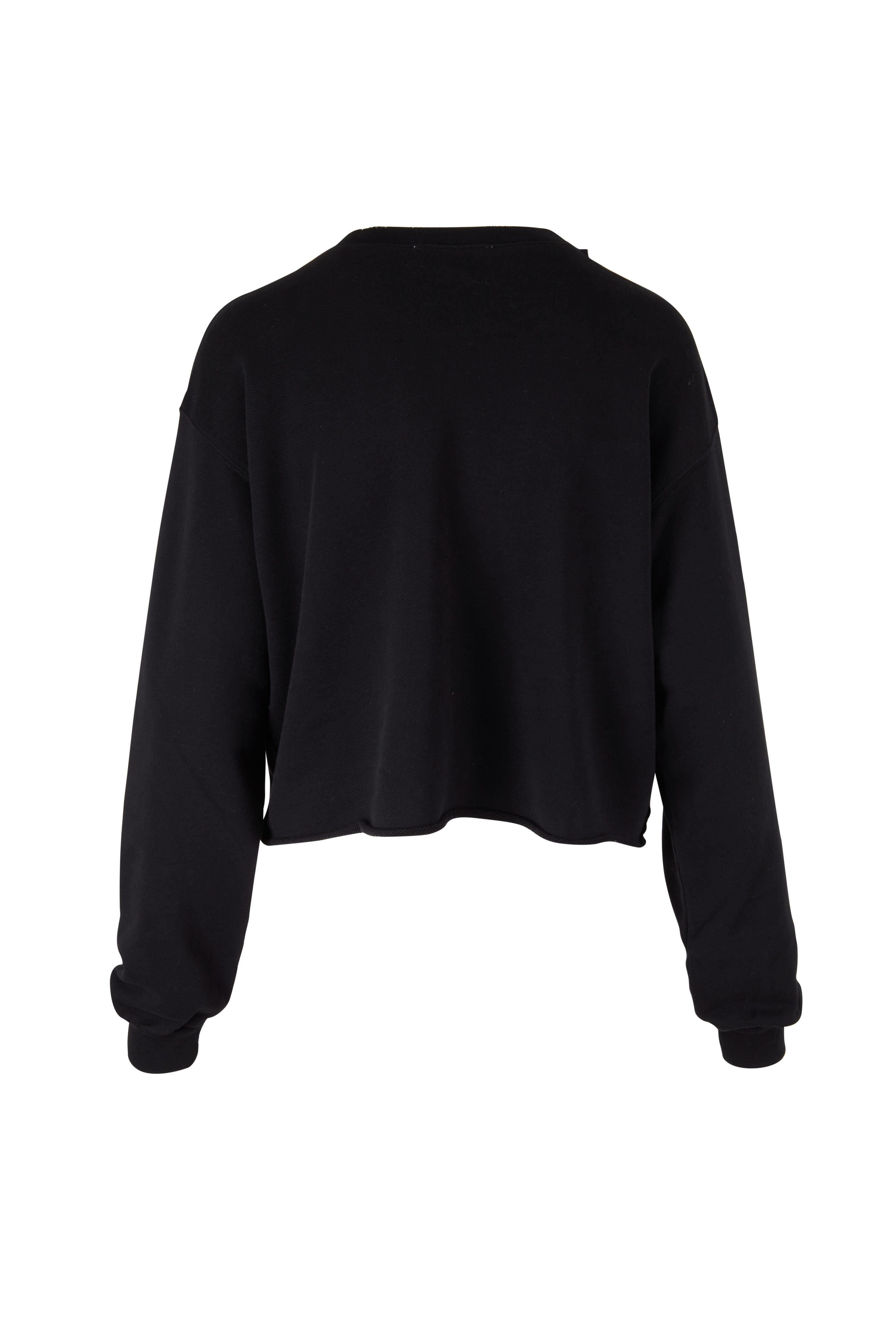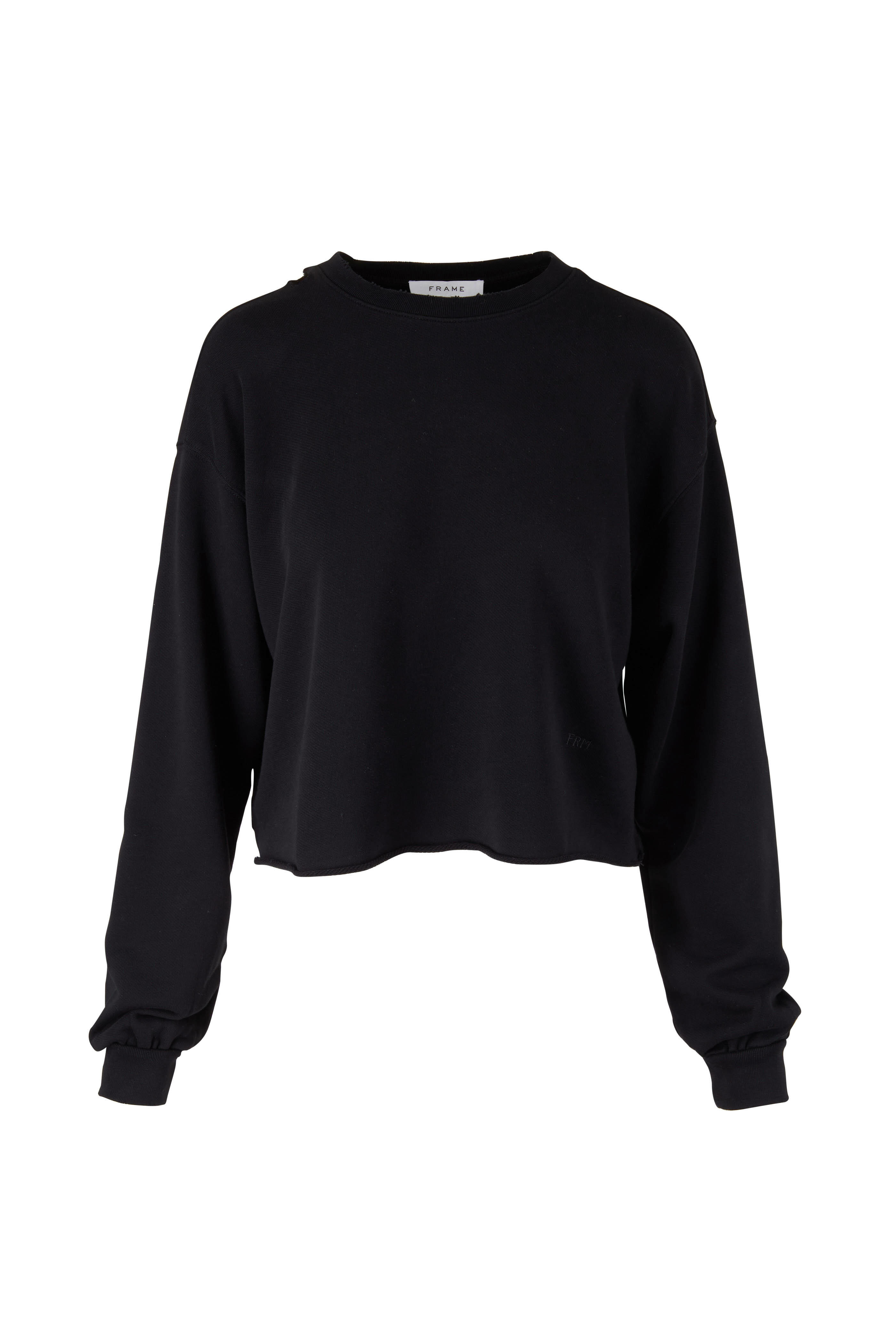 Crewneck. Banded cuffs. Destressed collar. Unfinished hem. Imported. Cropped. 100% pima cotton. Machine wash.