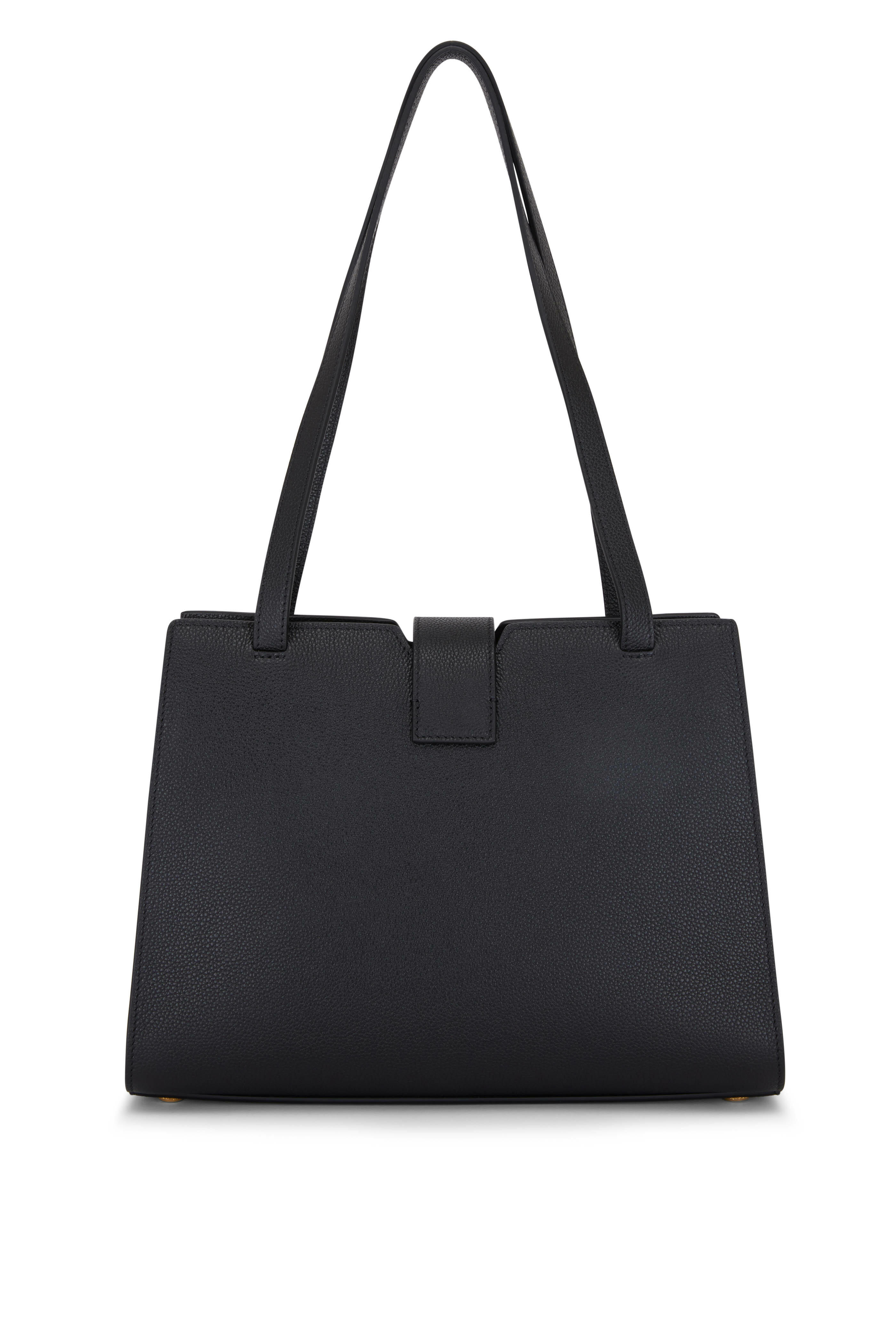 Grained leather. Dual top handles. Open top; magnetic snap closure. Signature T clasp. One interior zip pocket. Lined in textile. Protective metal feet. Made in Italy. Height: 9½". Width: 11". Depth: 3". Strap drop: 11".