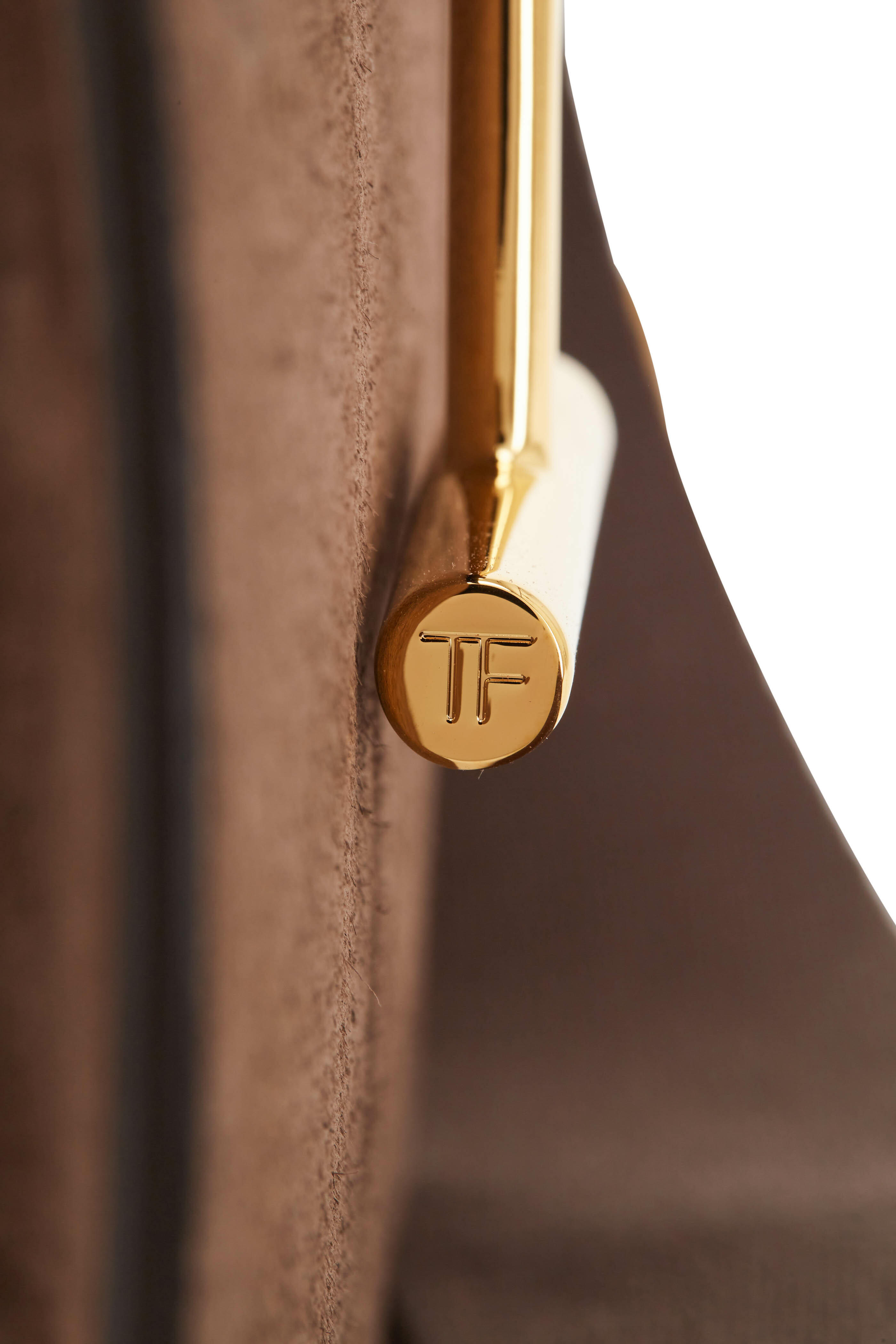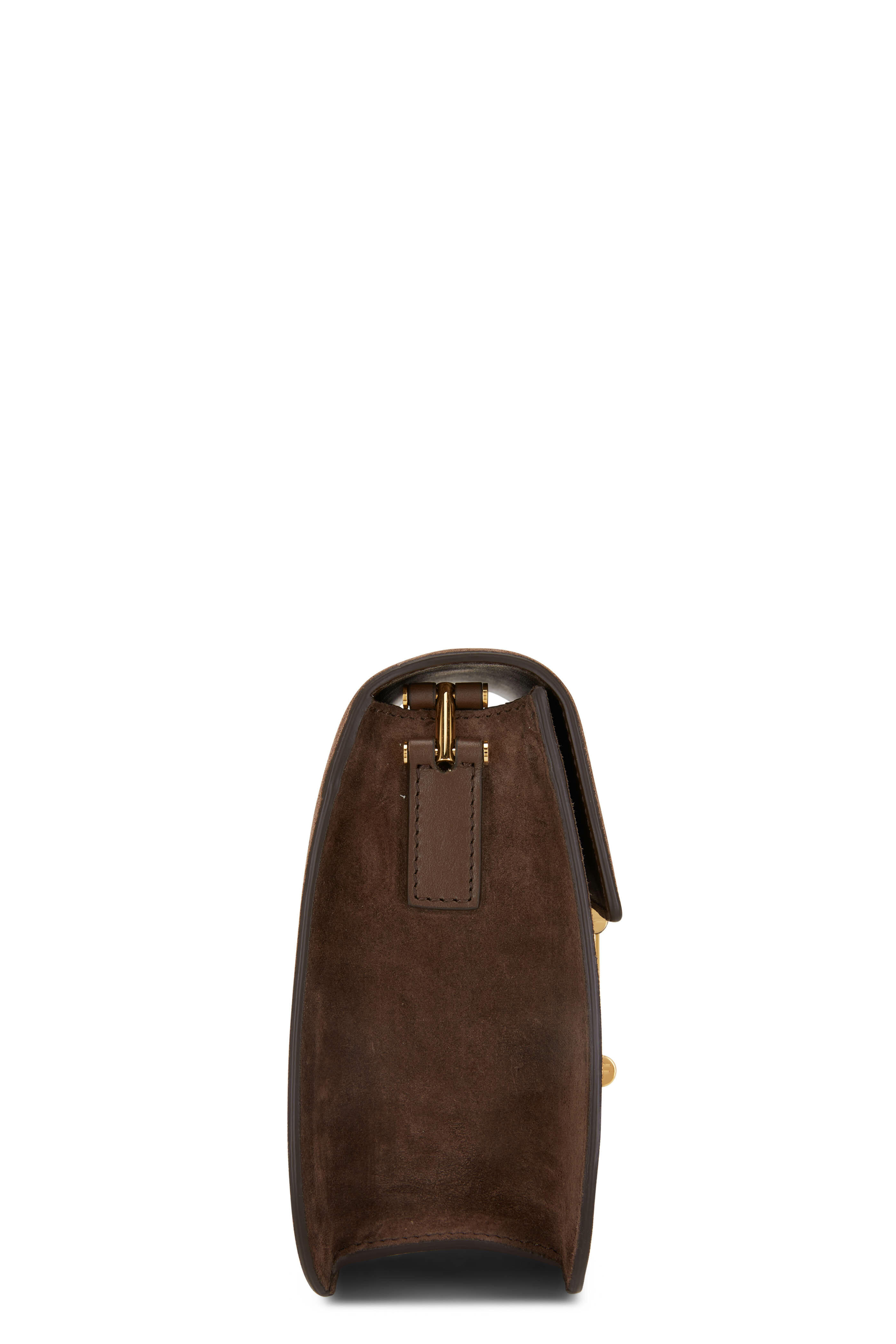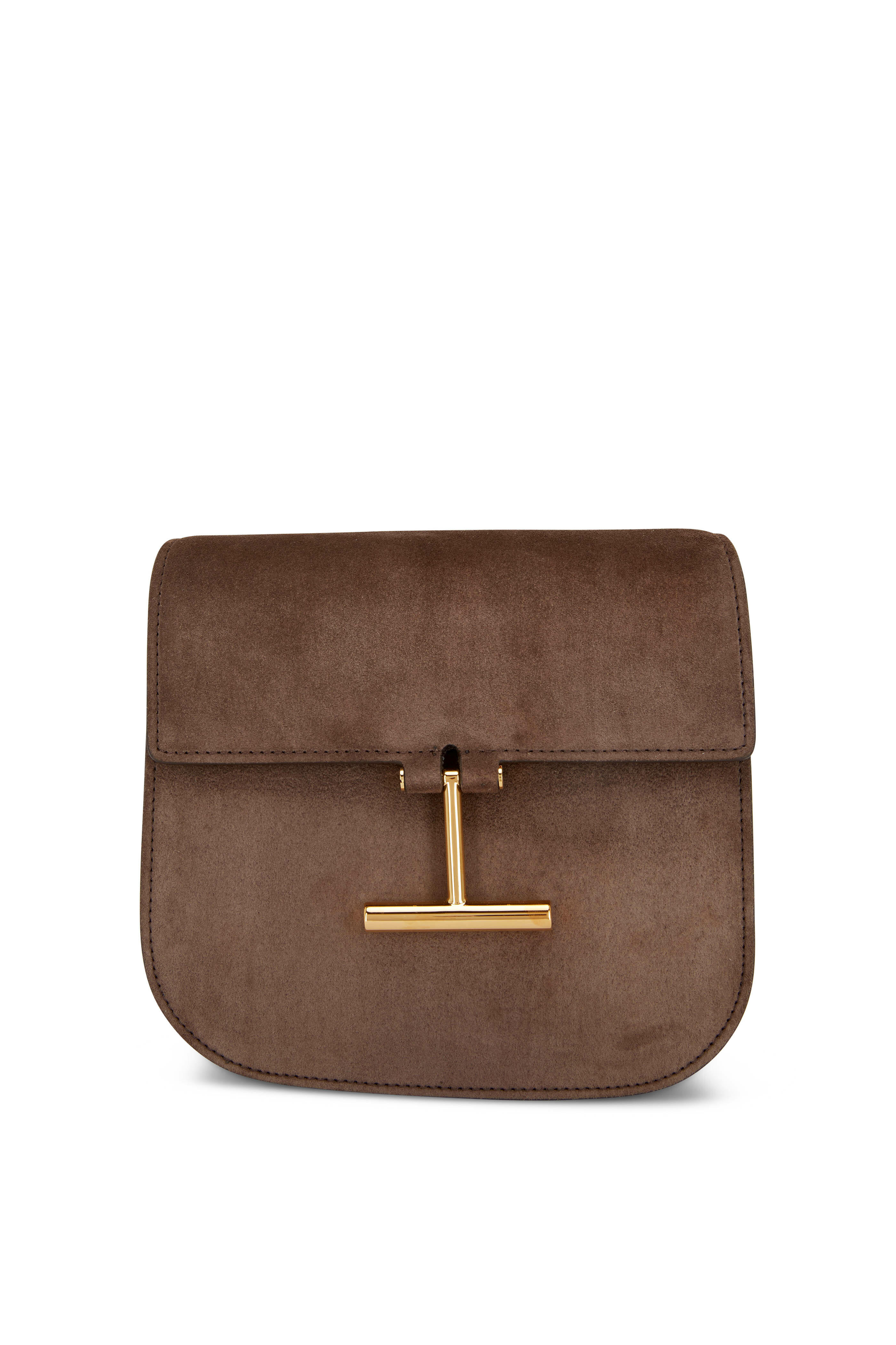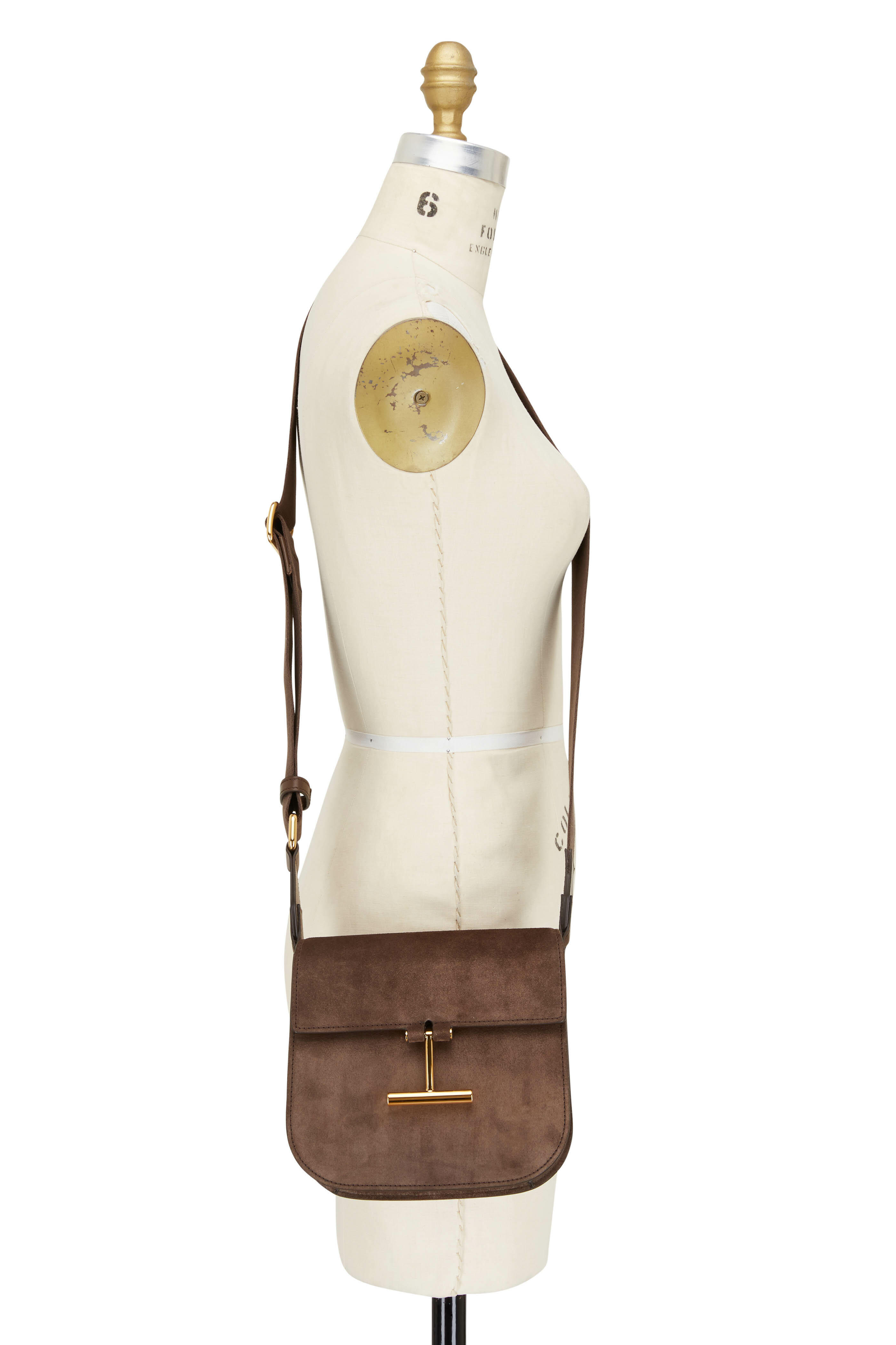 Suede. Adjustable nylon shoulder strap. Front front; magnetic snap closure. Signature gold-tone T clasp. Exterior back slip pocket. One interior zip pocket. Lined in leather. Made in Italy. Width: 8". Height: 7 ½". Depth: 3". Adjustable strap drop: 22".