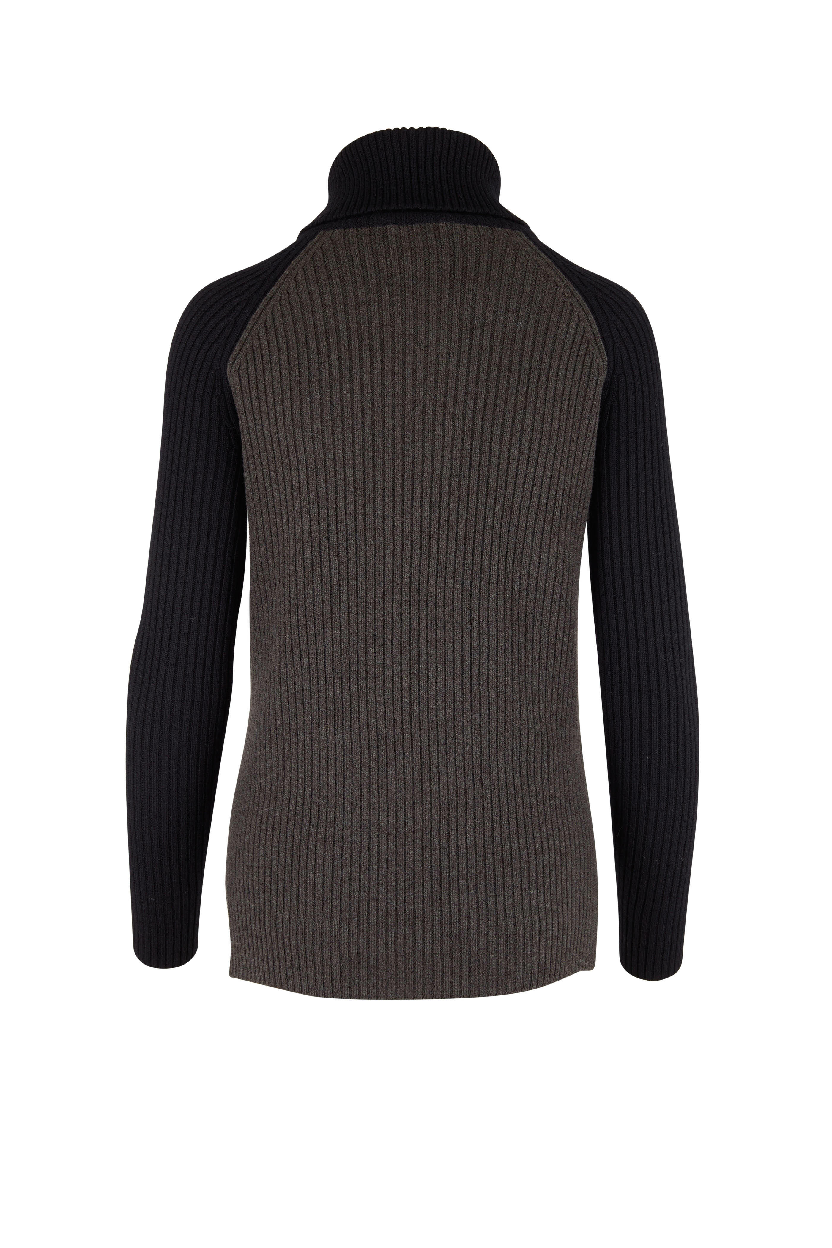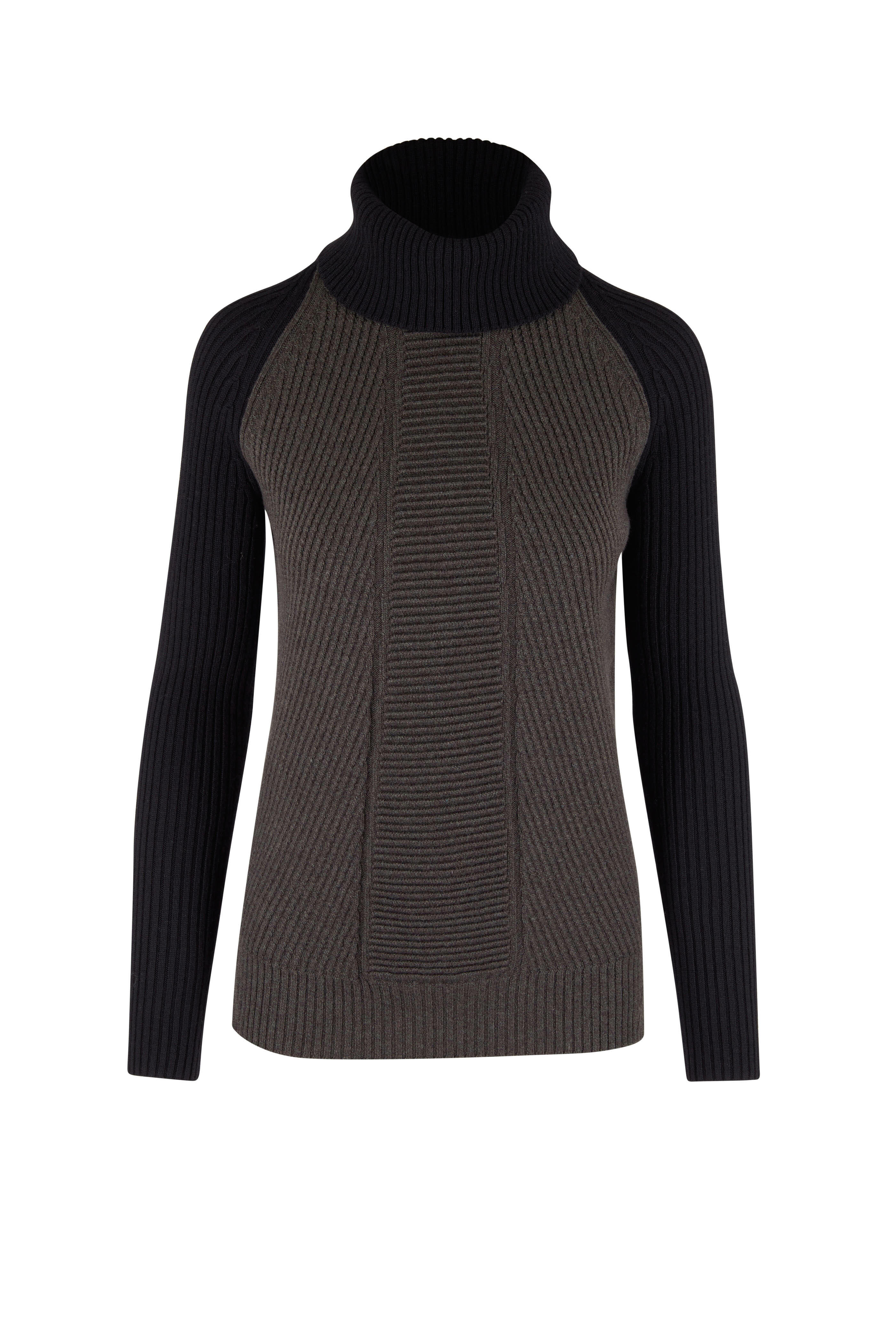 Turtleneck. Contrast raglan sleeves. Vented hem. Made in Italy. 70% extrafine wool, 20% silk, 10% cashmere. Hand wash.