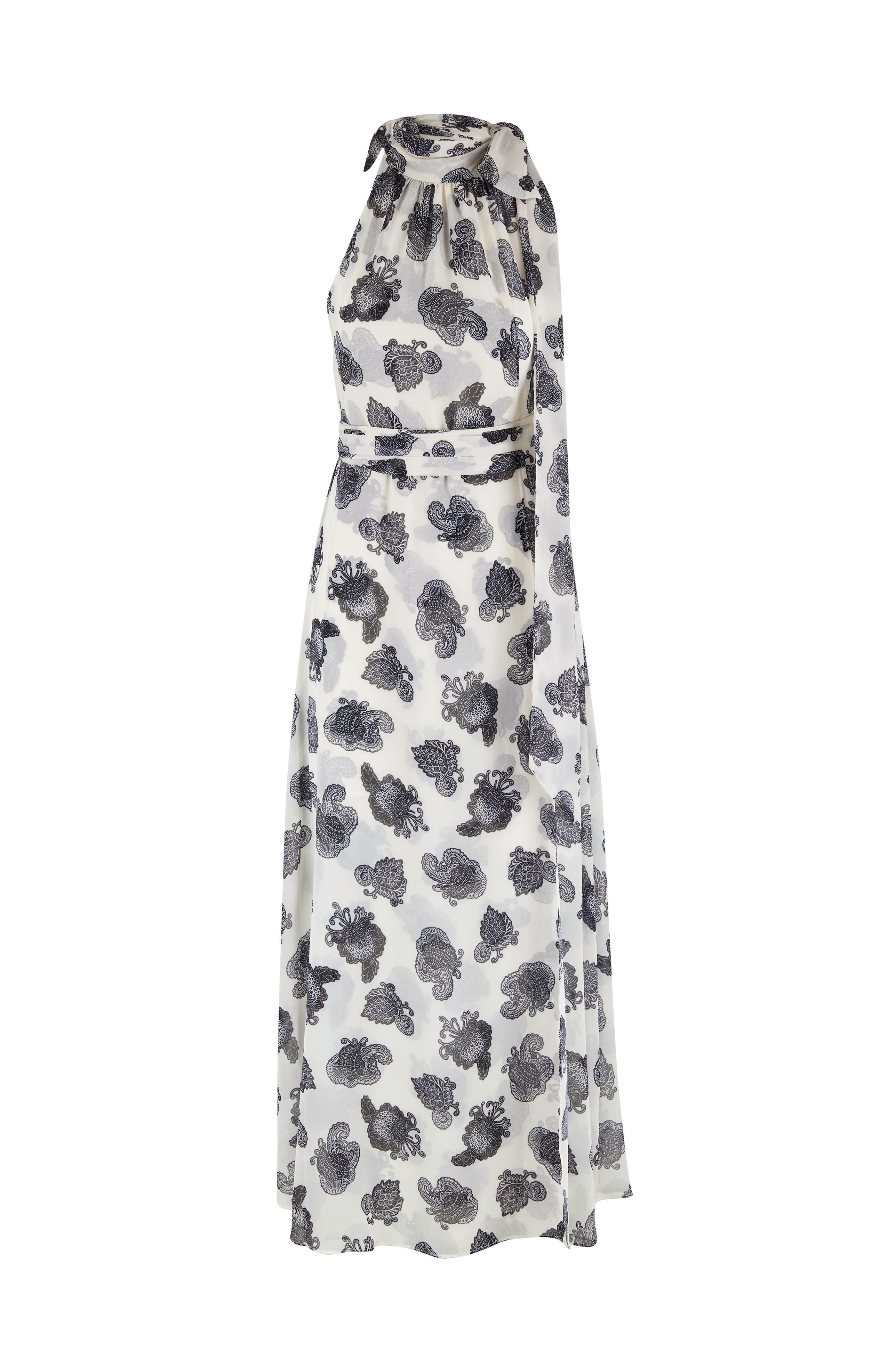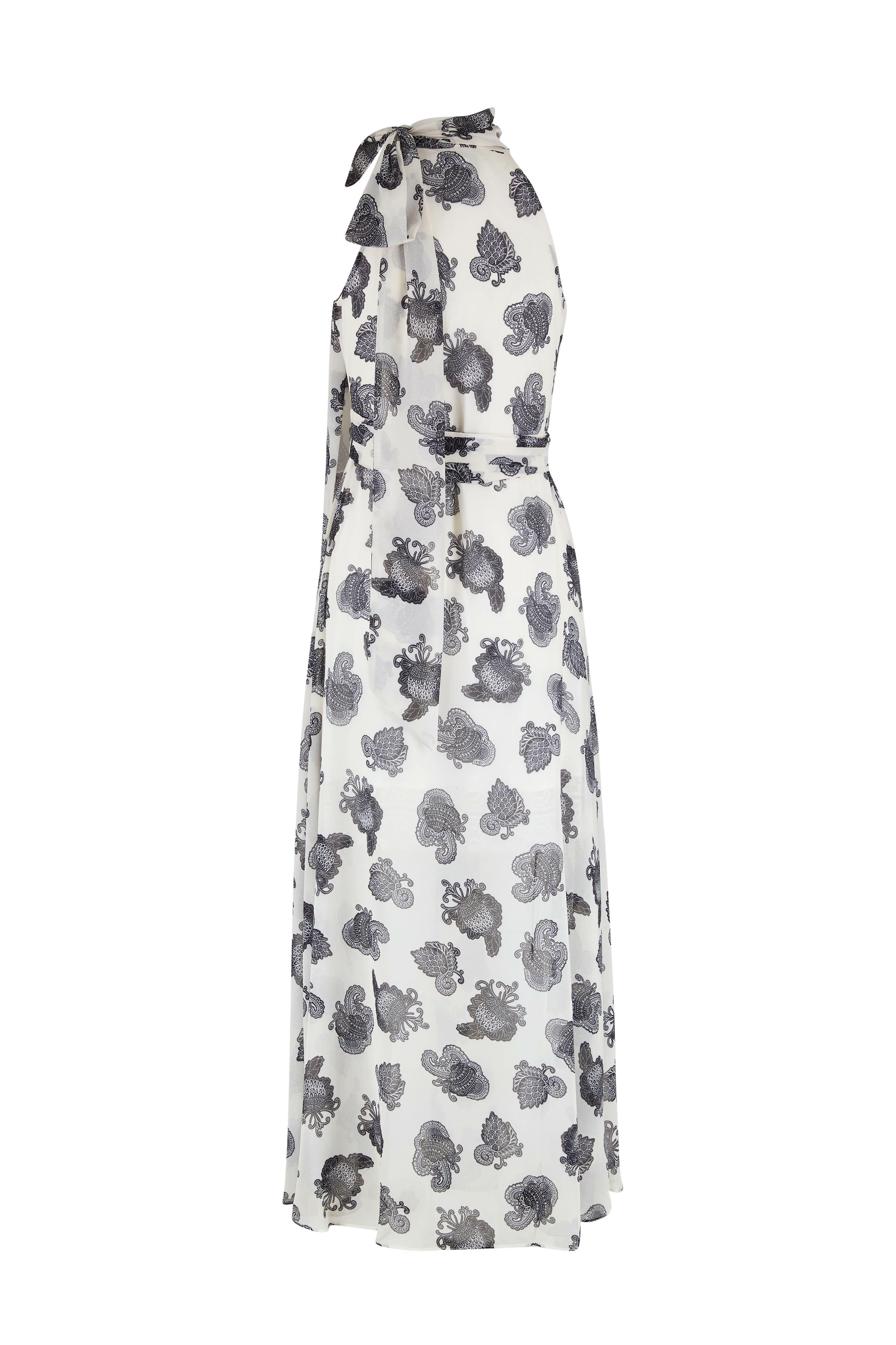 High, cowl neckline with self-tie. Concealed side zip. Banded waist. Back slit hem. Imported. 100% polyester. Dry clean.