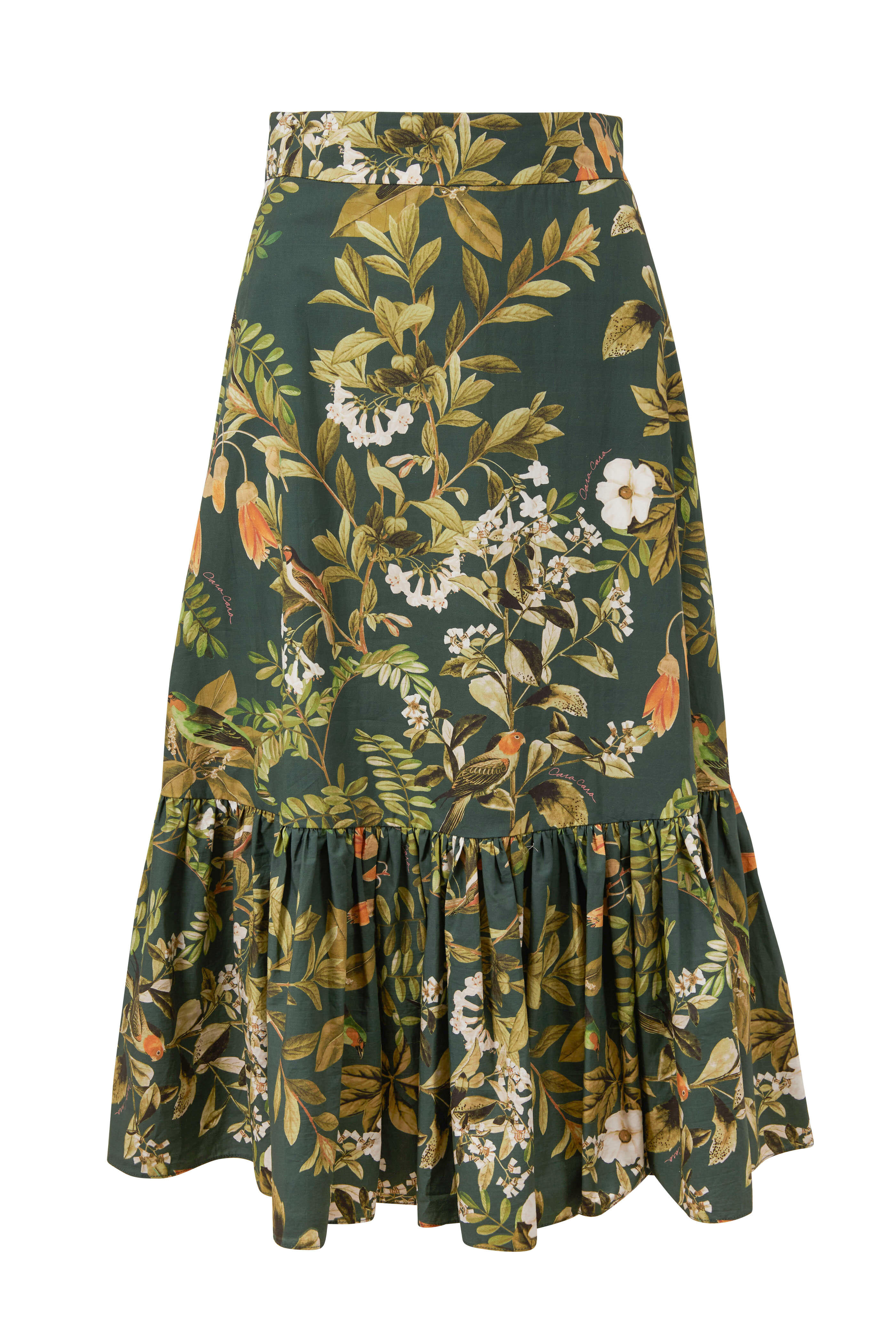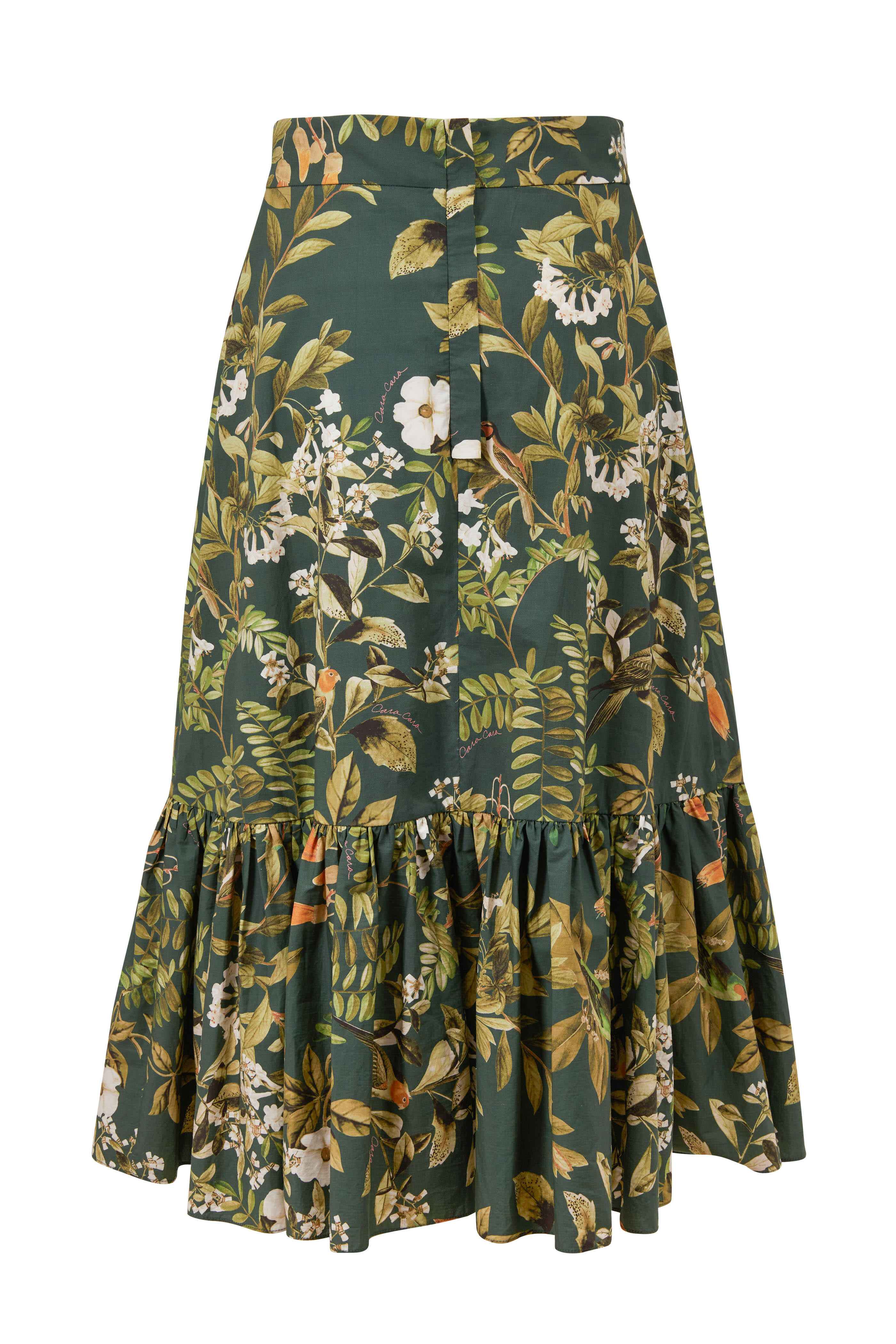 Banded waist. Concealed back zip. Flounce hem. Imported. Mid-calf length. 100% cotton. Dry clean.