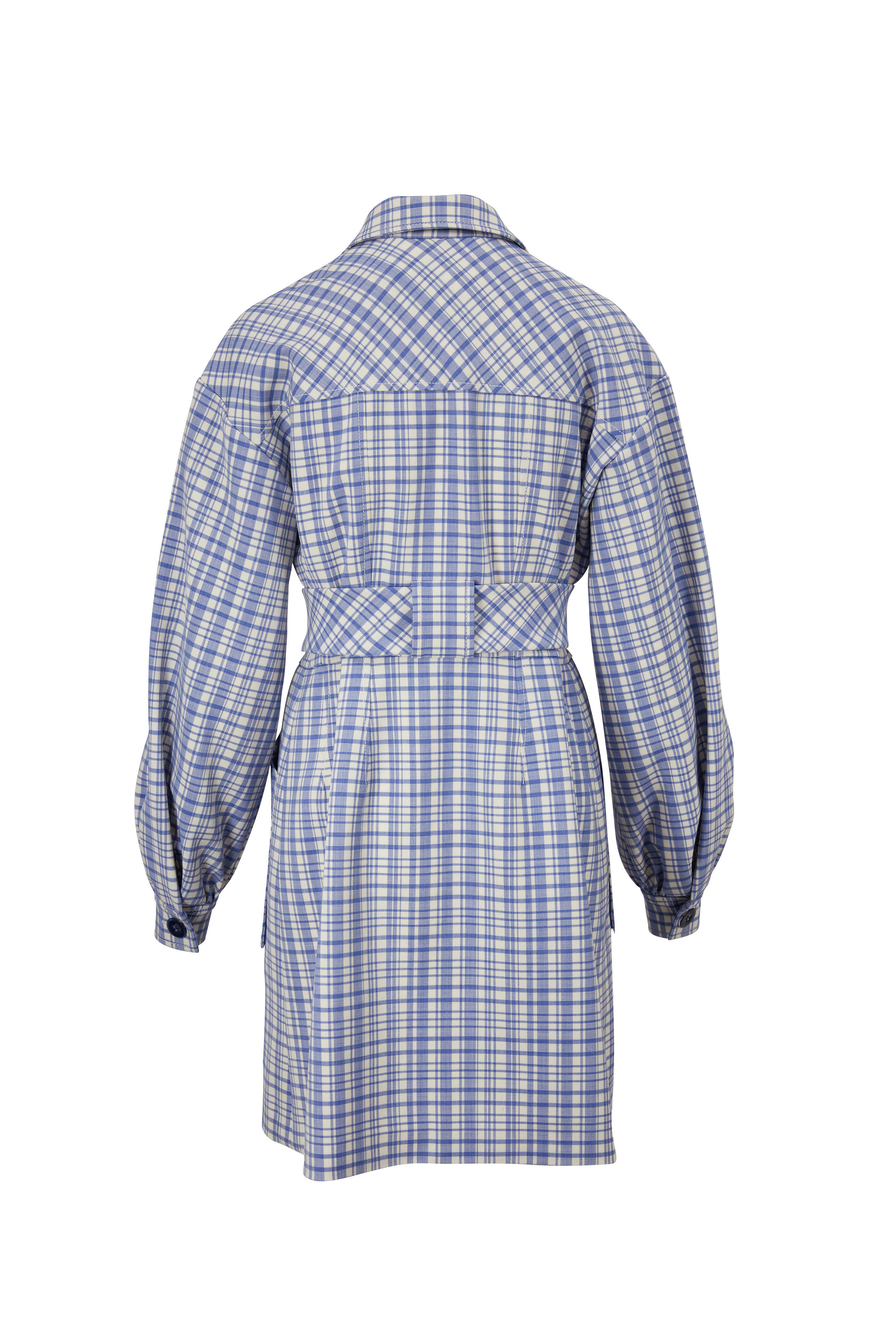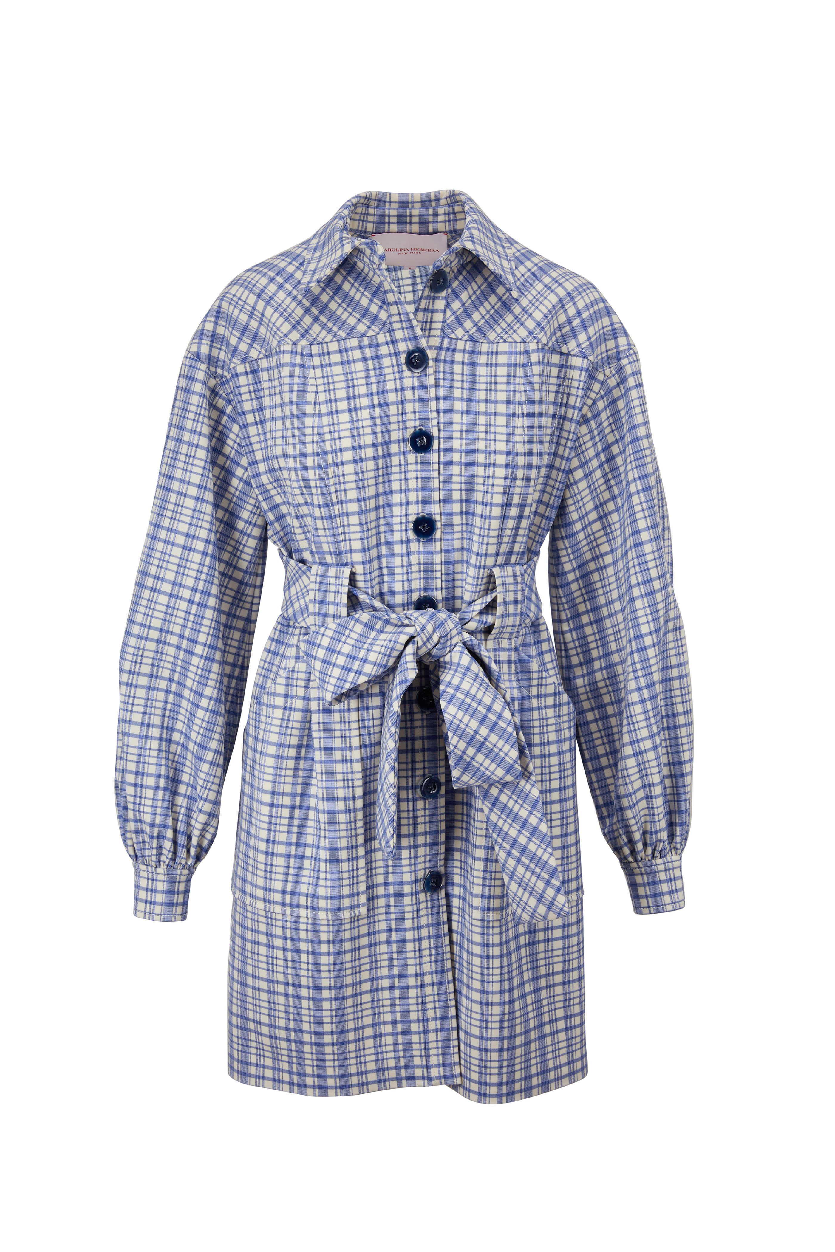 Button down front. Blouson sleeves. Spread collar. Tie at waist. Front patch pockets. Made in USA. 35" shoulder to hem. 98% virgin wool, 2% elastane. Dry clean.