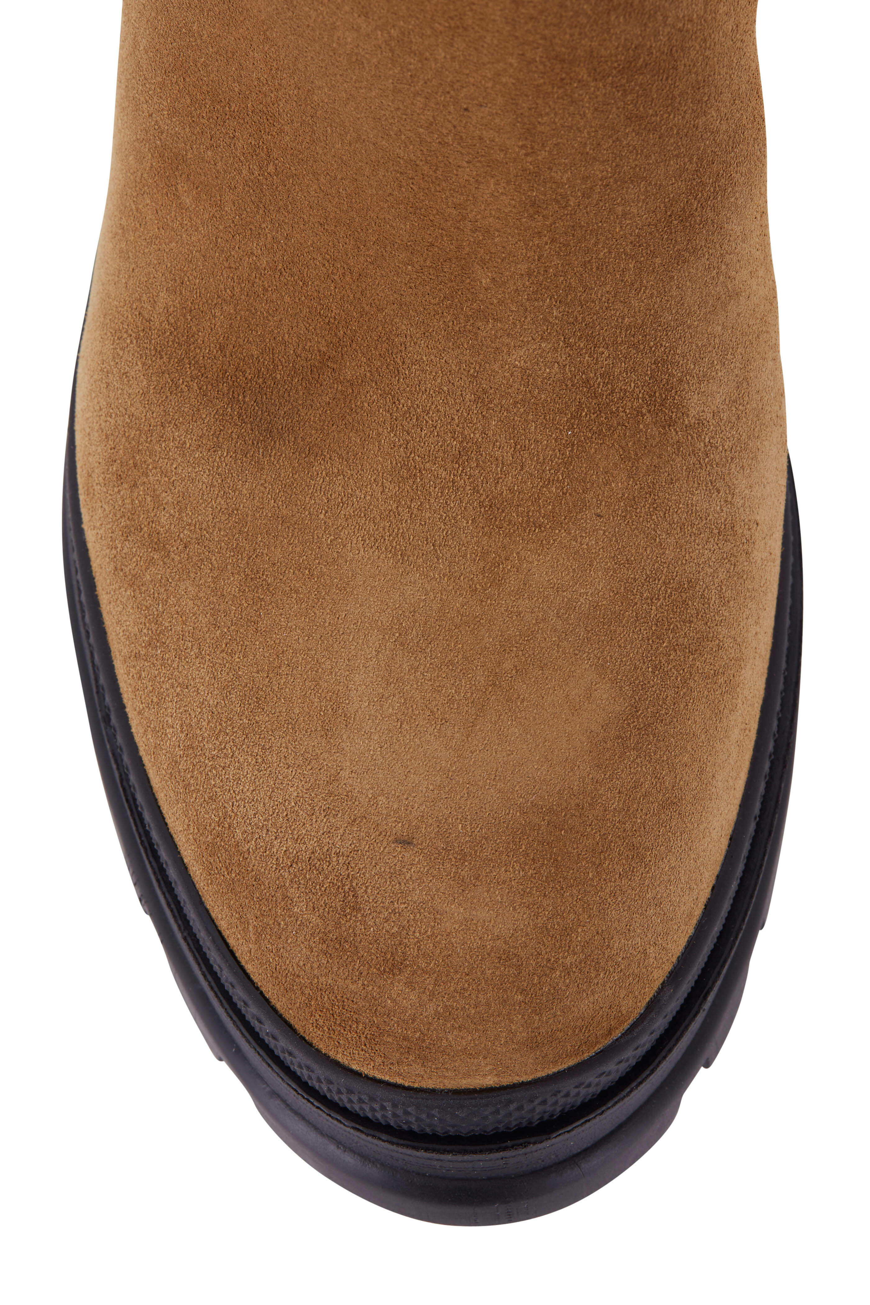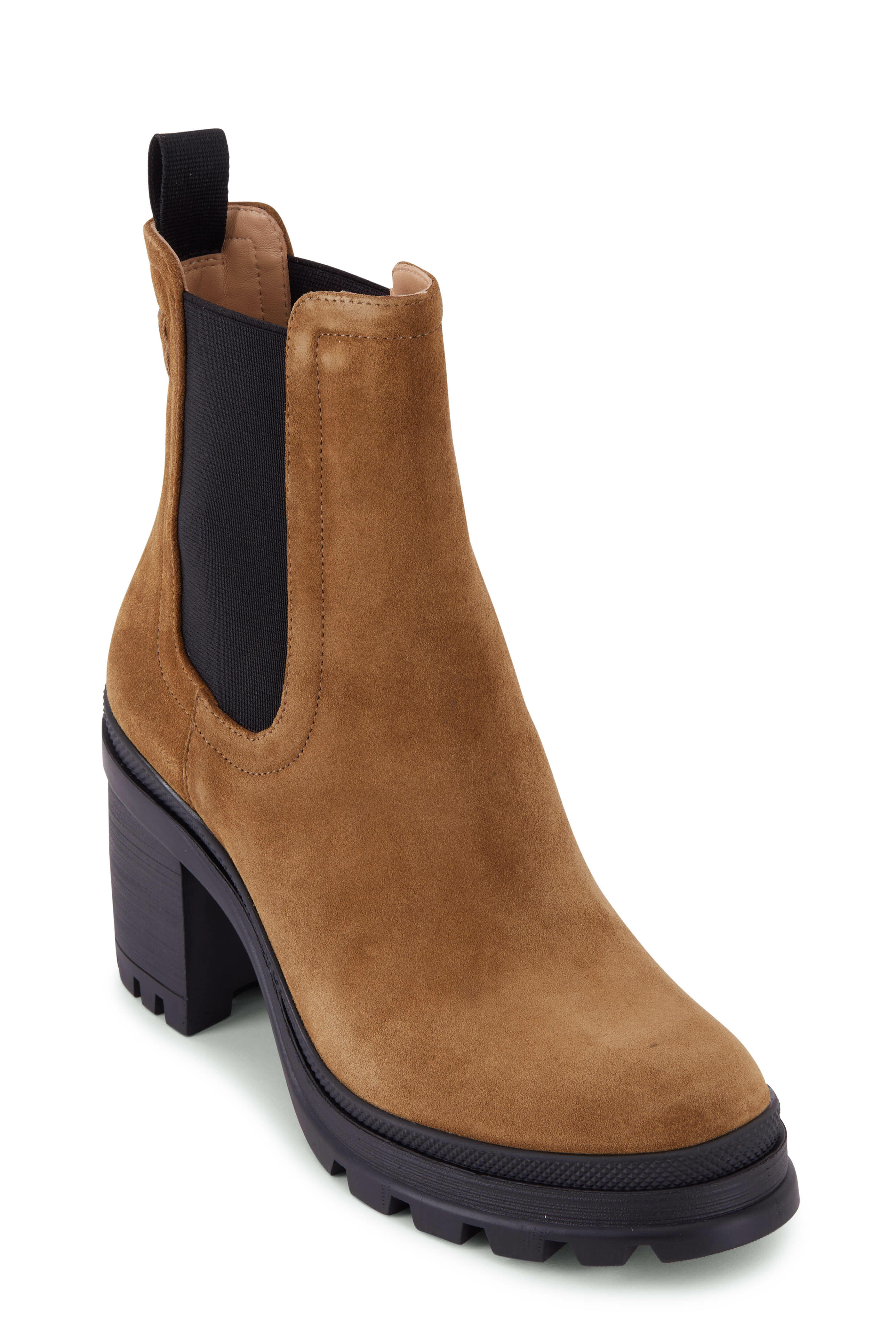 Suede upper. Round toe. Pull-on style. Back pull tab. Double side gores. Leather lining and insole. Rubber lug sole. Water repellent. Imported. Heel measurement: 50mm (about 2").