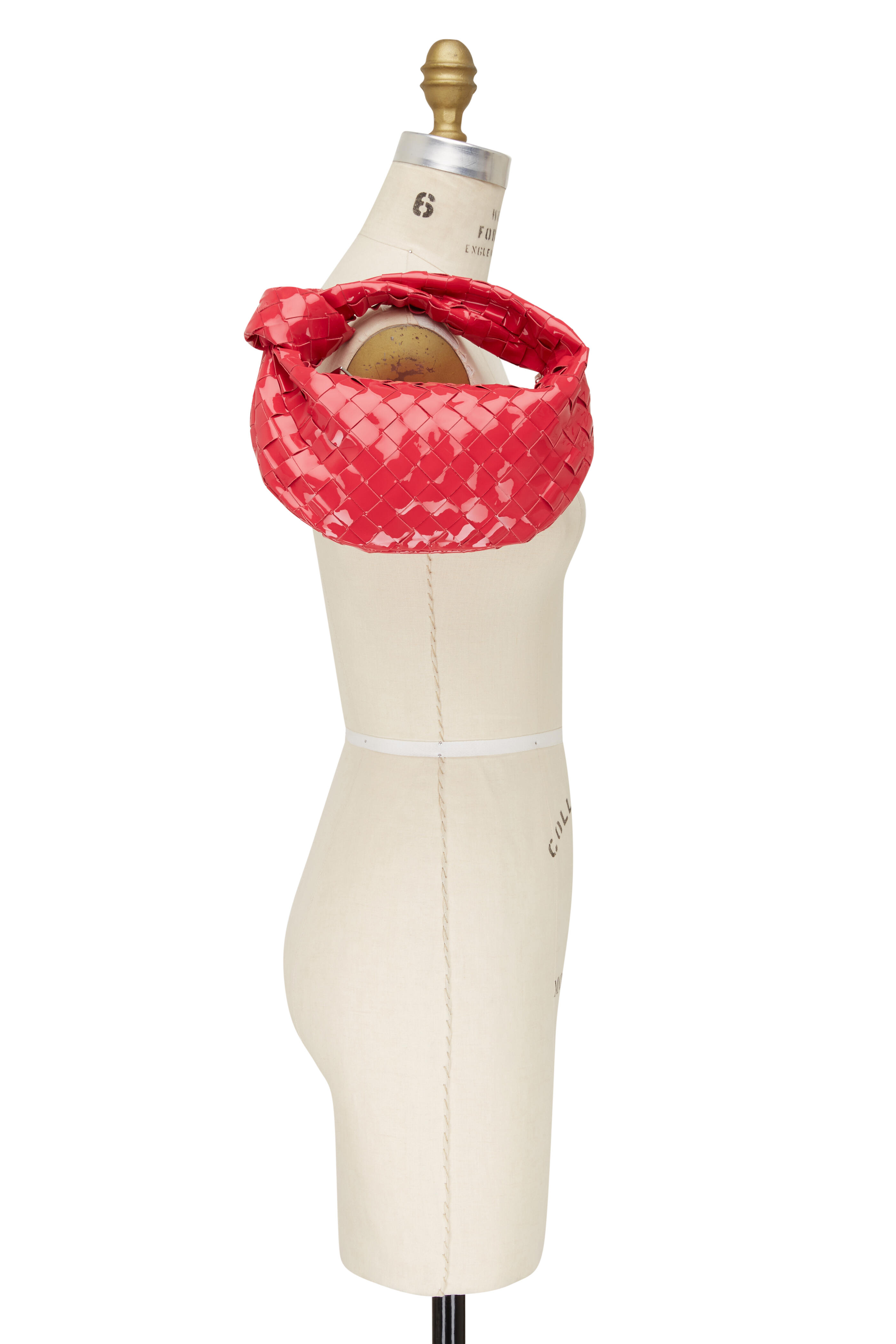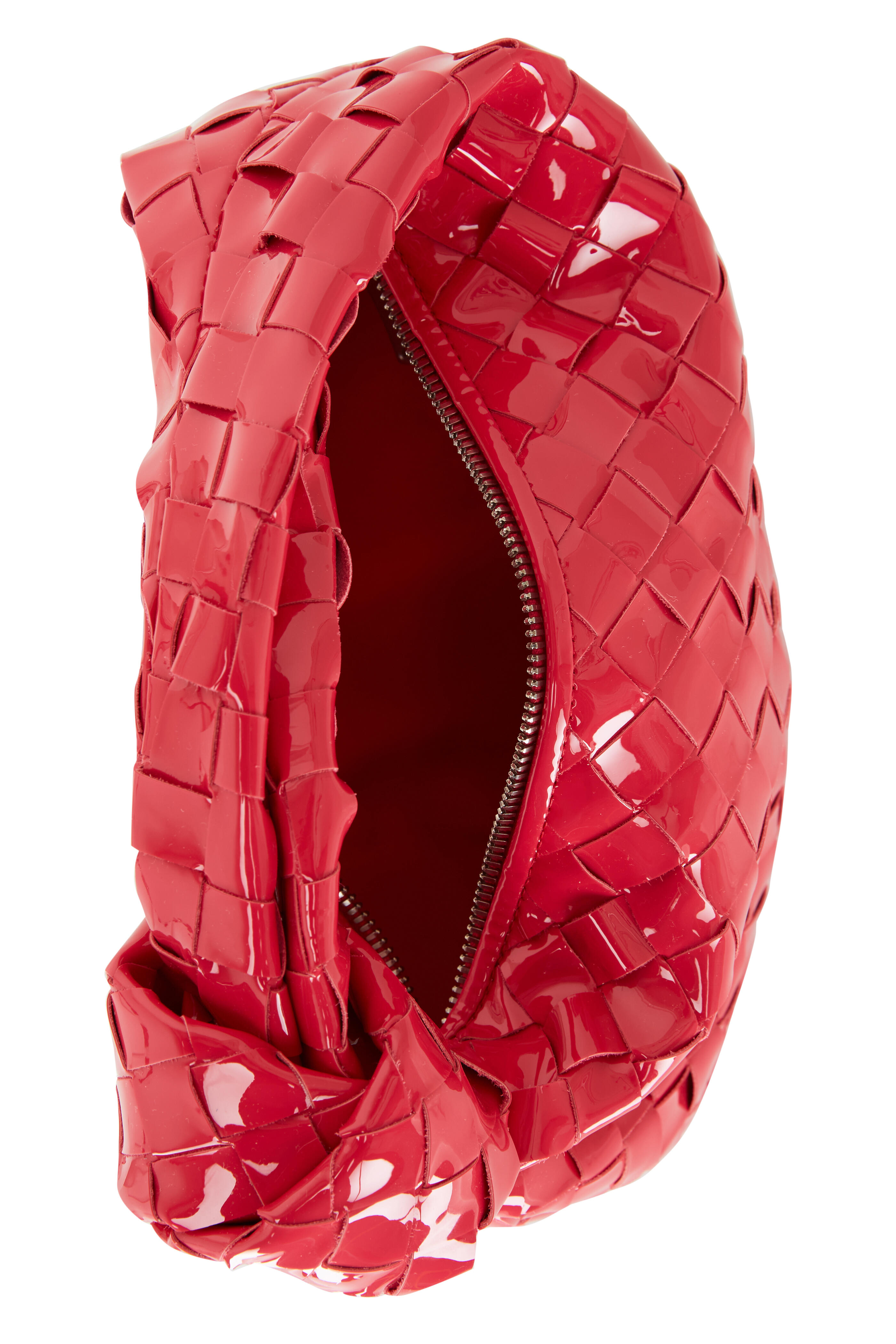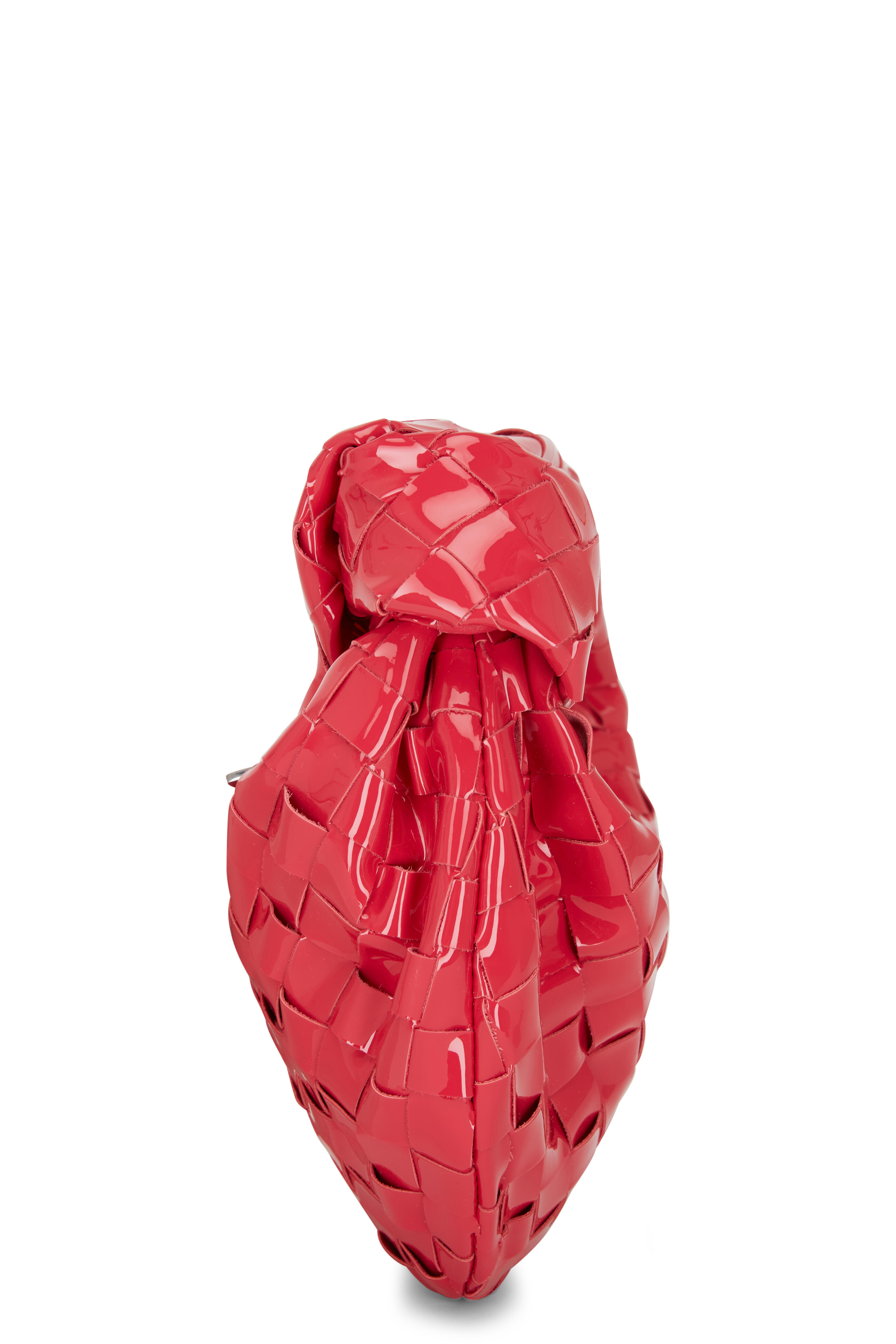 Woven patent leather. Twisted and knotted top handle. Top zip closure. Made in Italy. Width: 10". Height: 5". Depth: 6". Handle drop: 5".