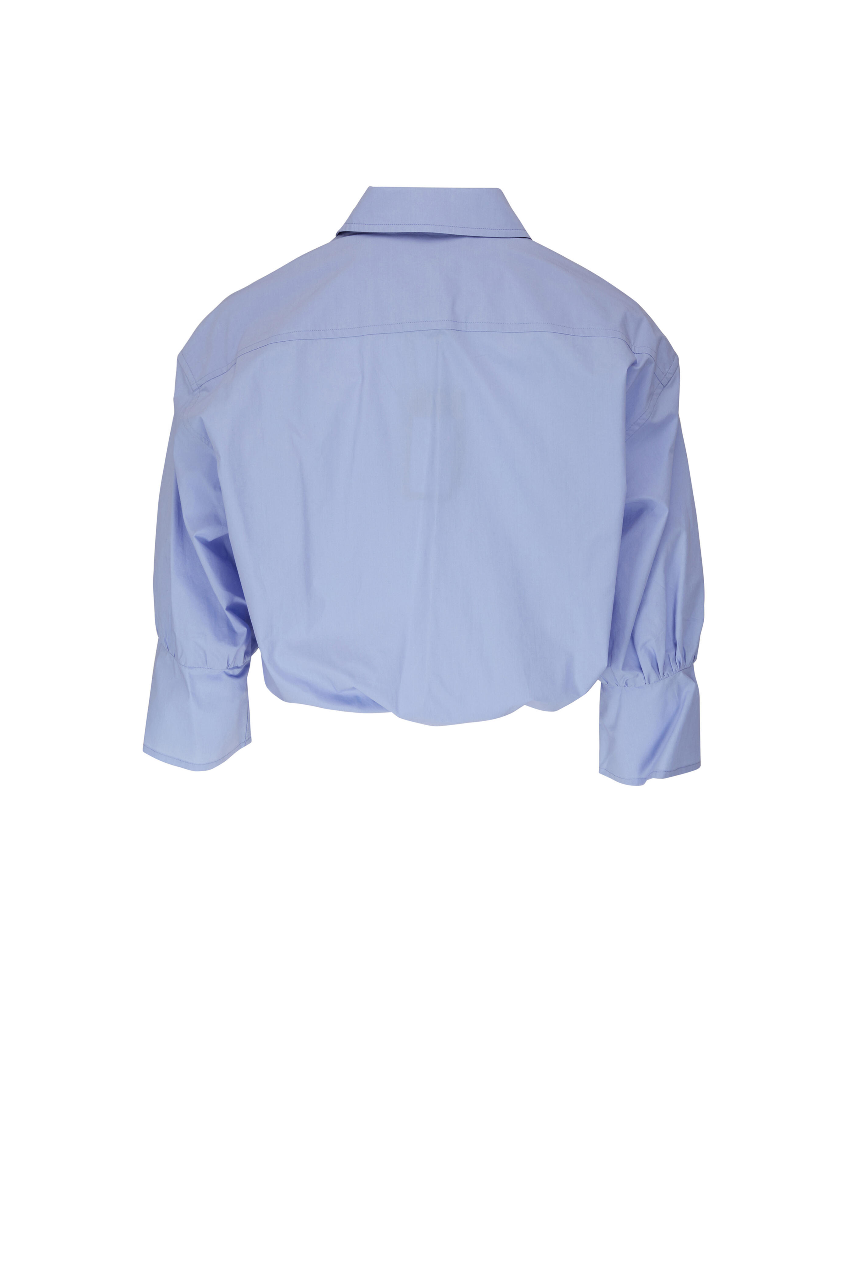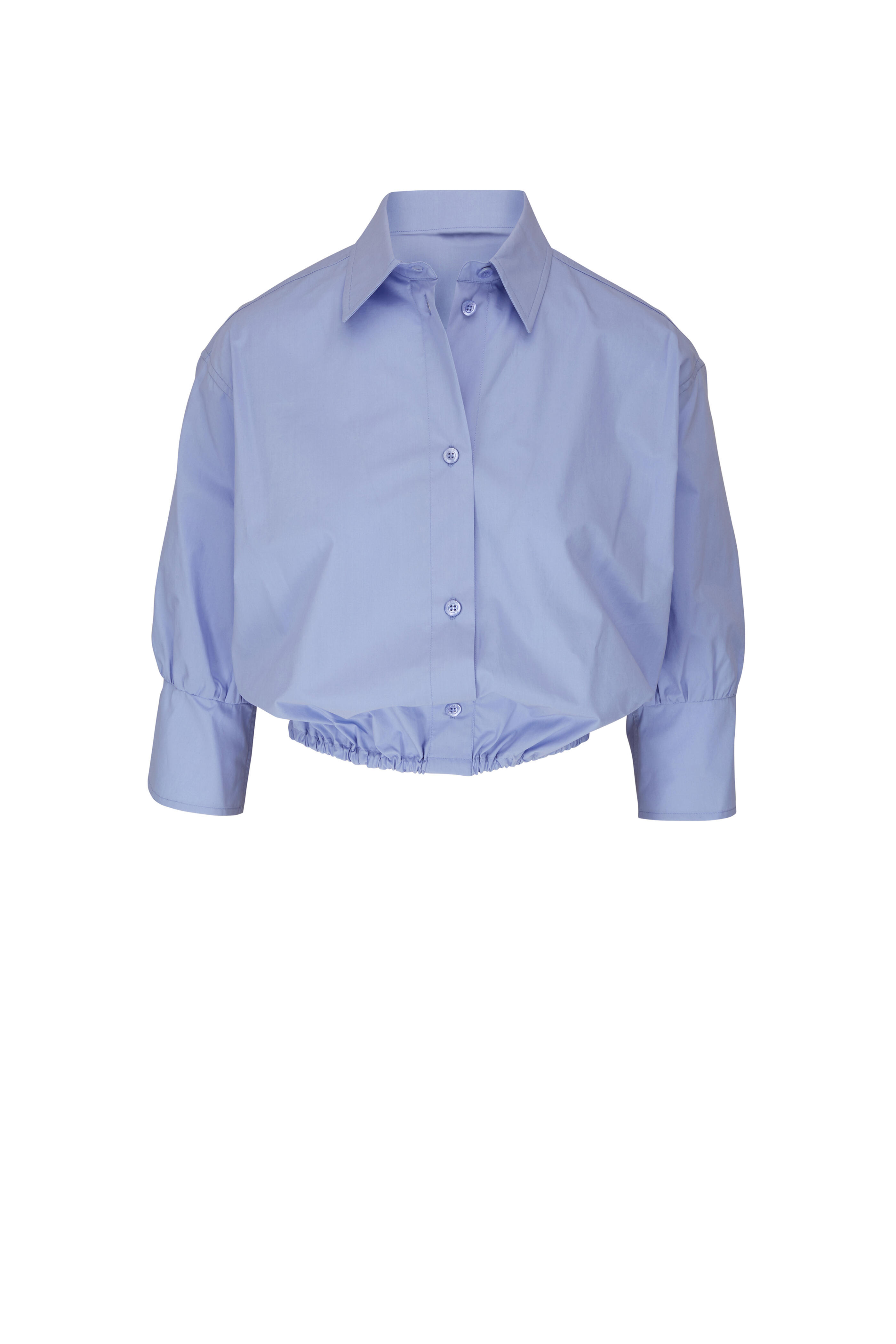 Spread collar. Front button placket. Three-quarter sleeves; gathered cuffs. Elasticized hem. Imported. 100% cotton. Machine wash.