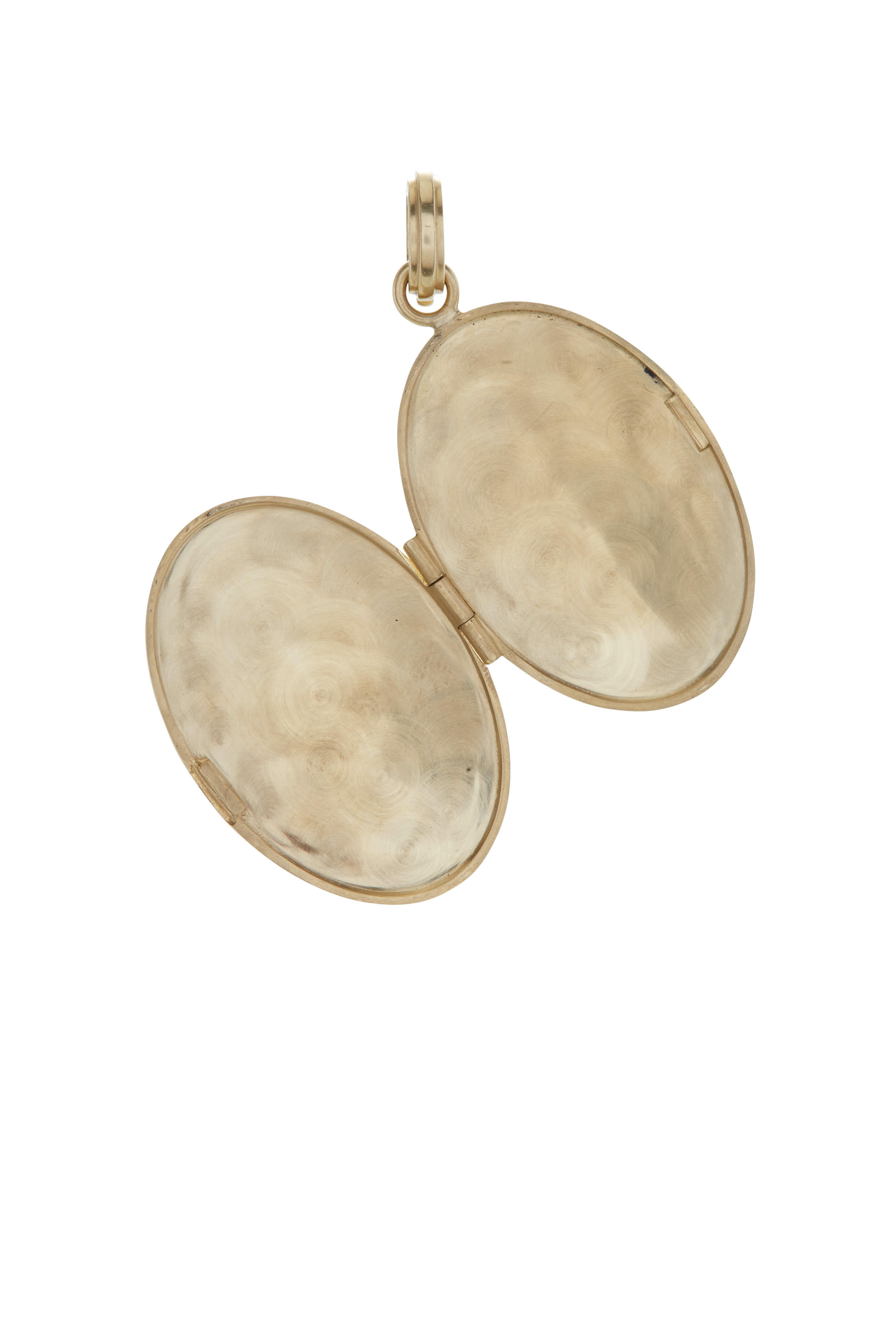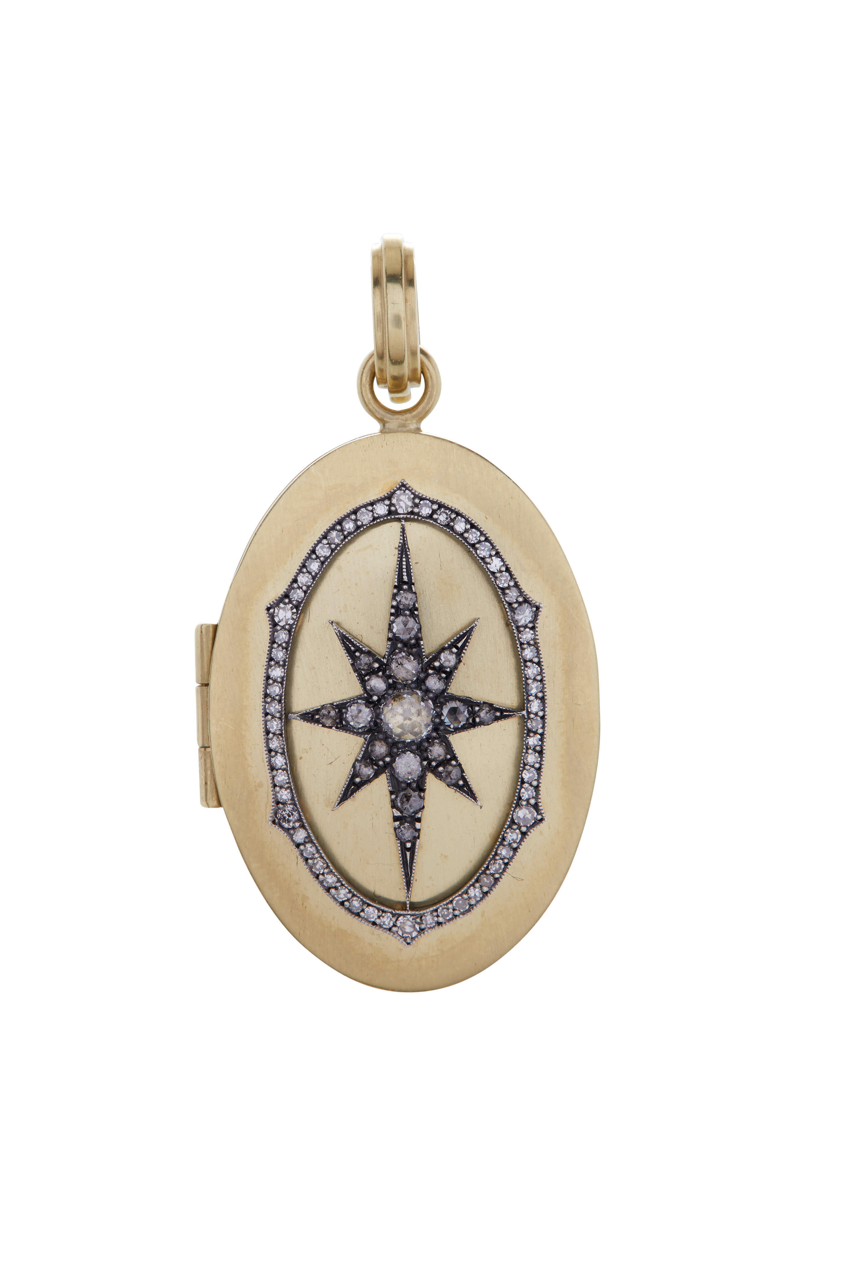 18k yellow gold. Sterling silver. .38 carat grey rose cut diamonds. .25 carat single cut diamonds.