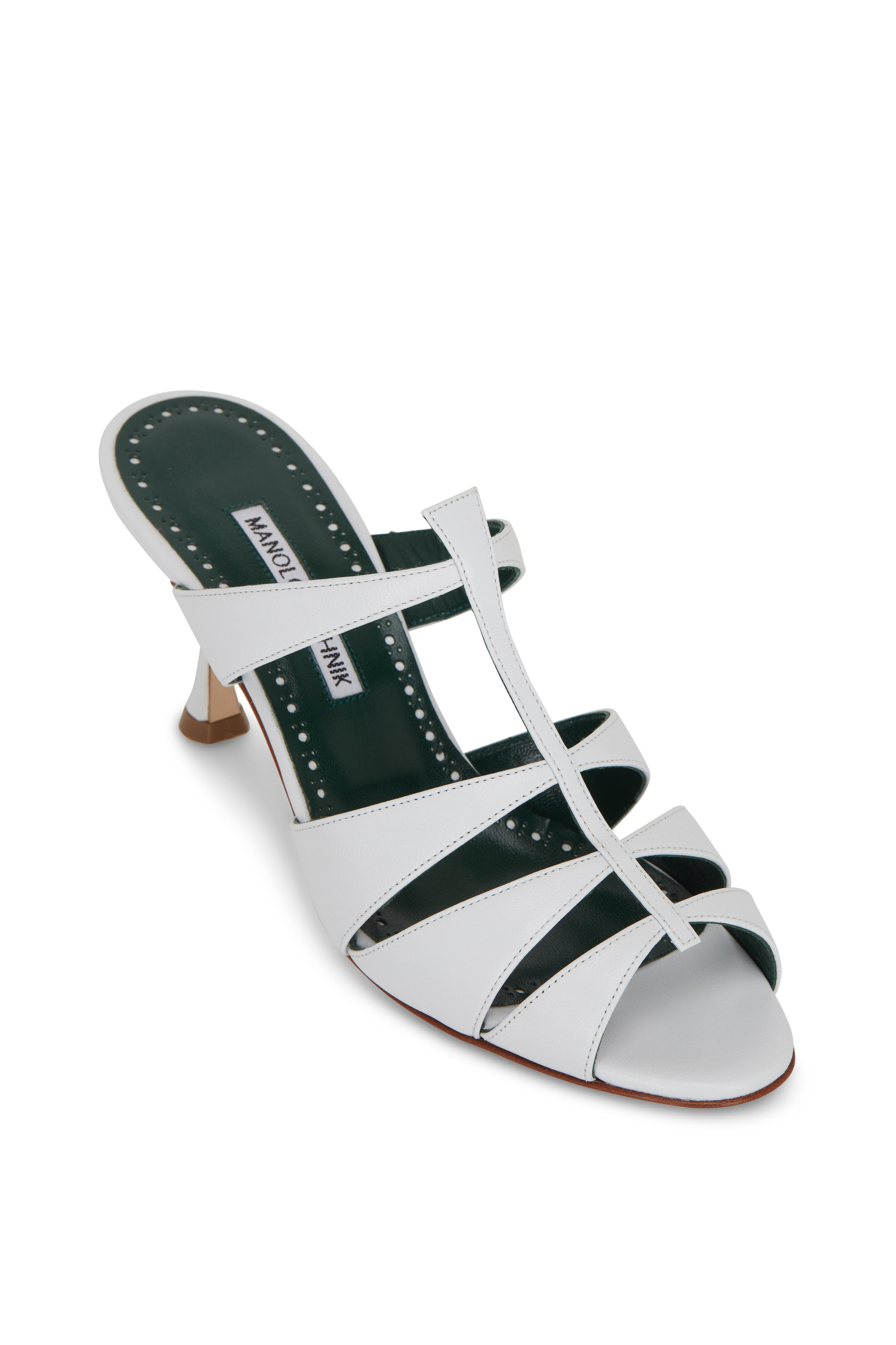 Leather upper. Tapered, open toe. Slip on style. Leather lining and insole. Leather sole. Hand made in Italy. Heel measurement: 70mm (2.75").