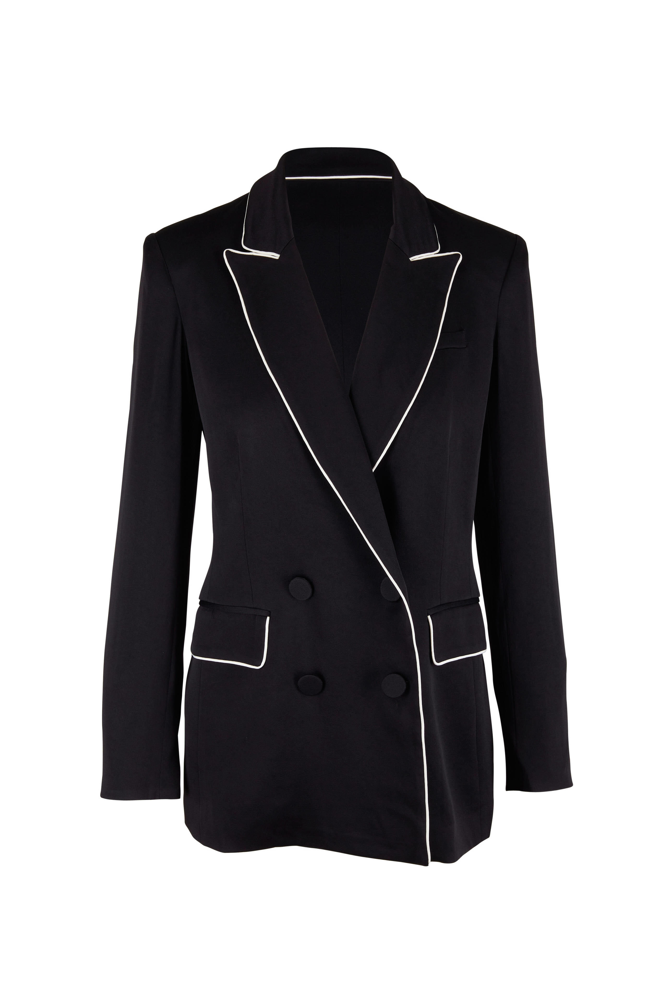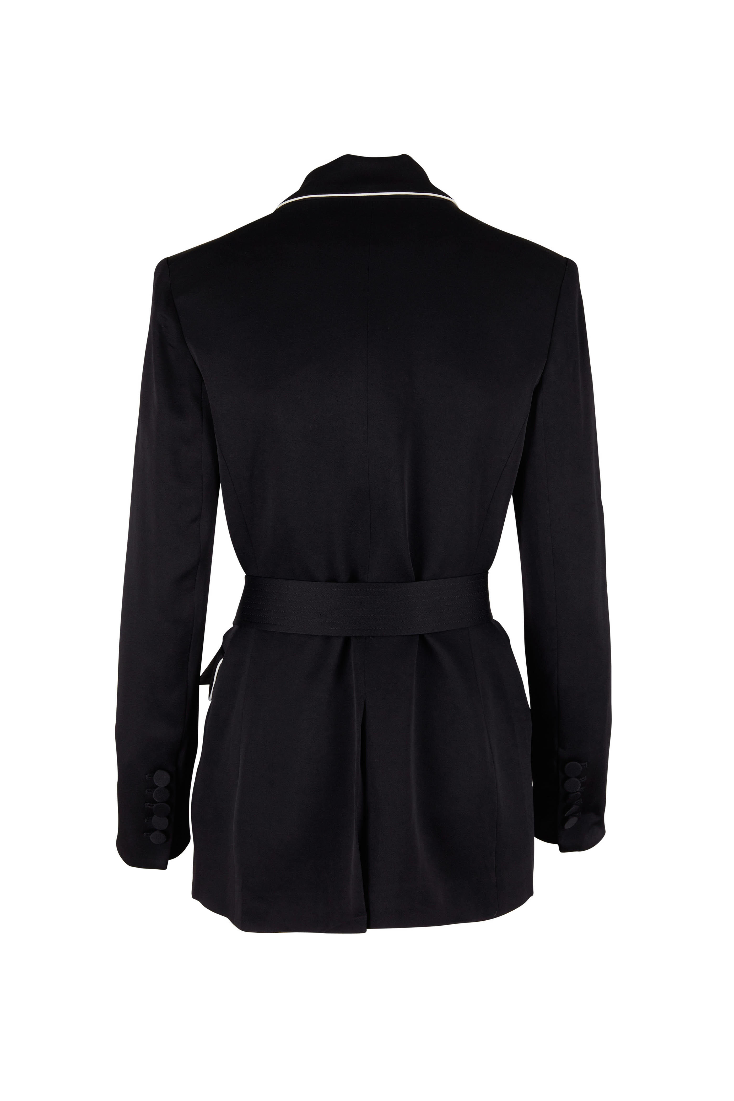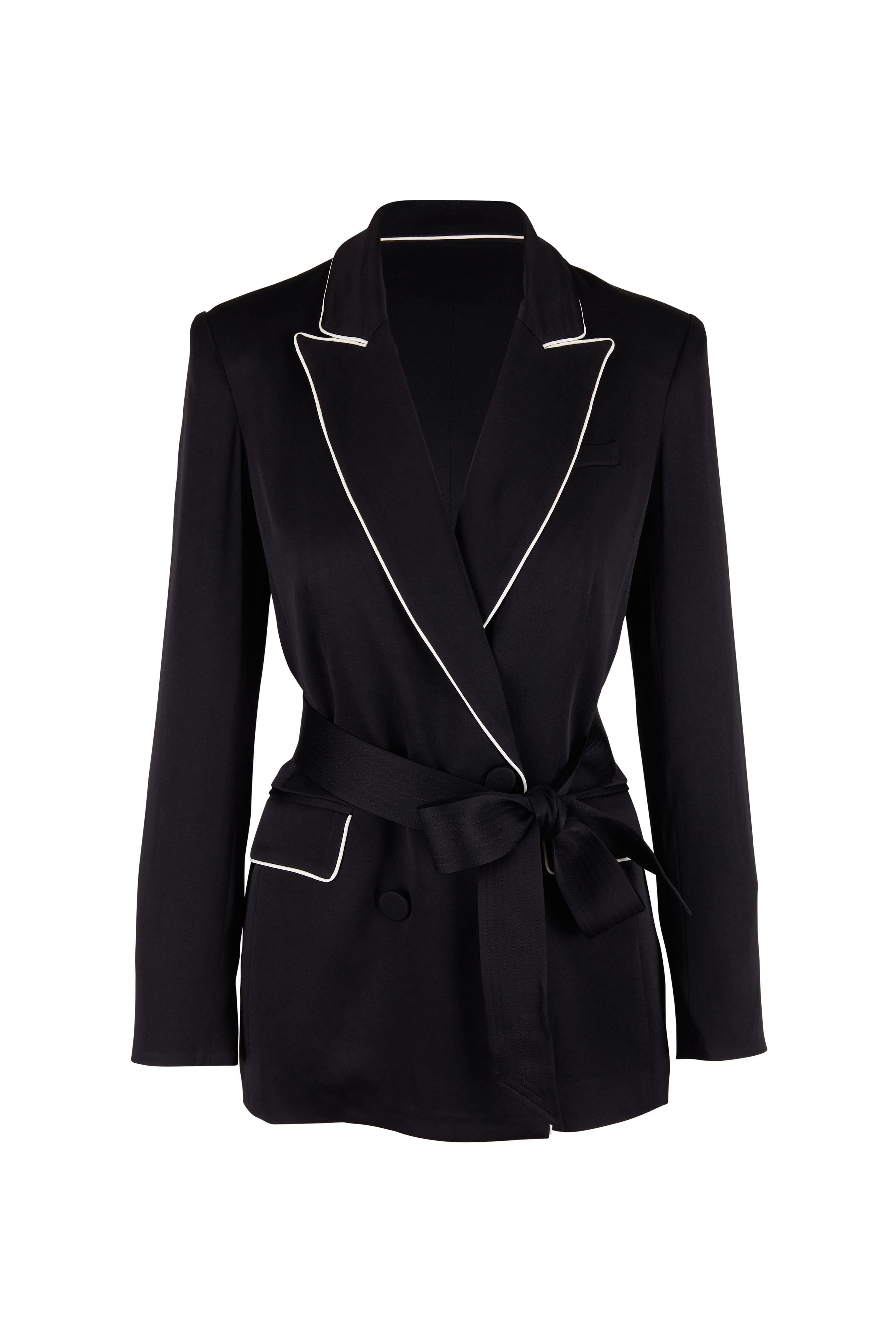 Peak lapels. Double-breasted button closure. Removable self-tie. Side flap pockets. Back vent. Contrast piping. Imported. Sleeve length 32 1/2". Length 28 1/4". 72% acetate, 28% rayon. Dry clean.