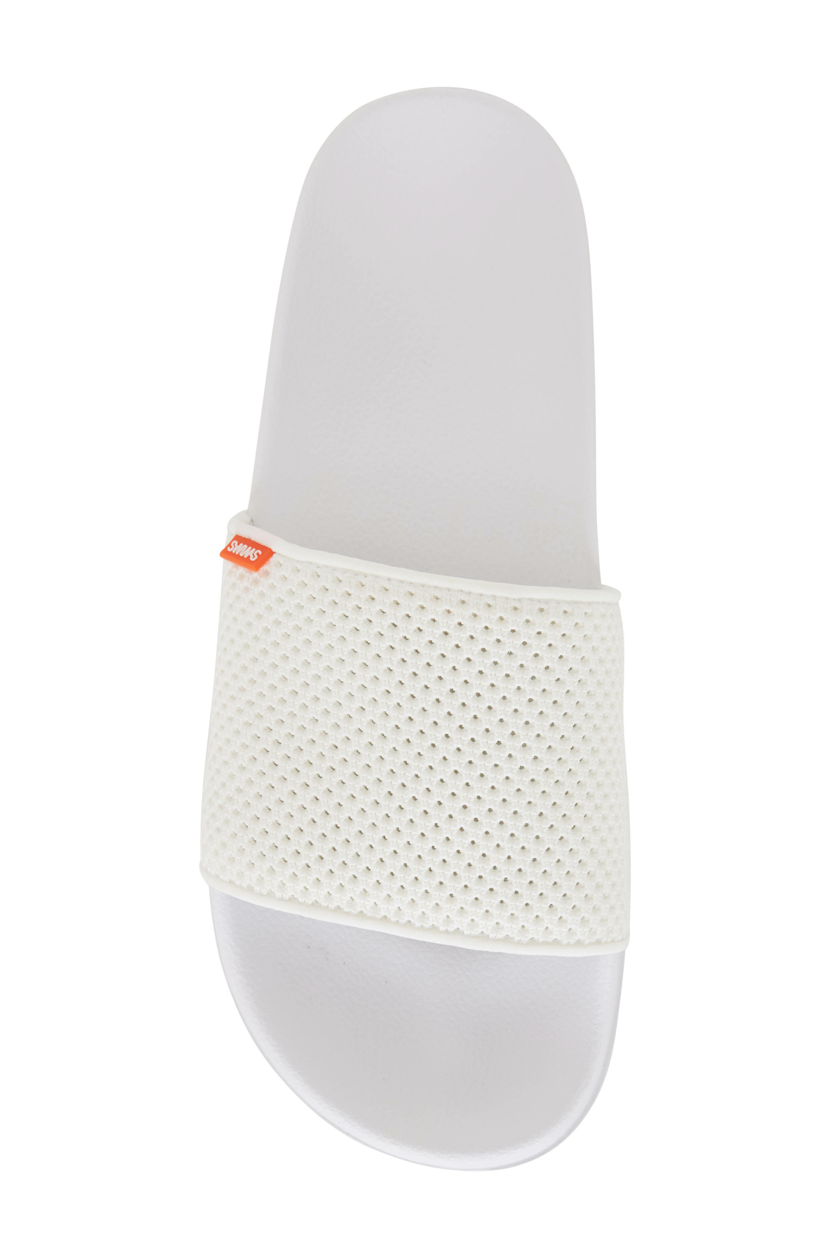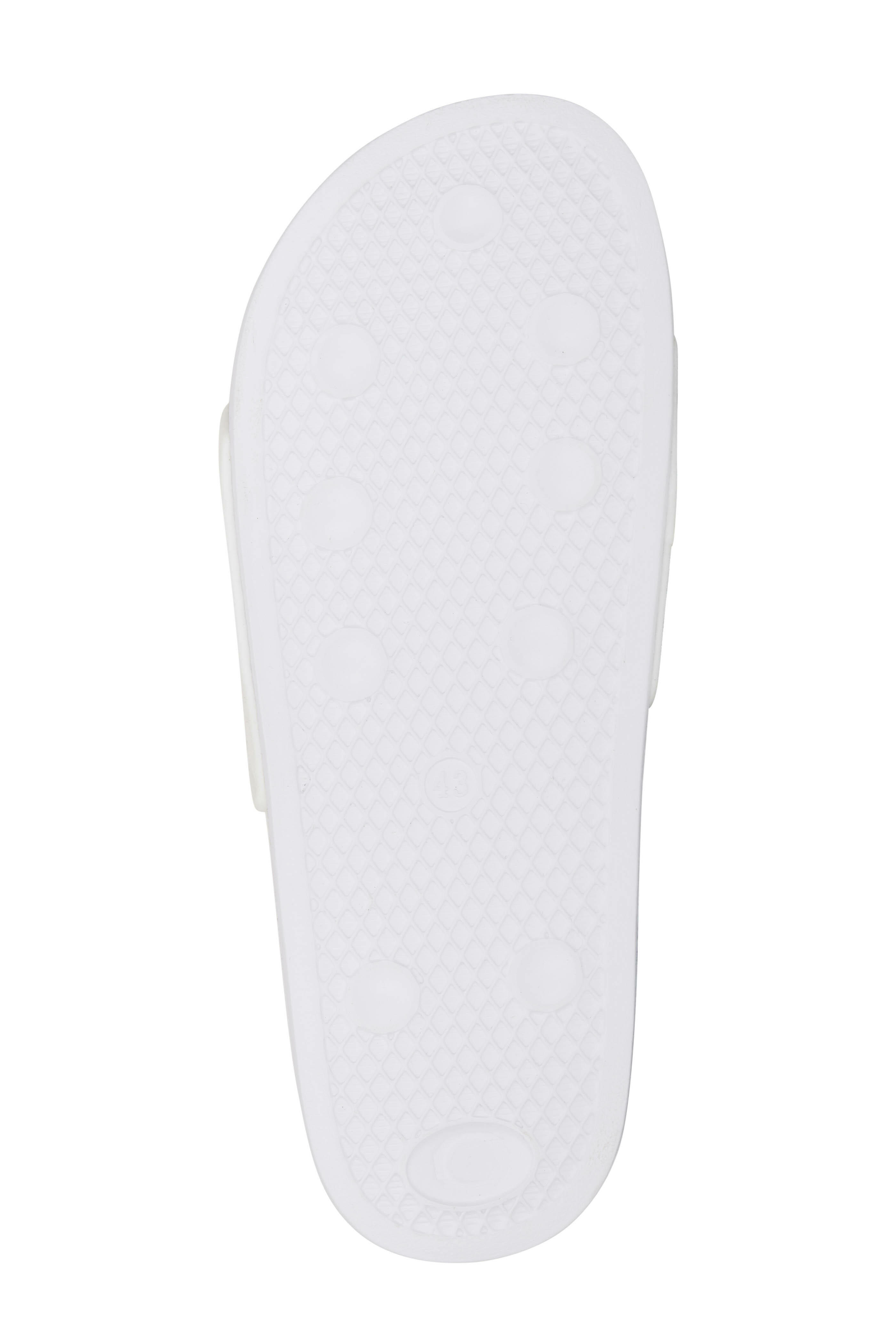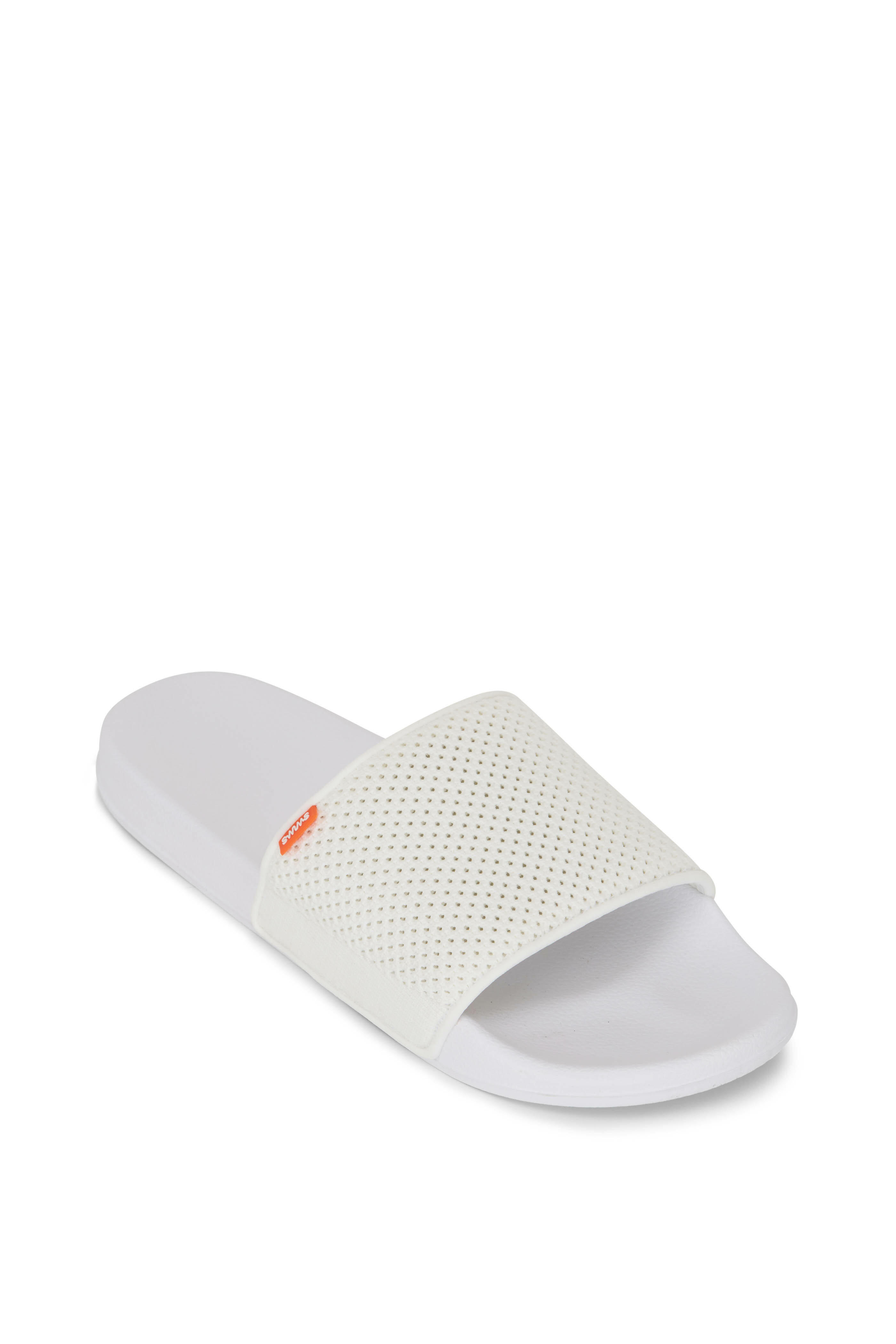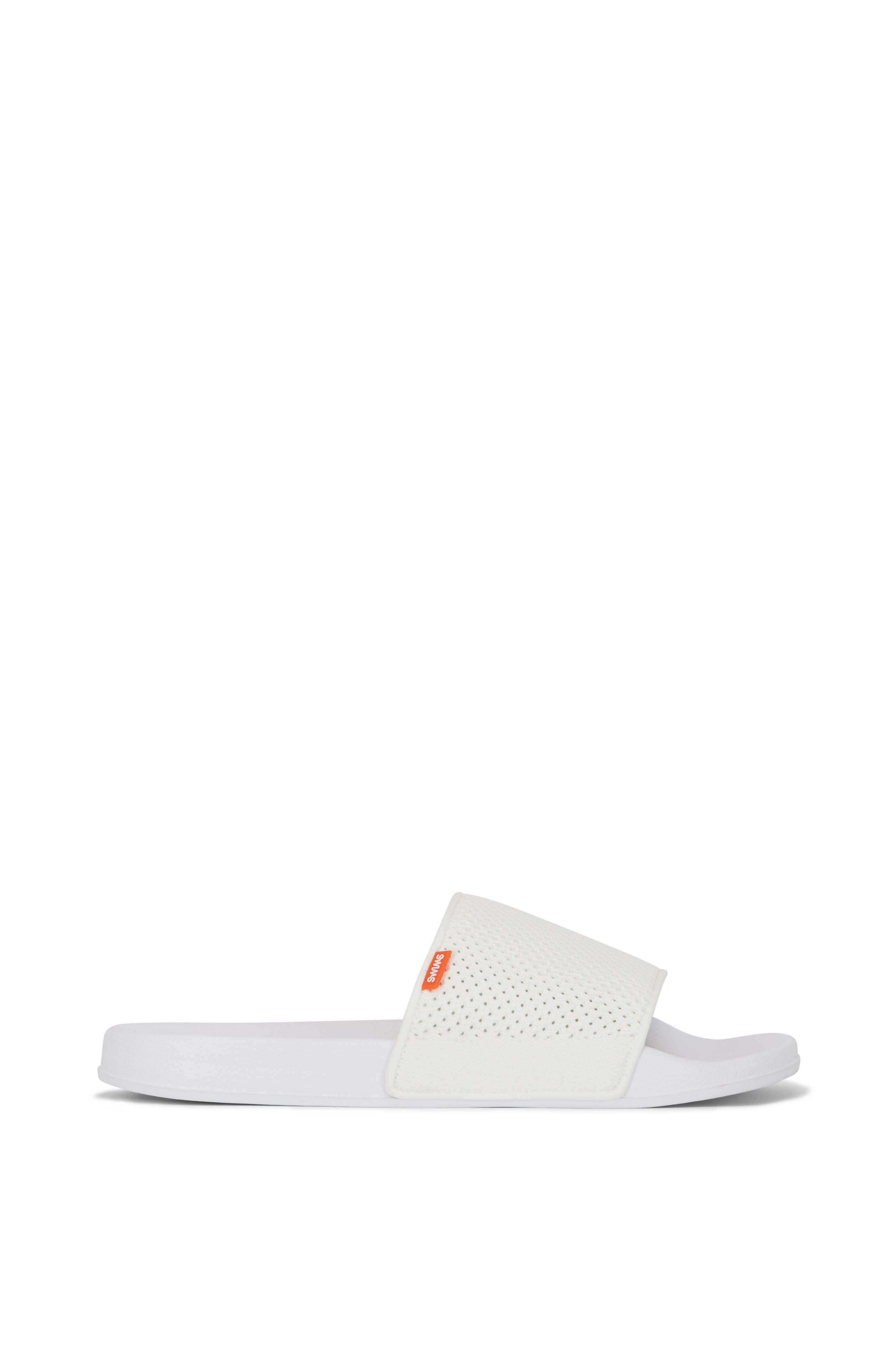 Knit upper. Round, open toe. Slide on style. Molded footbed. Rubber sole. Imported.