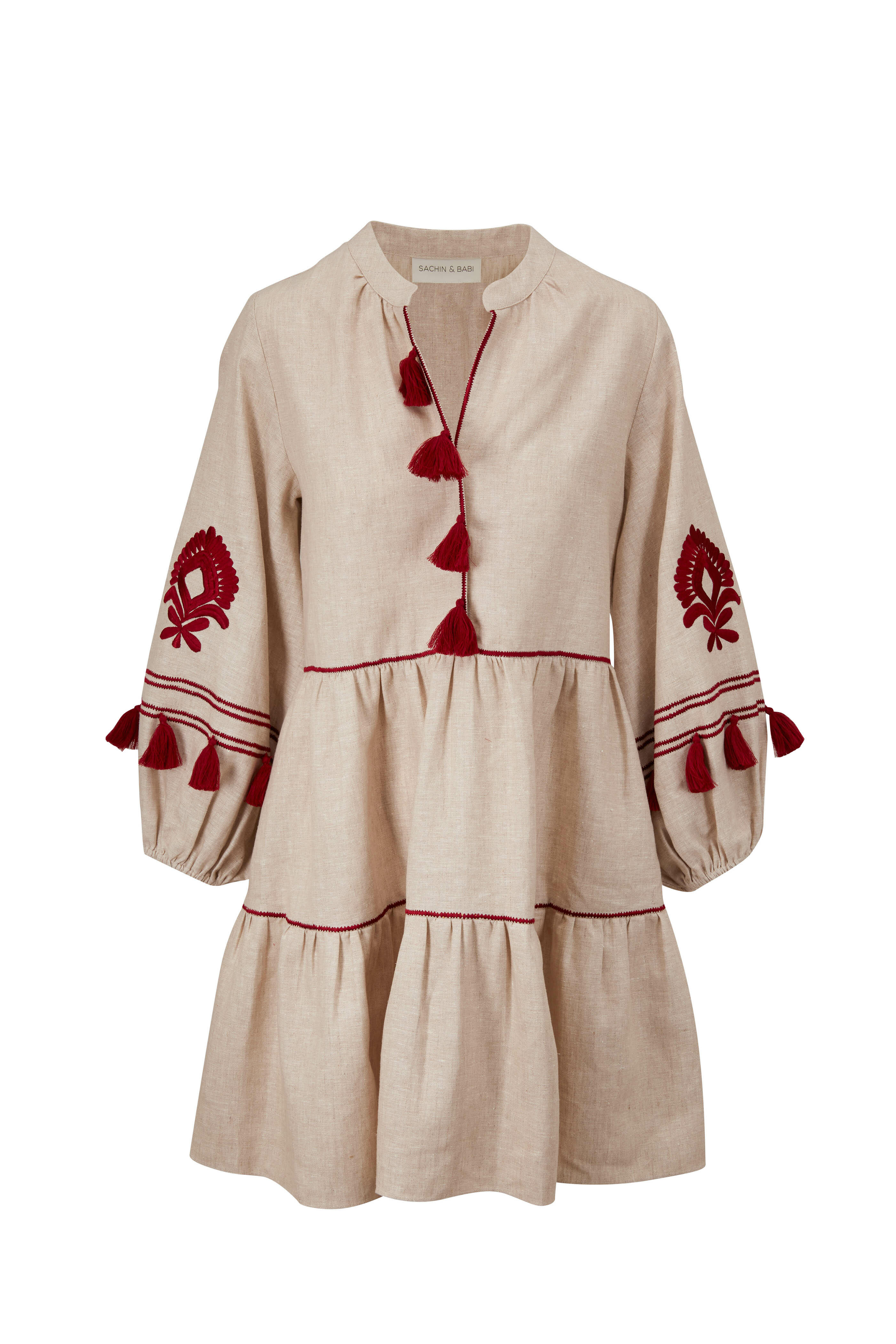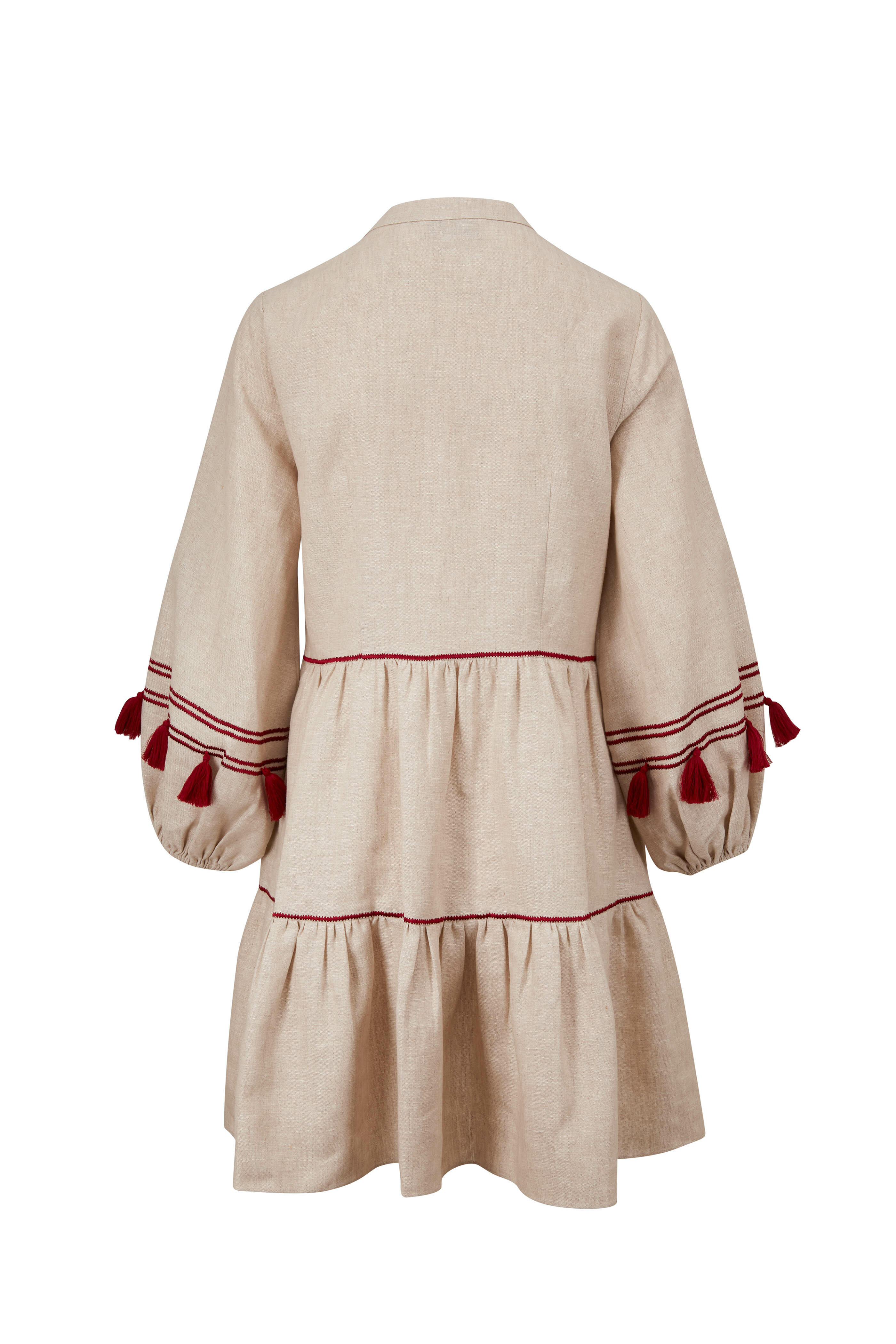 V-neckline. Concealed side zip. Flounced skirt. Tassel detailing. Imported. About 35" shoulder to hem. 100% linen. Dry clean.
