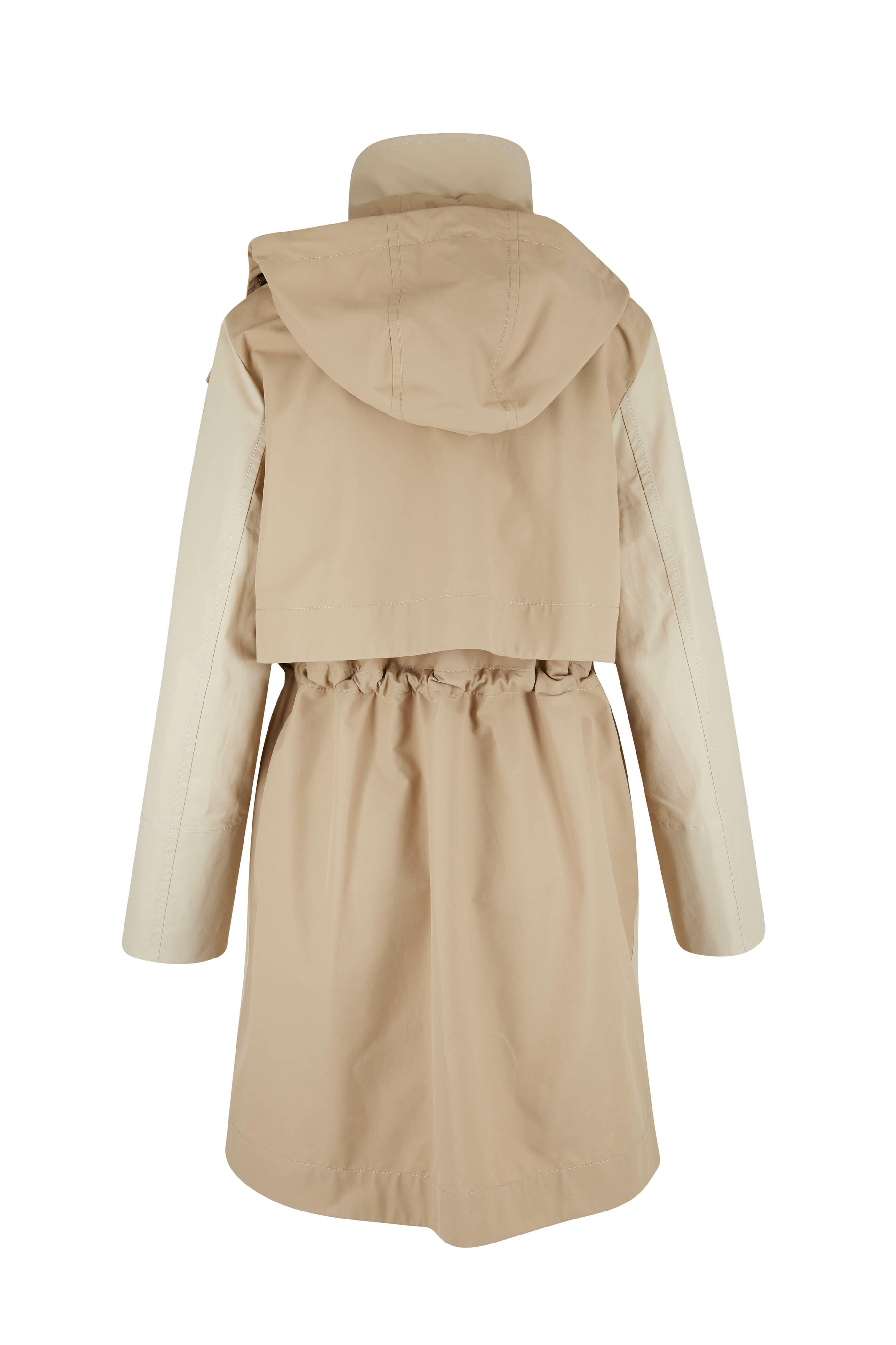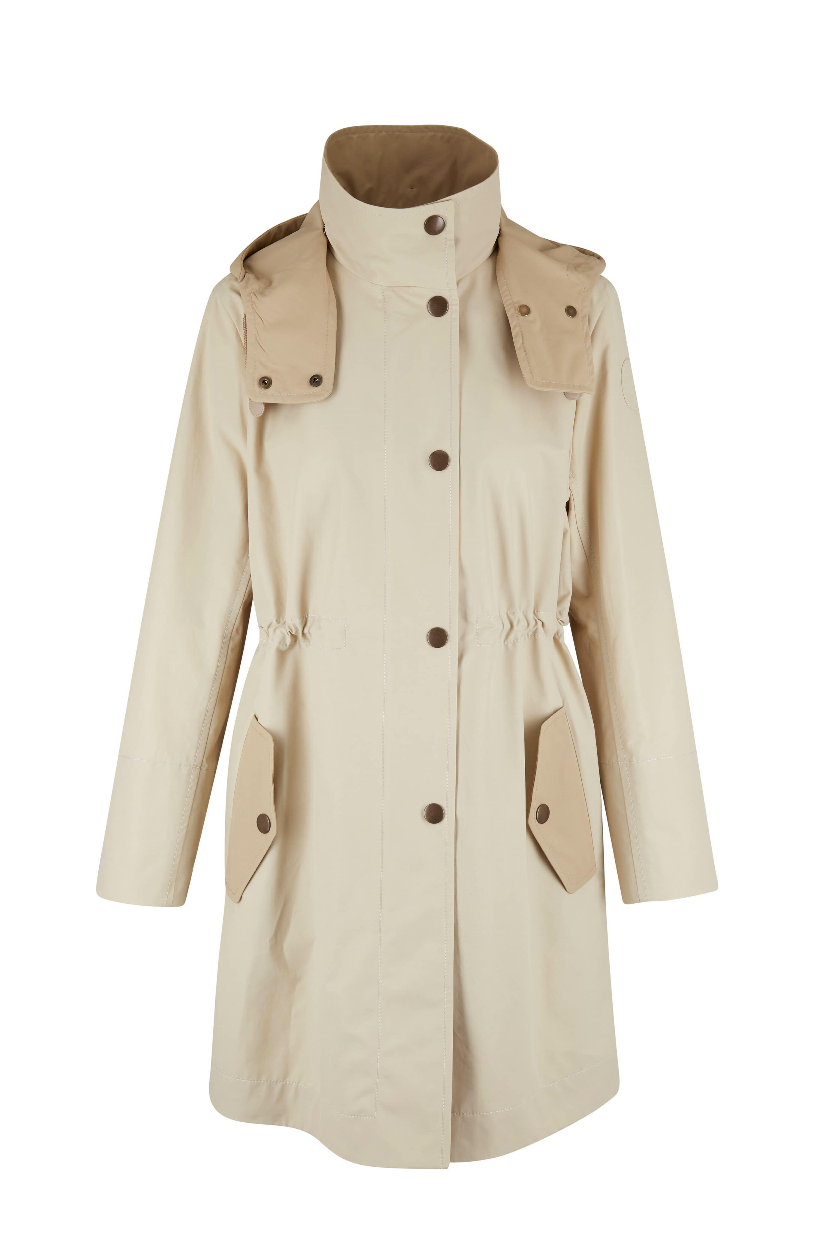 Removable hood; stand collar. Concealed two-way zip; snap placket. Lower snap flap pockets. Internal adjustable drawcord at waist. Imported. 64% cotton, 36% nylon. Dry clean.