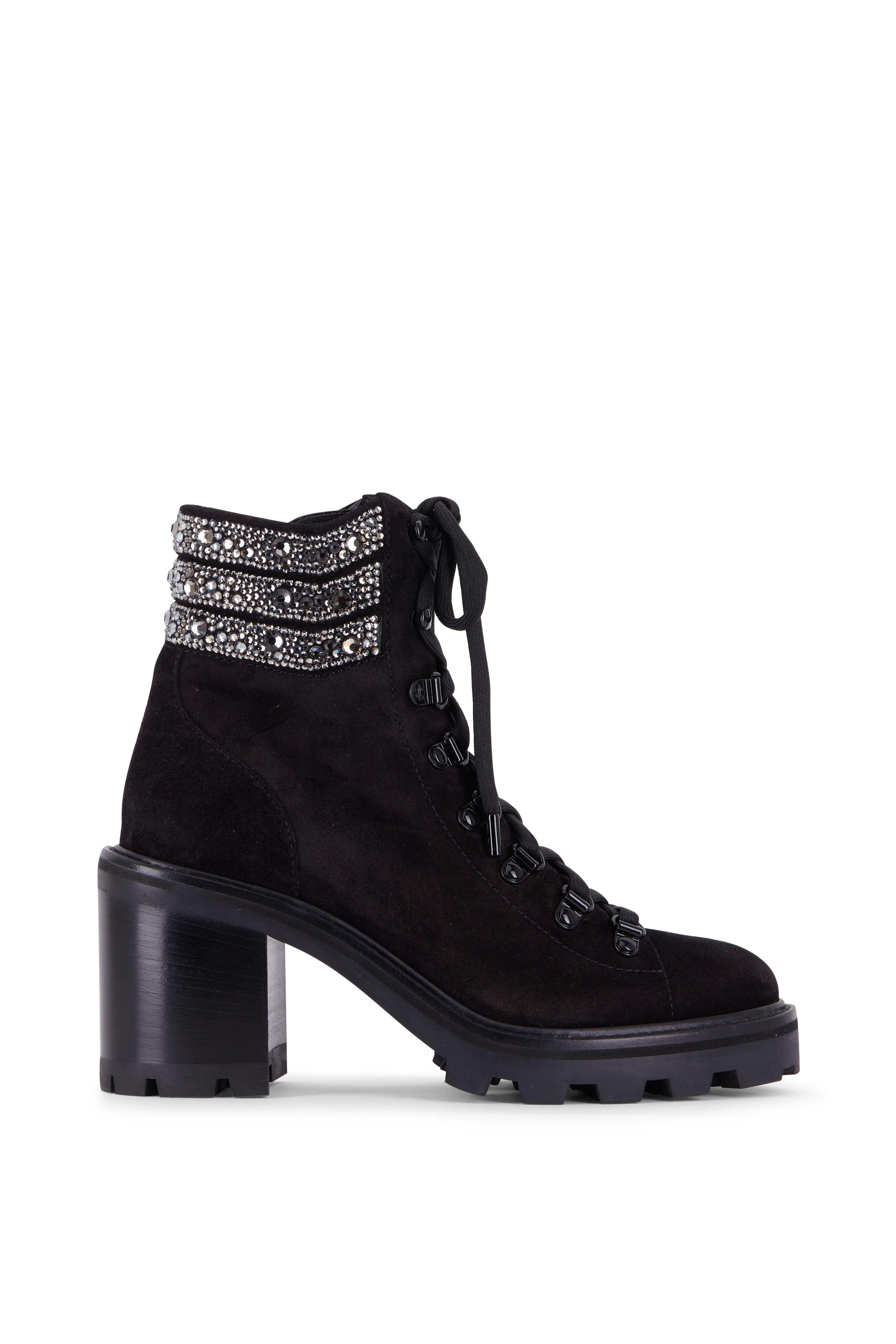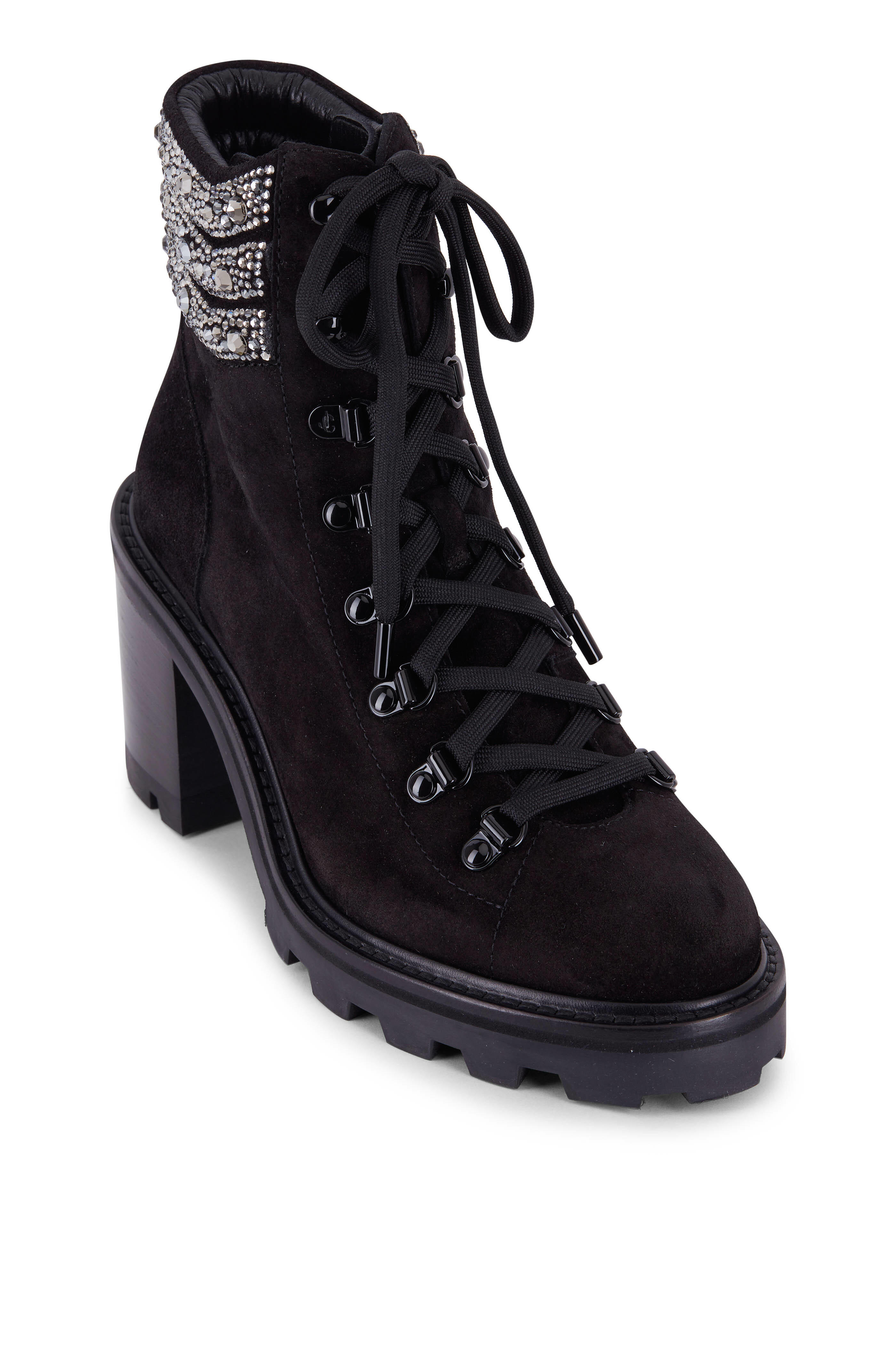 Suede upper. Round toe. Lace-up closure. Leather lining and insole. Crystal detailed collar. Rubber lug sole. Made in Italy. Heel measurement: 65mm (approx. 2.5").