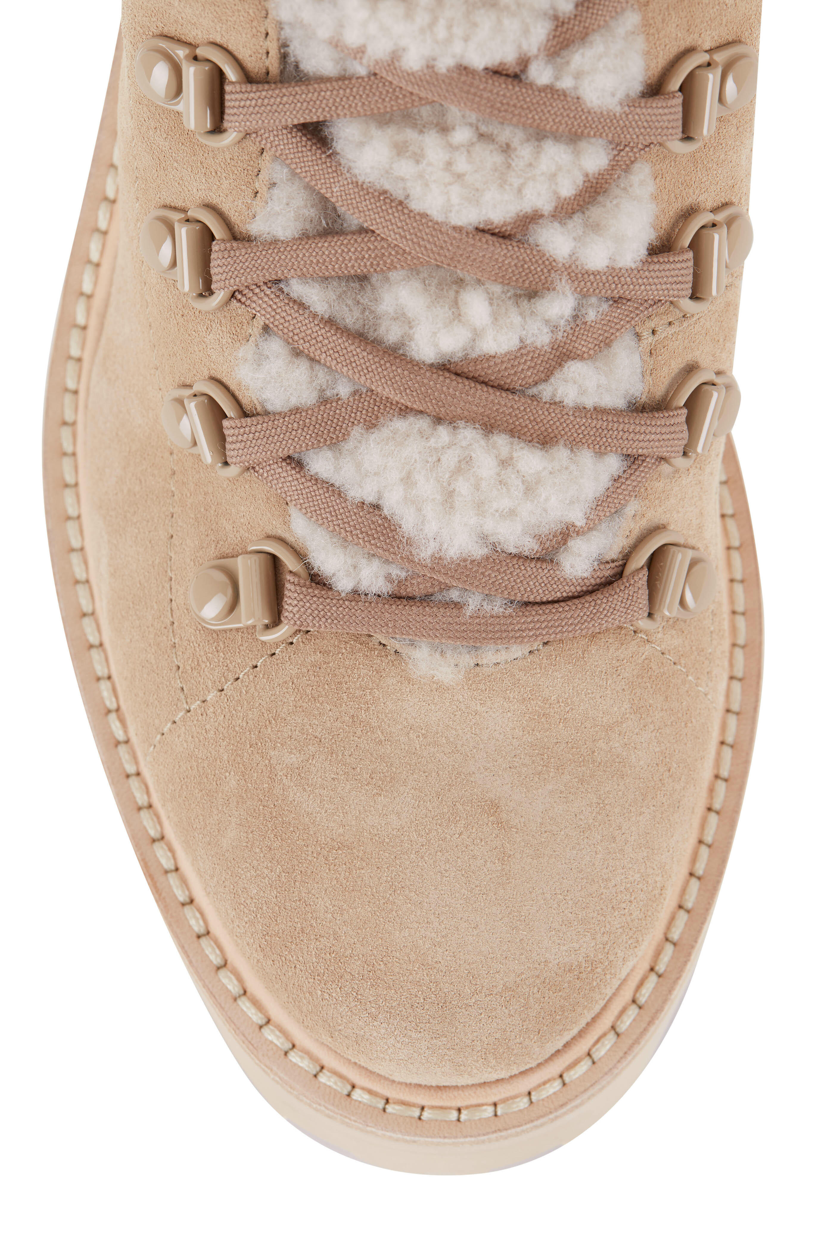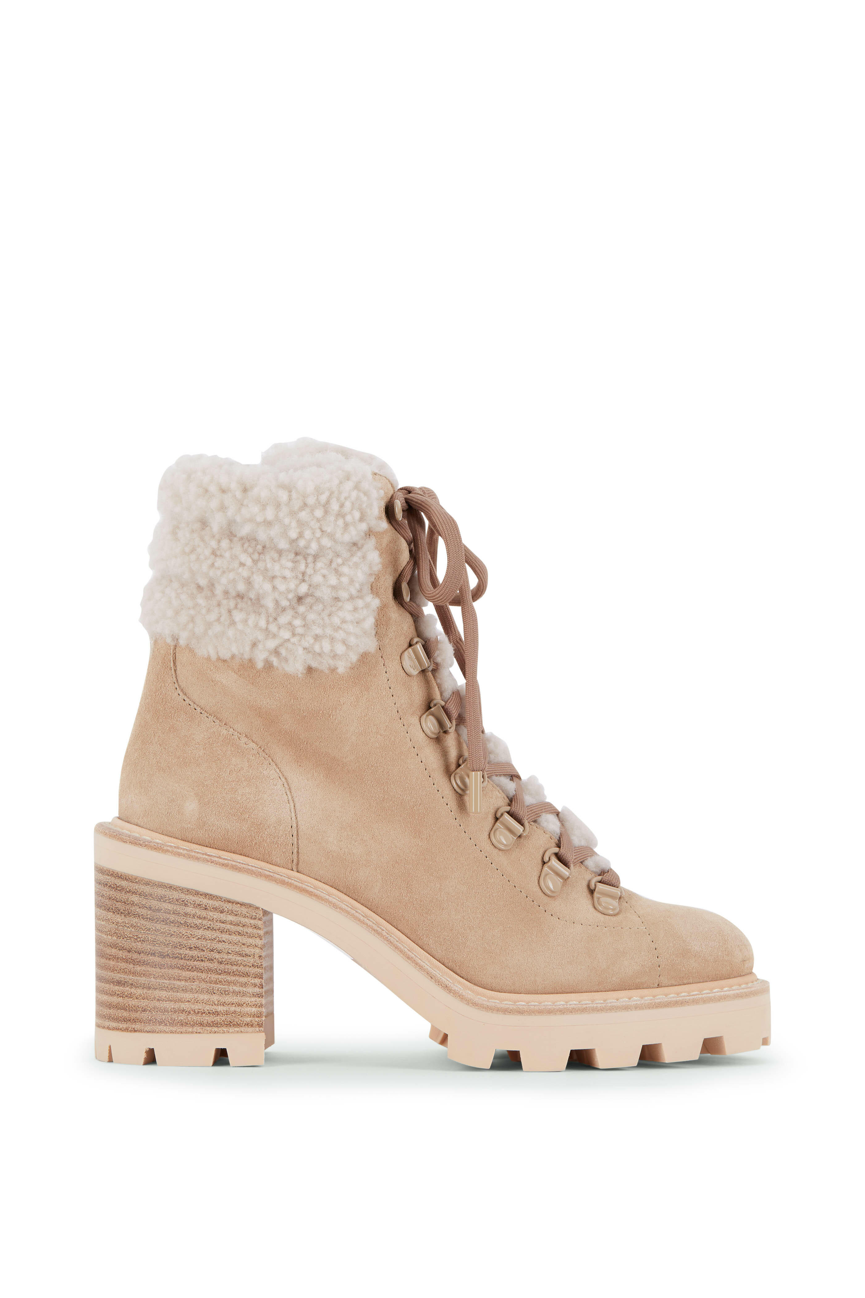 Suede upper. Round toe. Lace-up closure. Shearling trim. Shearling lining and insole. Rubber lug sole. Made in Italy. Heel measurement: 65mm (approx. 2.5").