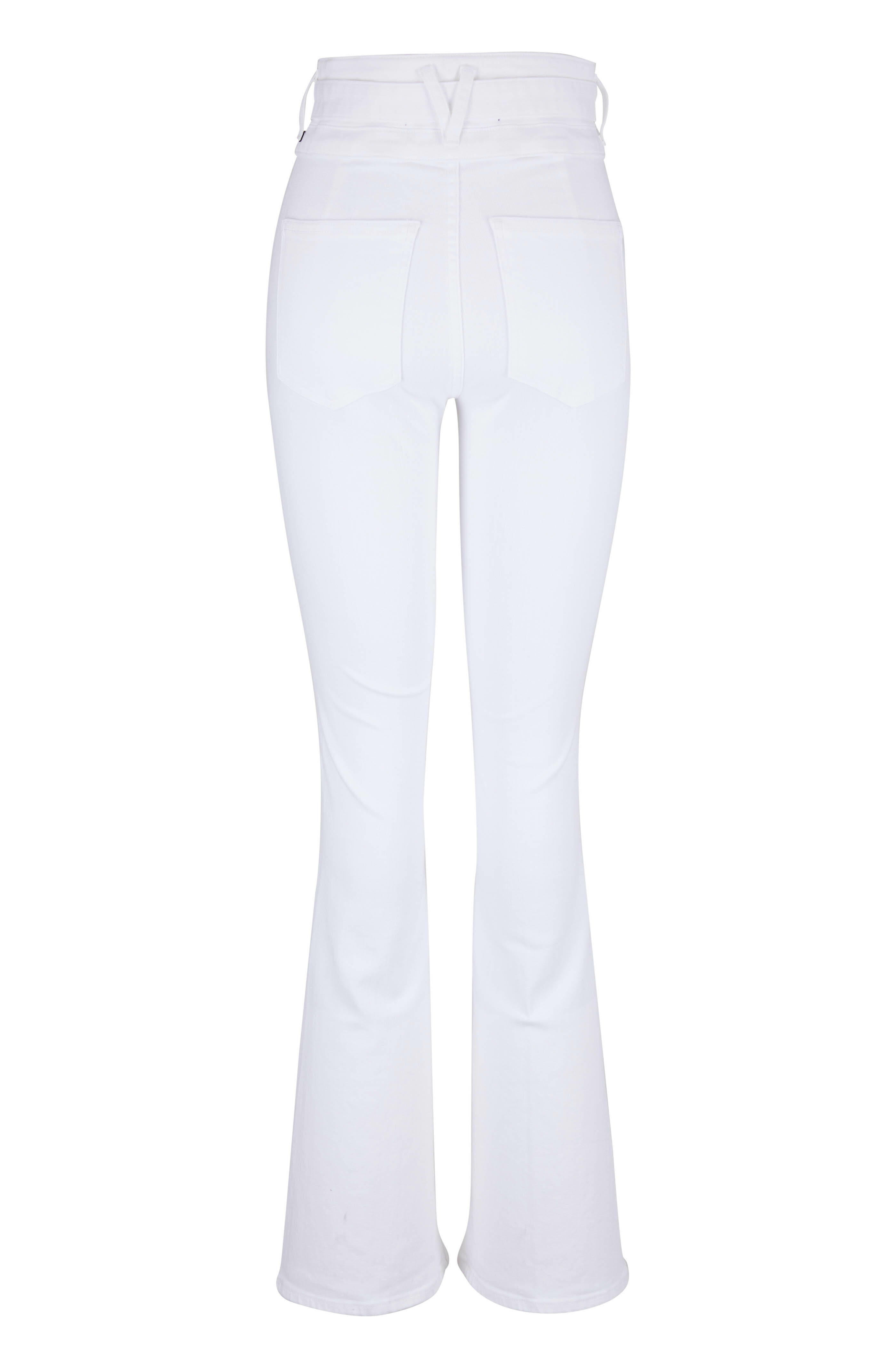 Belt loops. Zip and three button fly. Removable self tie. Front fold over button pockets; back patch pockets. Made in LA. Extra High Rise Flare. 33” inseam. 91% cotton, 7% polyester, 2% polyurethane. Machine wash.