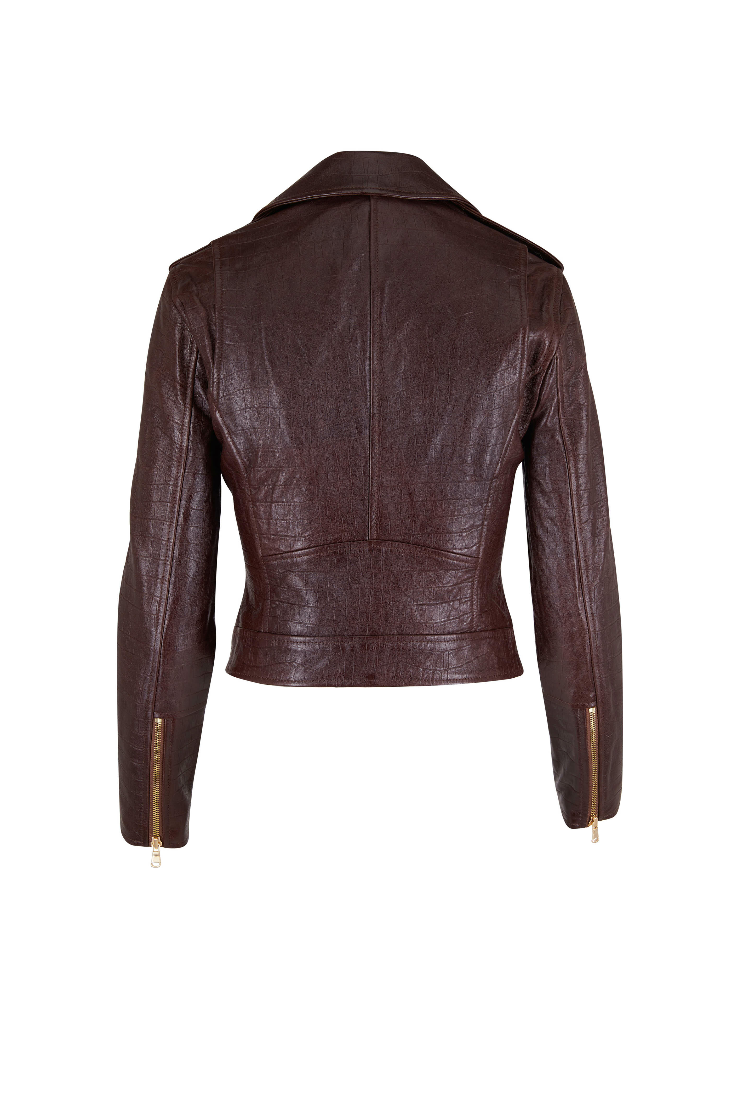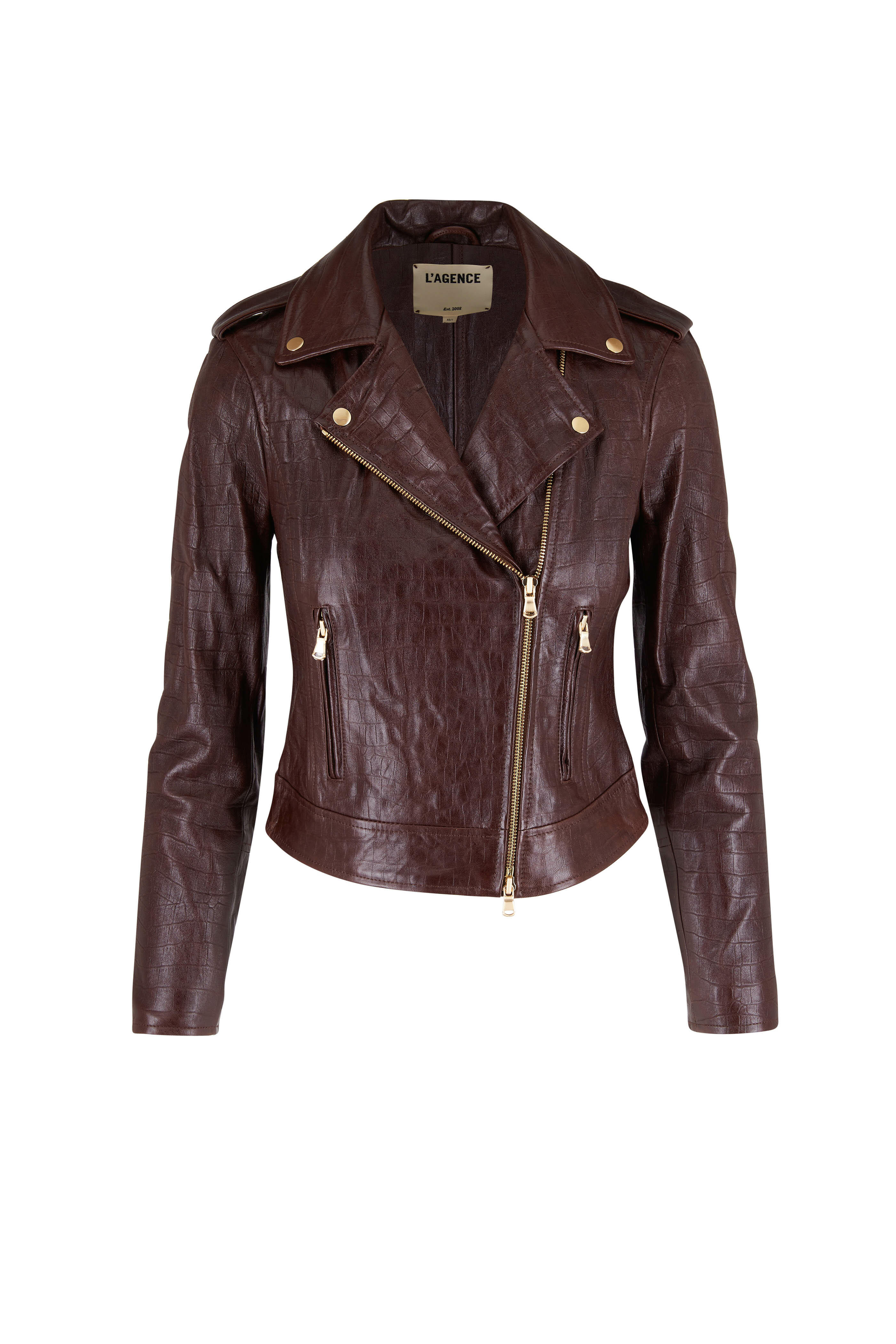 Specialist clean. Spread collar. Asymmetric front zip. Snap button shoulder epaulets. All over croc detail. Front zip pockets. Zip cuffs. Imported. 100% leather; lined: 100% polyester.
