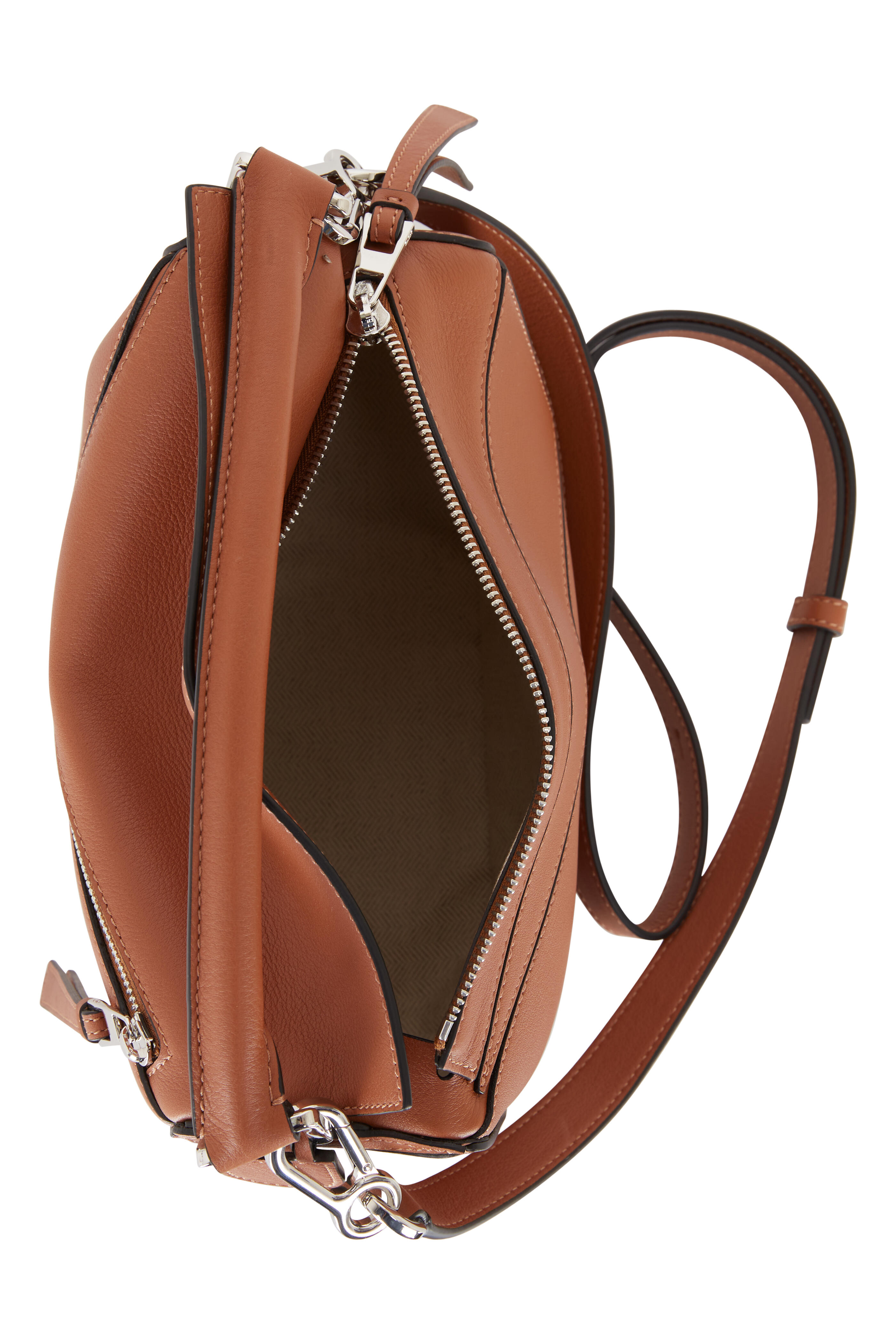 Soft grained calfskin leather. Top handle. Detachable and adjustable shoulder strap. Top zip closure. Exterior front asymmetric zip pocket. Top stitch detailing. Two interior open pockets. Cotton-canvas lining. Made in Spain. Width: 9½". Height: 6". Depth: 4". Handle drop: 3". Detachable and adjustable strap drop: 20".