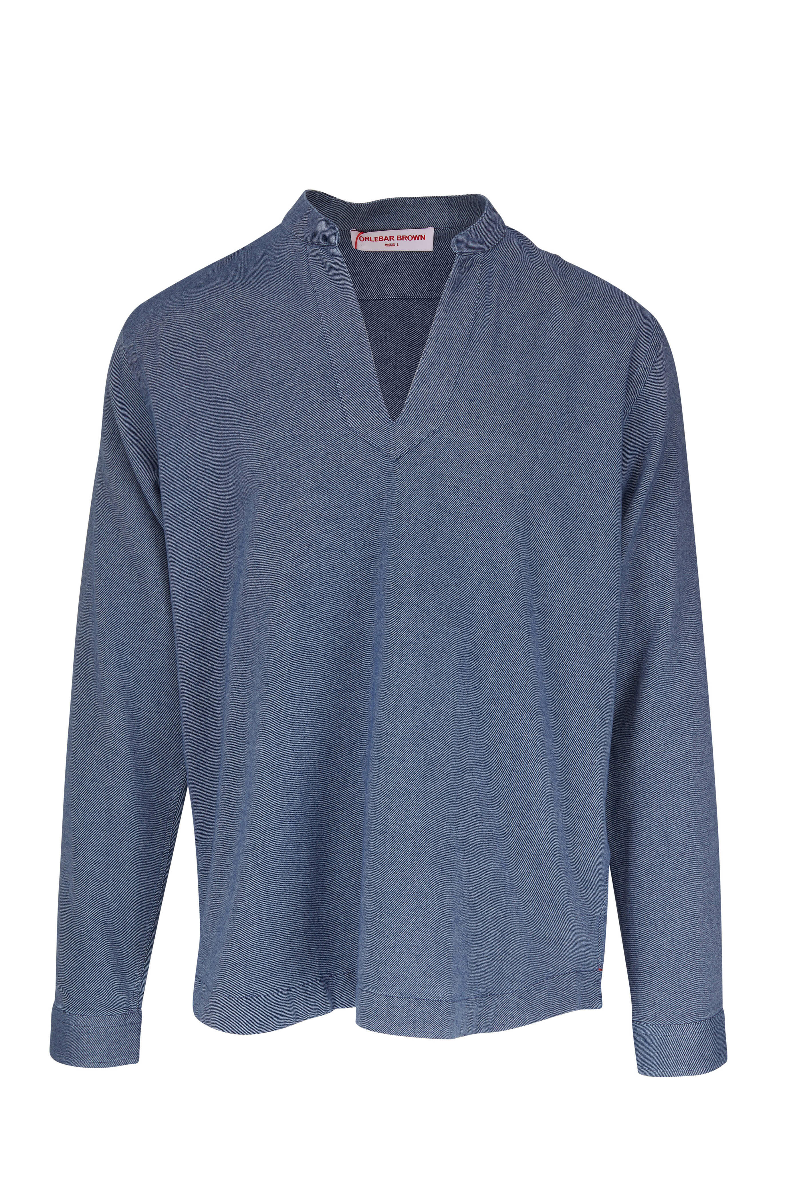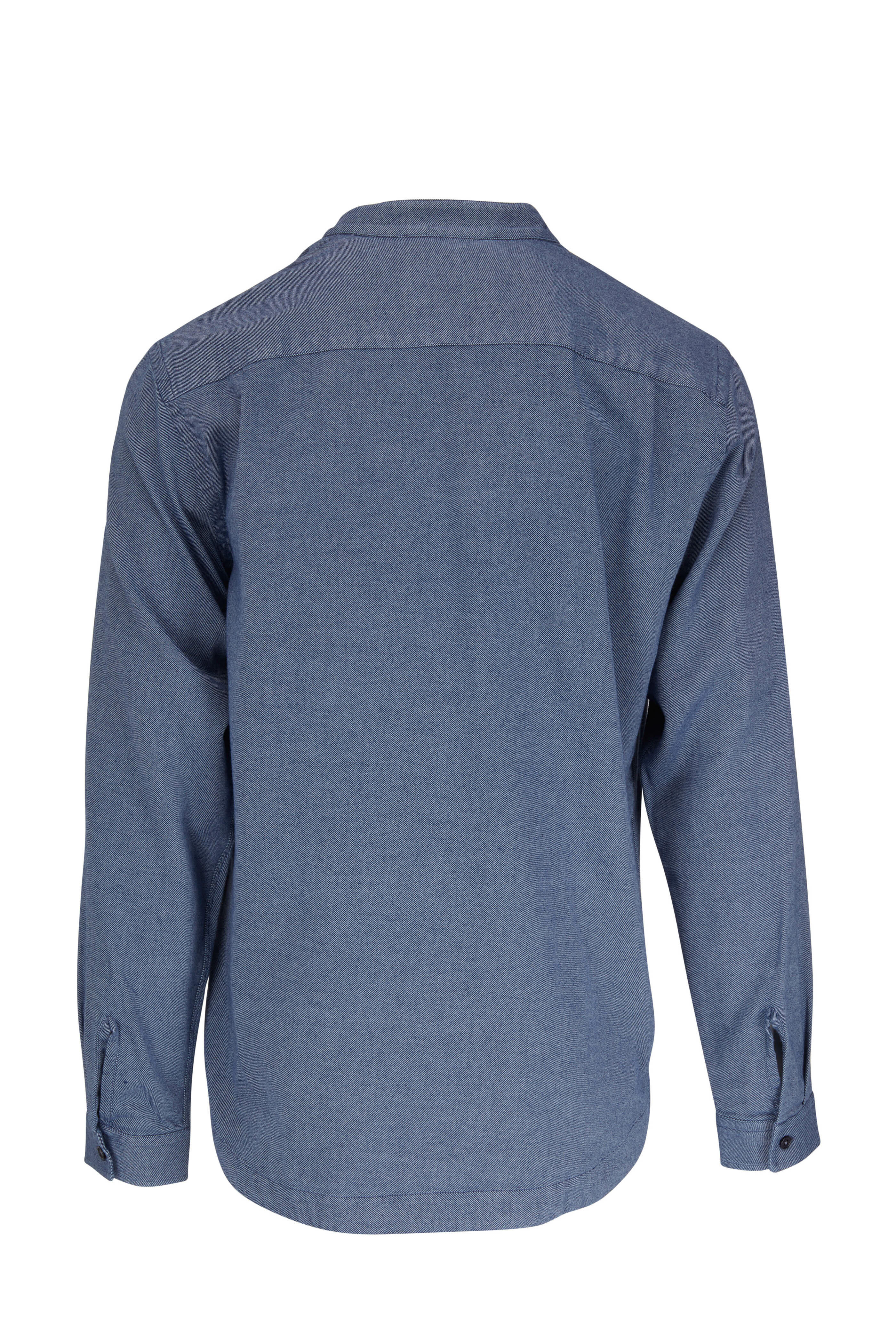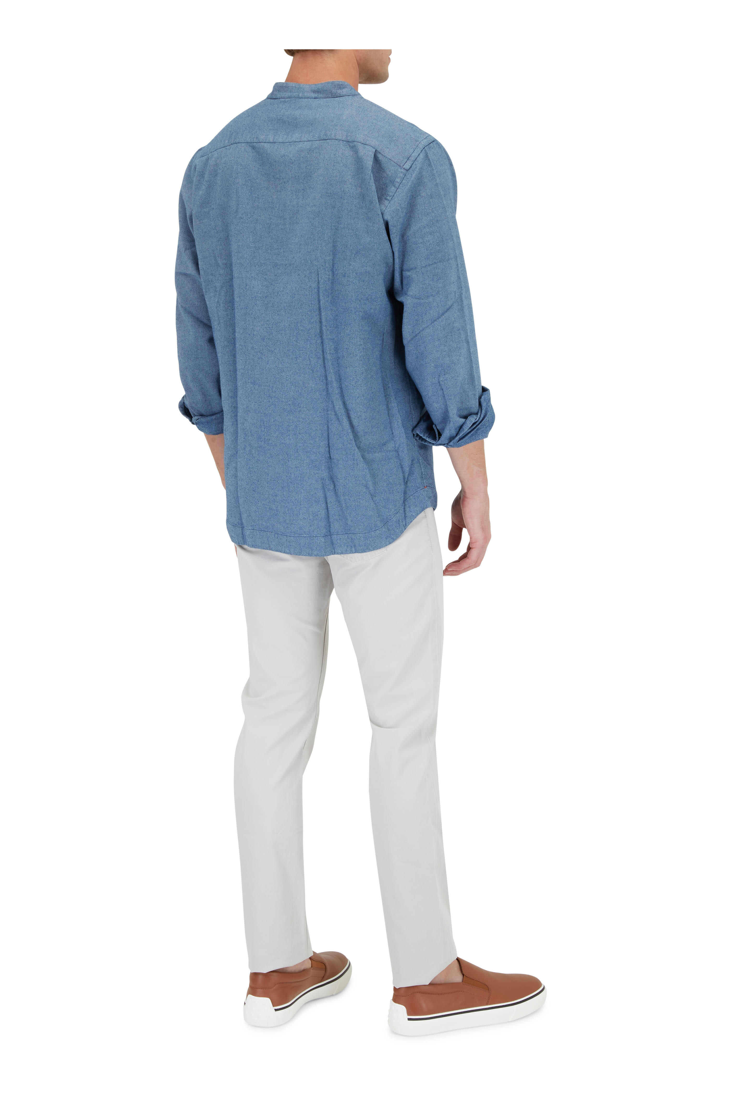 Banded collar; open placket. Single button squared cuffs. Short vented hem. Imported. 100% cotton. Machine wash.