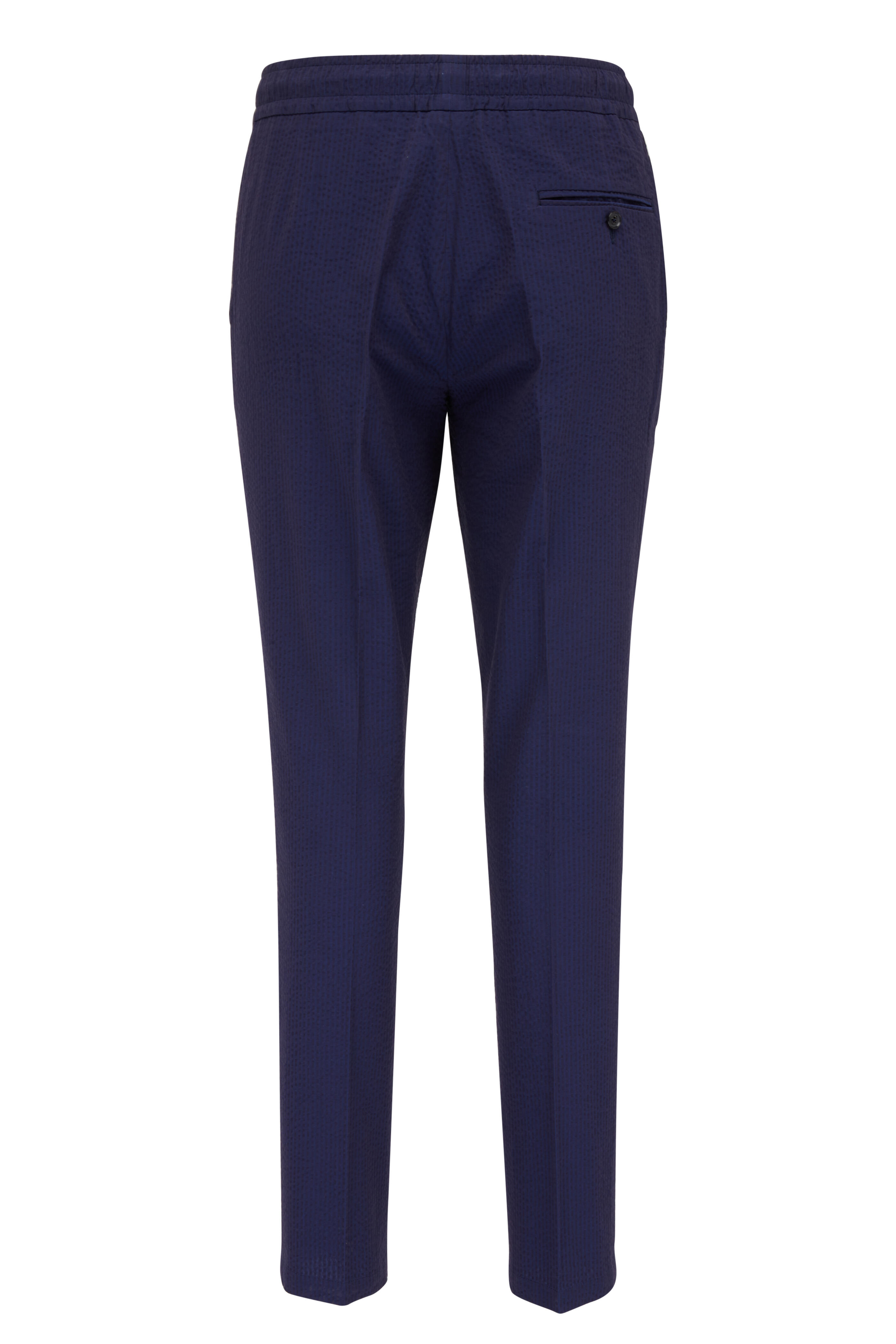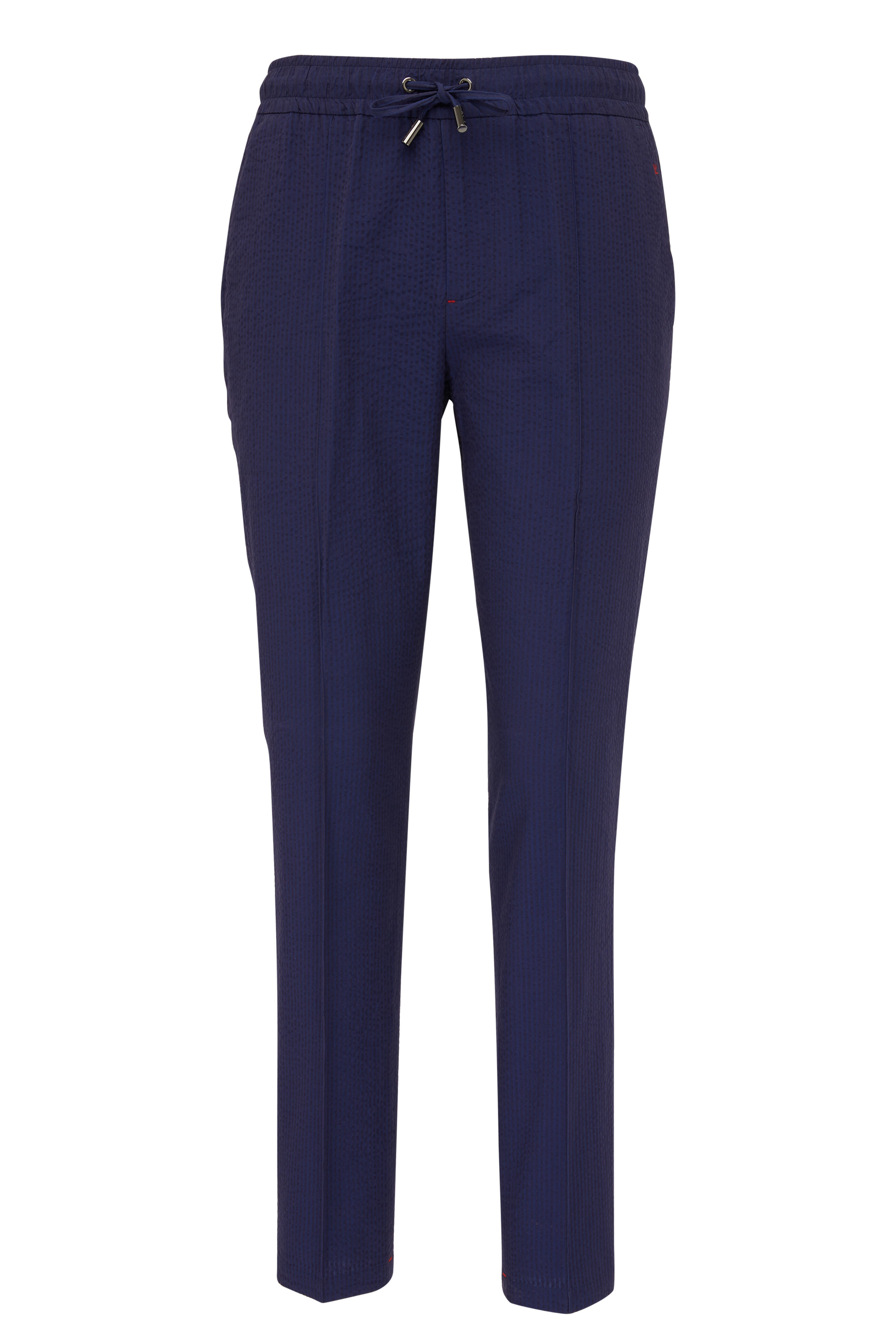 Drawstring waist. Pull-on style. Side slip pockets; back besom pockets. Made in Italy. 31" inseam. 100% cotton. Dry clean.