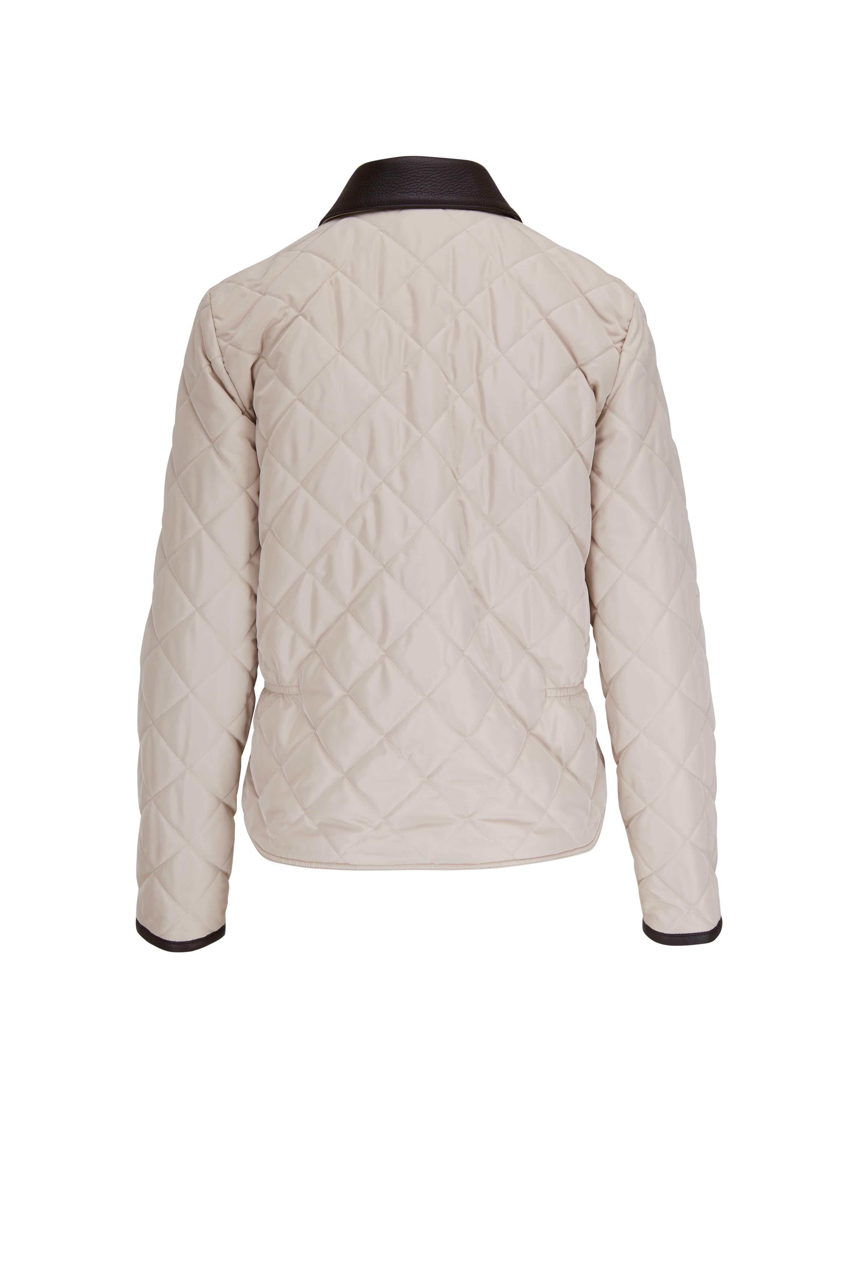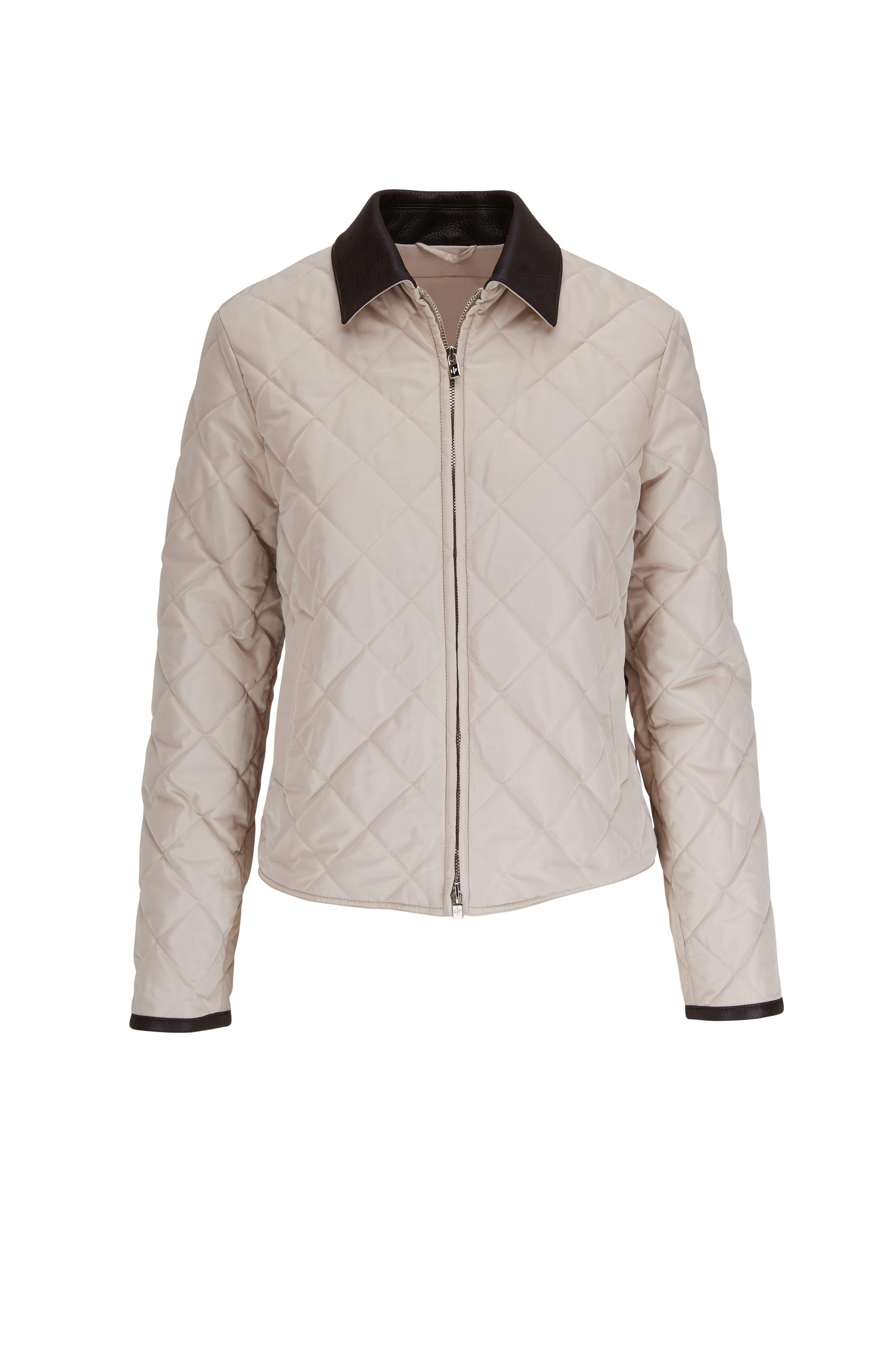 Leather point collar. Concealed two way front zip. Front angled welt pockets. Leather detail cuffs. Made in Italy. Shell: 65% Polyester, 35% Silk; Lining: 100% Cashmere; Details: 100% Deer Leather. Dry clean by specialist.