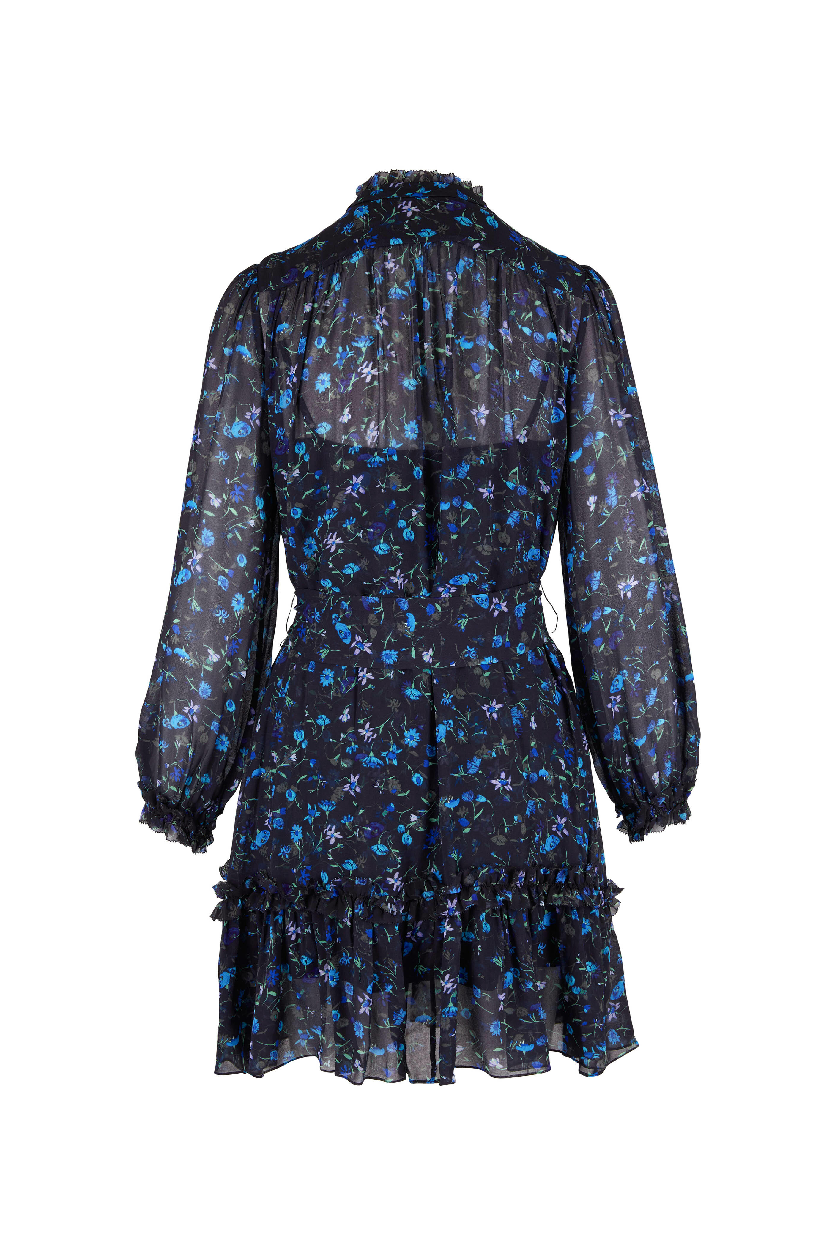 Stand-up collar with frills. Concealed button placket. Voluminous sleeves. Self-tie belt. Elasticated drawstring cuffs with appliquéd frills. Imported. 36" shoulder to hem. 100% viscose. Machine wash.