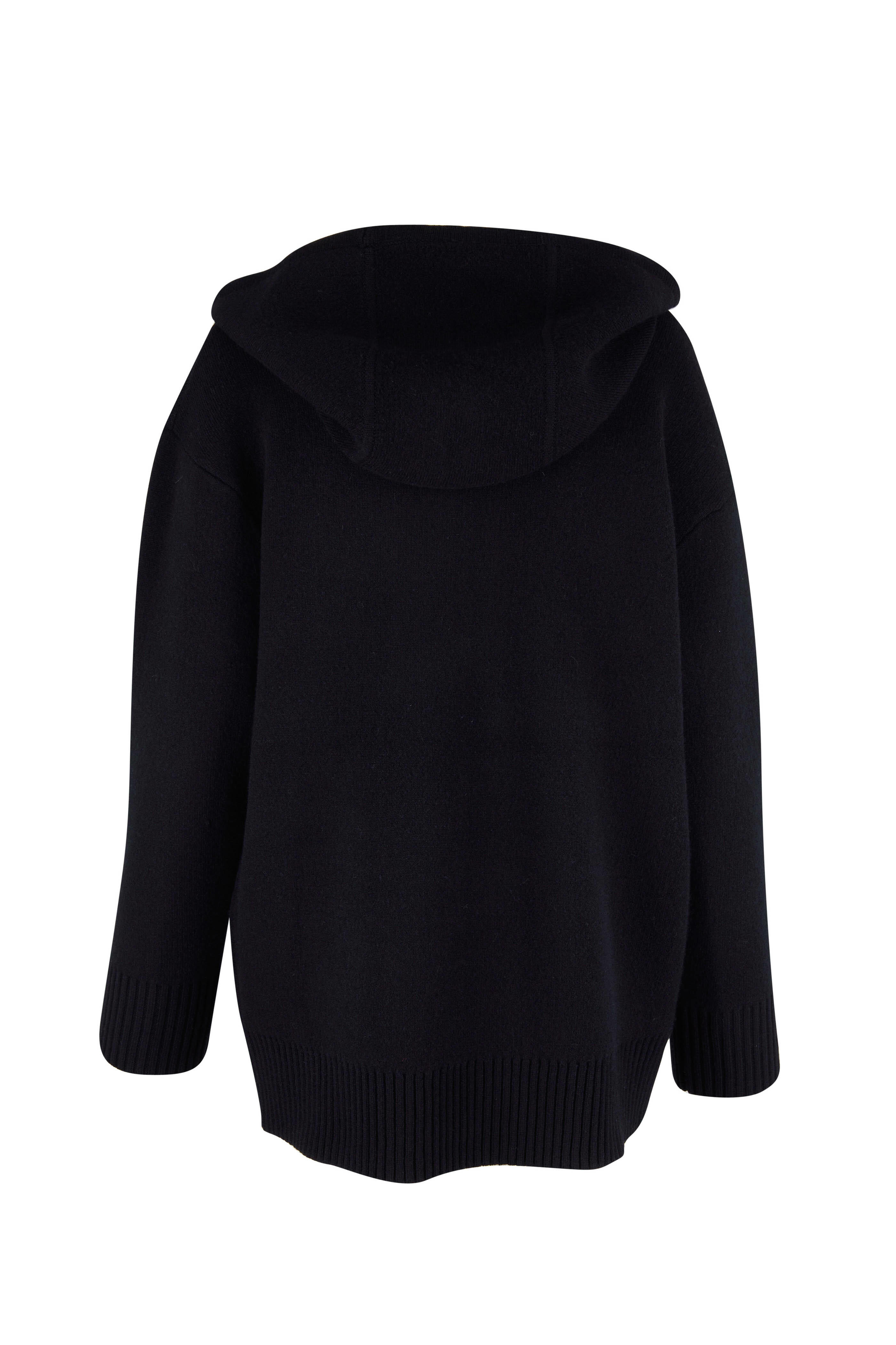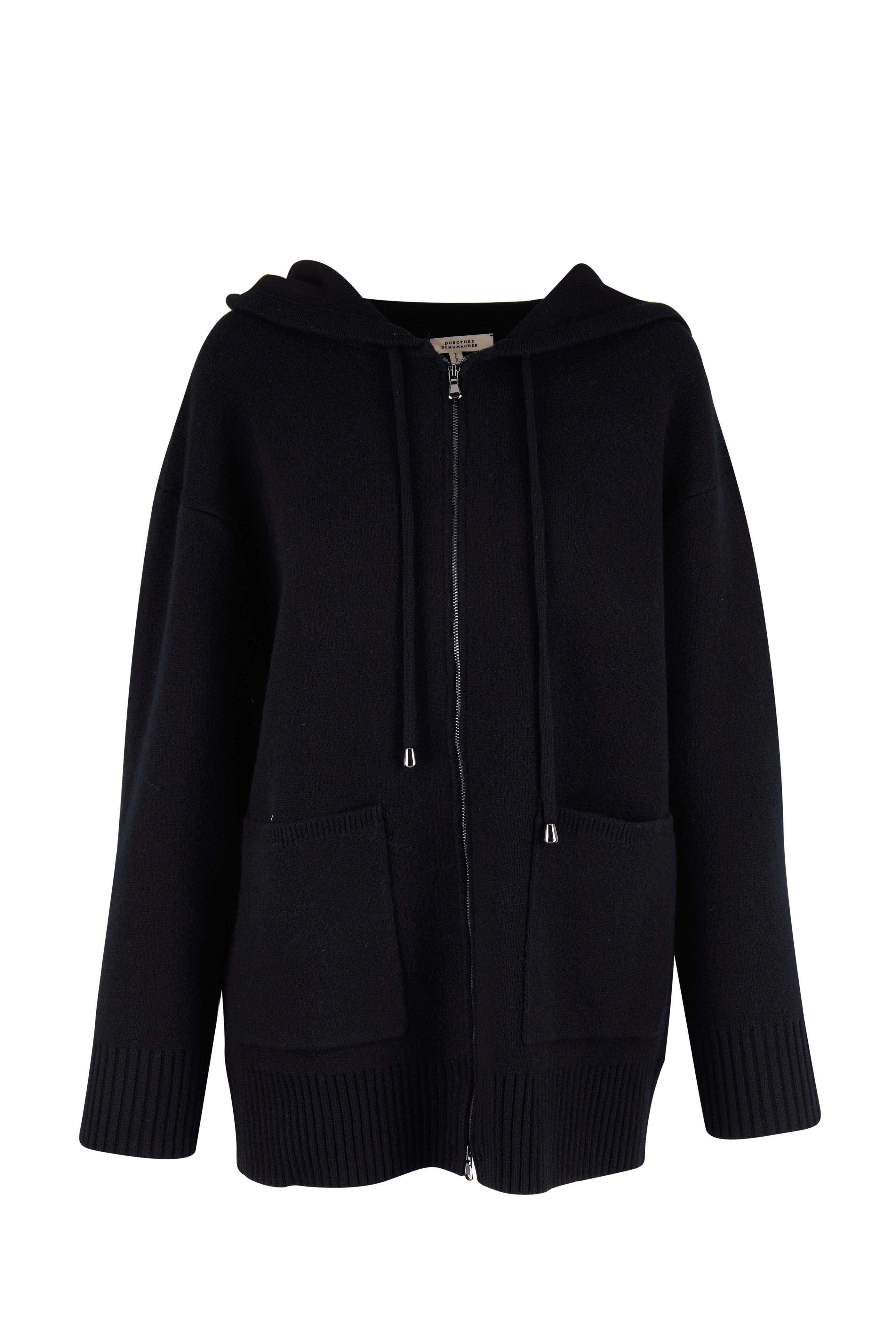 Attached drawstring hood. Two-way front zip. Front patch pockets. Ribbed trim. Imported. 33% wool, 30% viscose, 18% polyester, 14% cashmere, 4% nylon, 1% elastane. Dry clean.