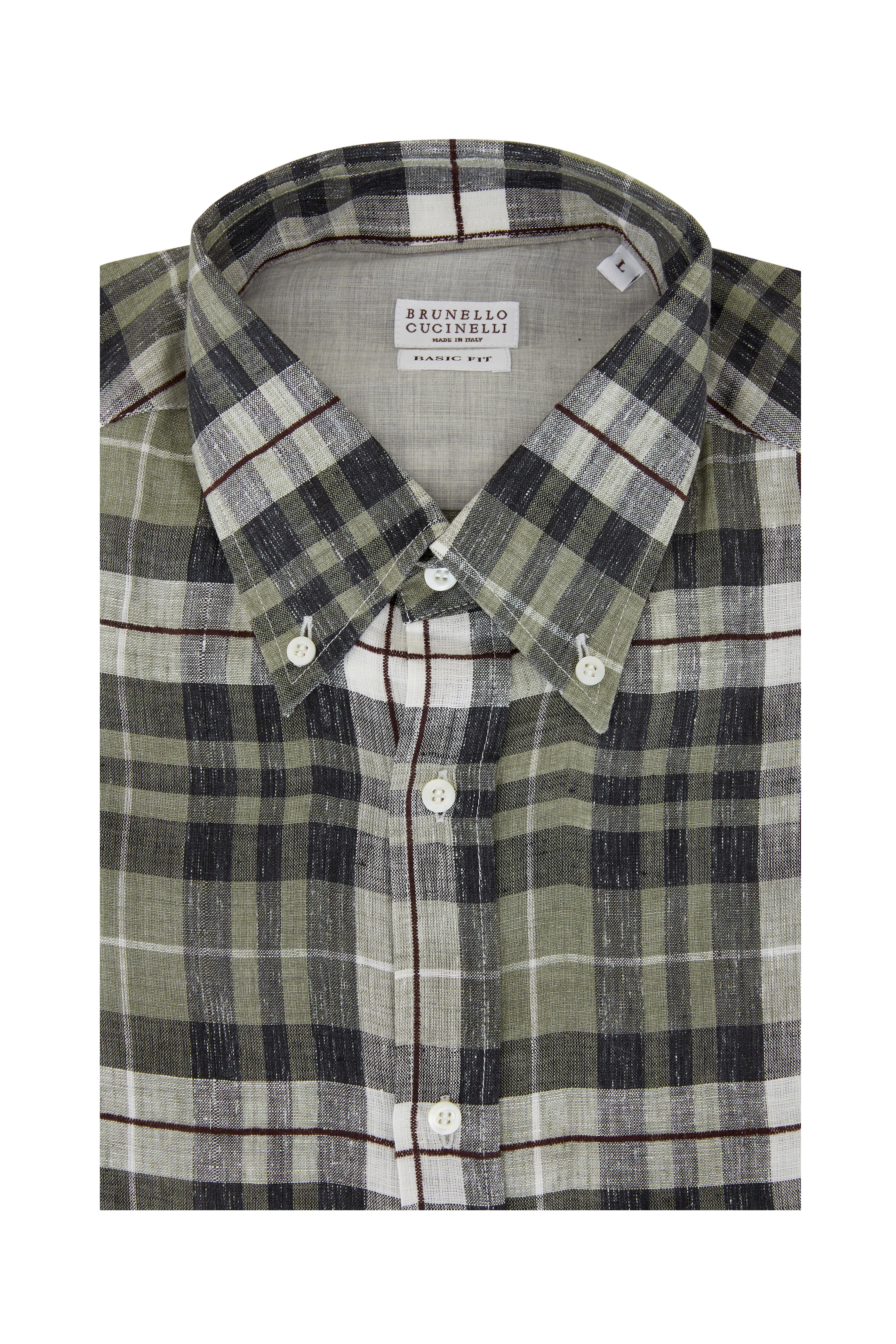 Green Plaid Linen Blend Basic Fit Sport Shirt