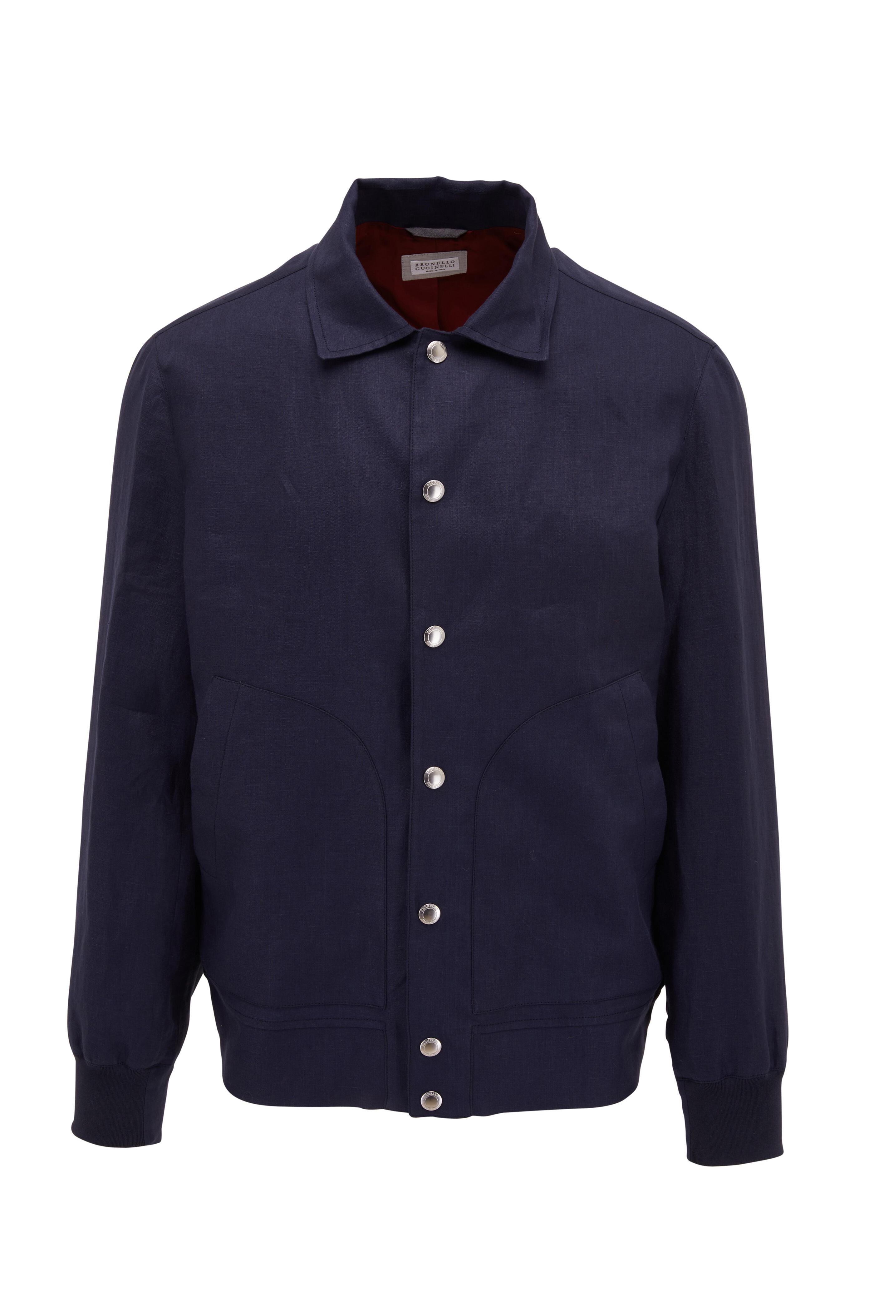 Spread collar. Ribbed cuffs. Side seam snap pockets. Banded hem. Made in Italy. 100% linen; lining: 100% cupro. Dry clean.