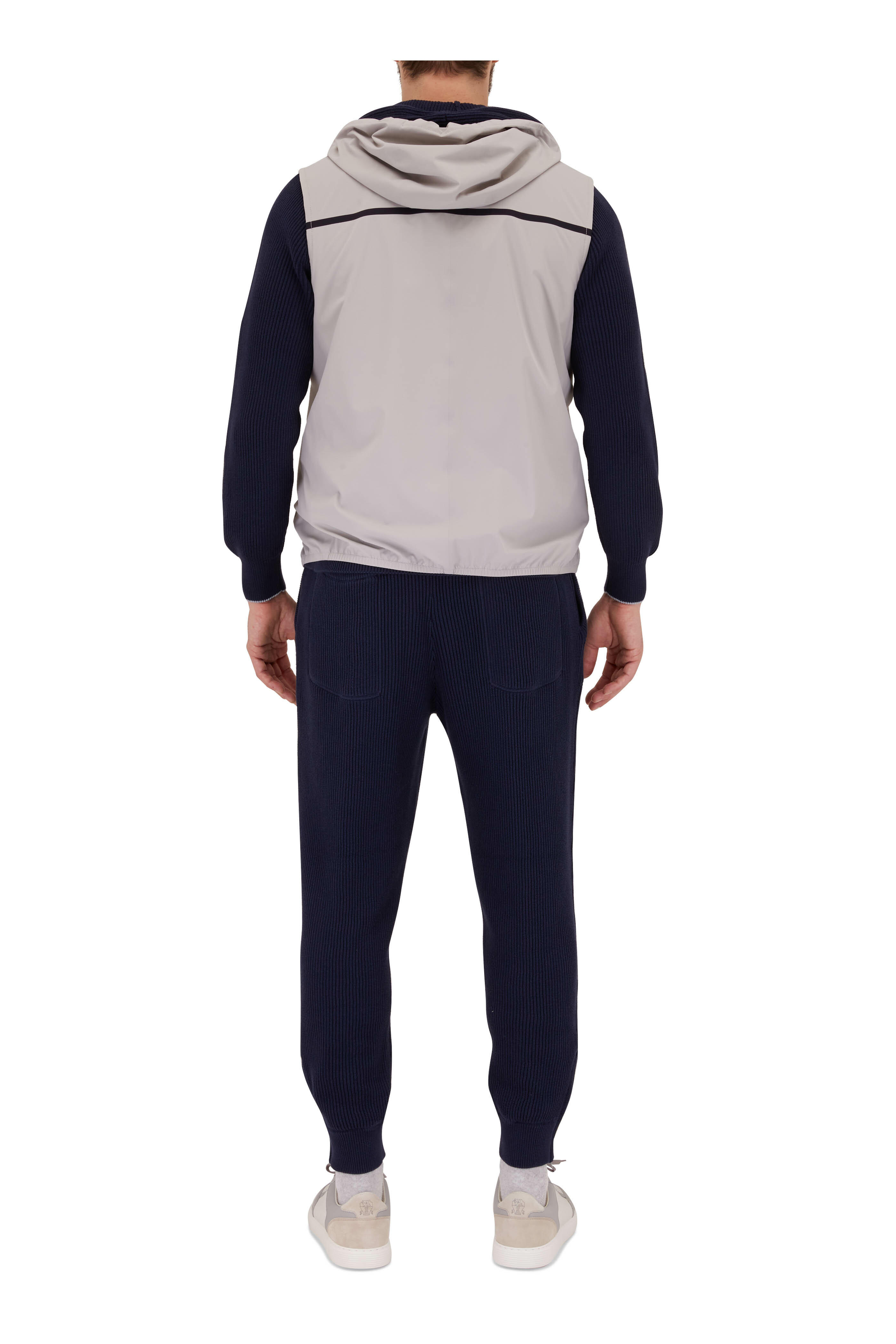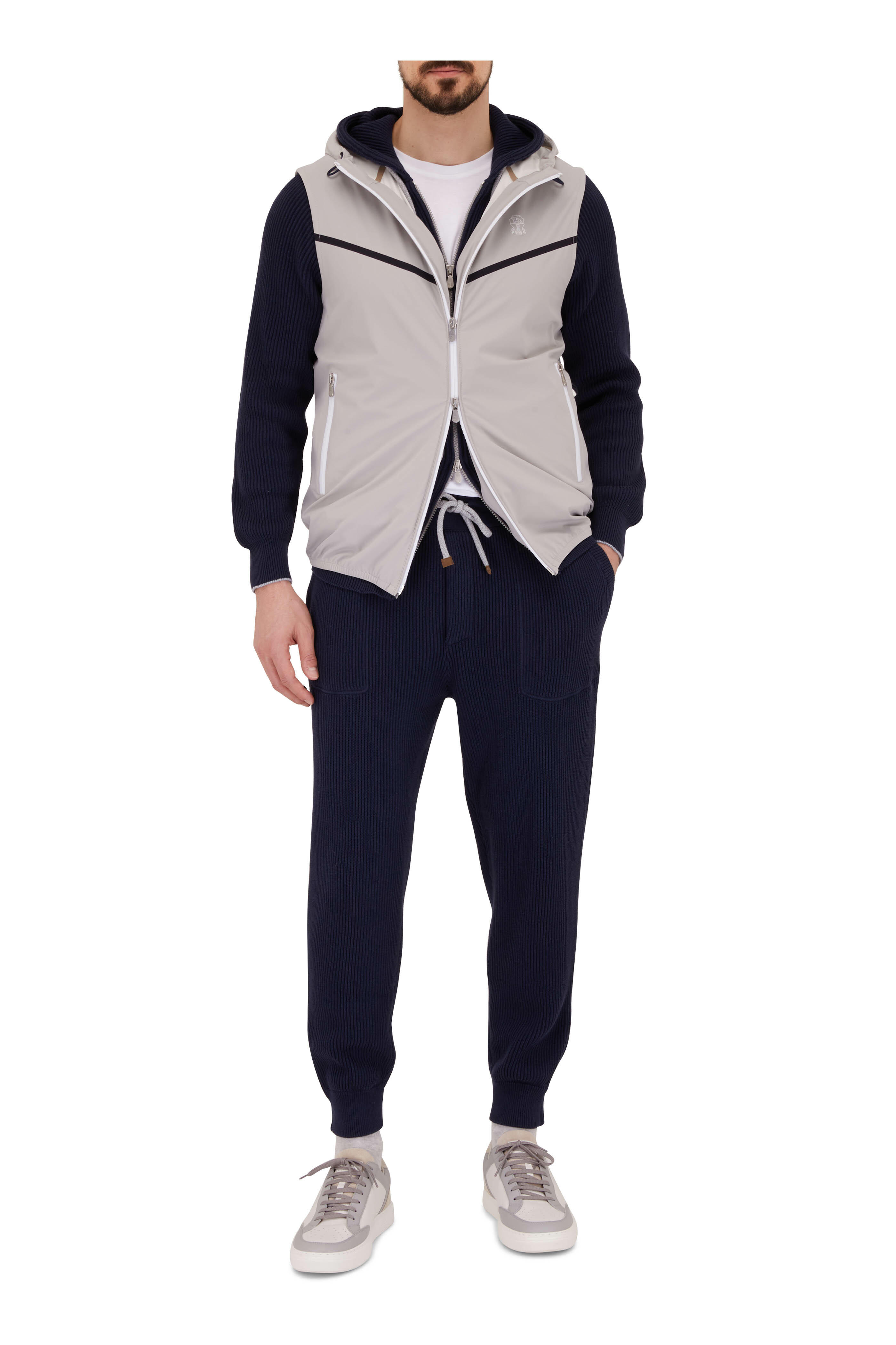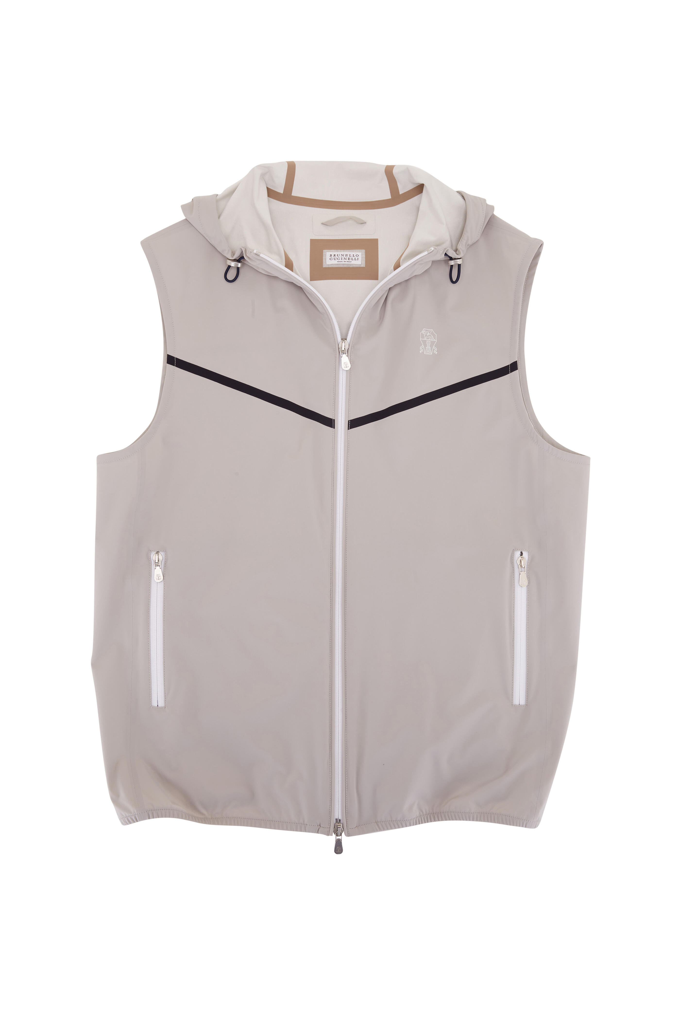 Wet clean. Drawcord hood. Two-way zip. Lower zip pockets. Logo detail at chest. Made in Italy. 49% polyamide, 41% polyester, 10% elastane.
