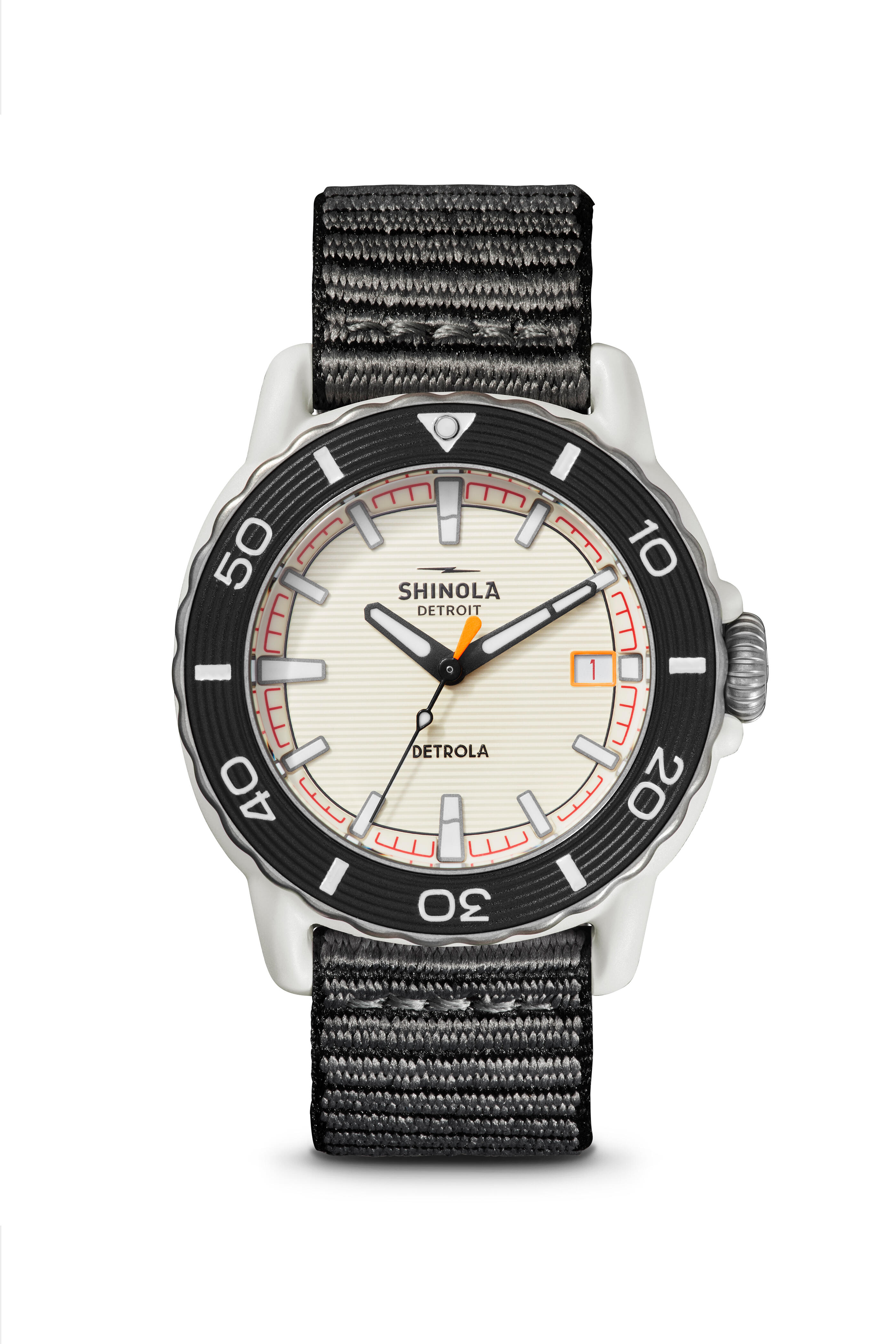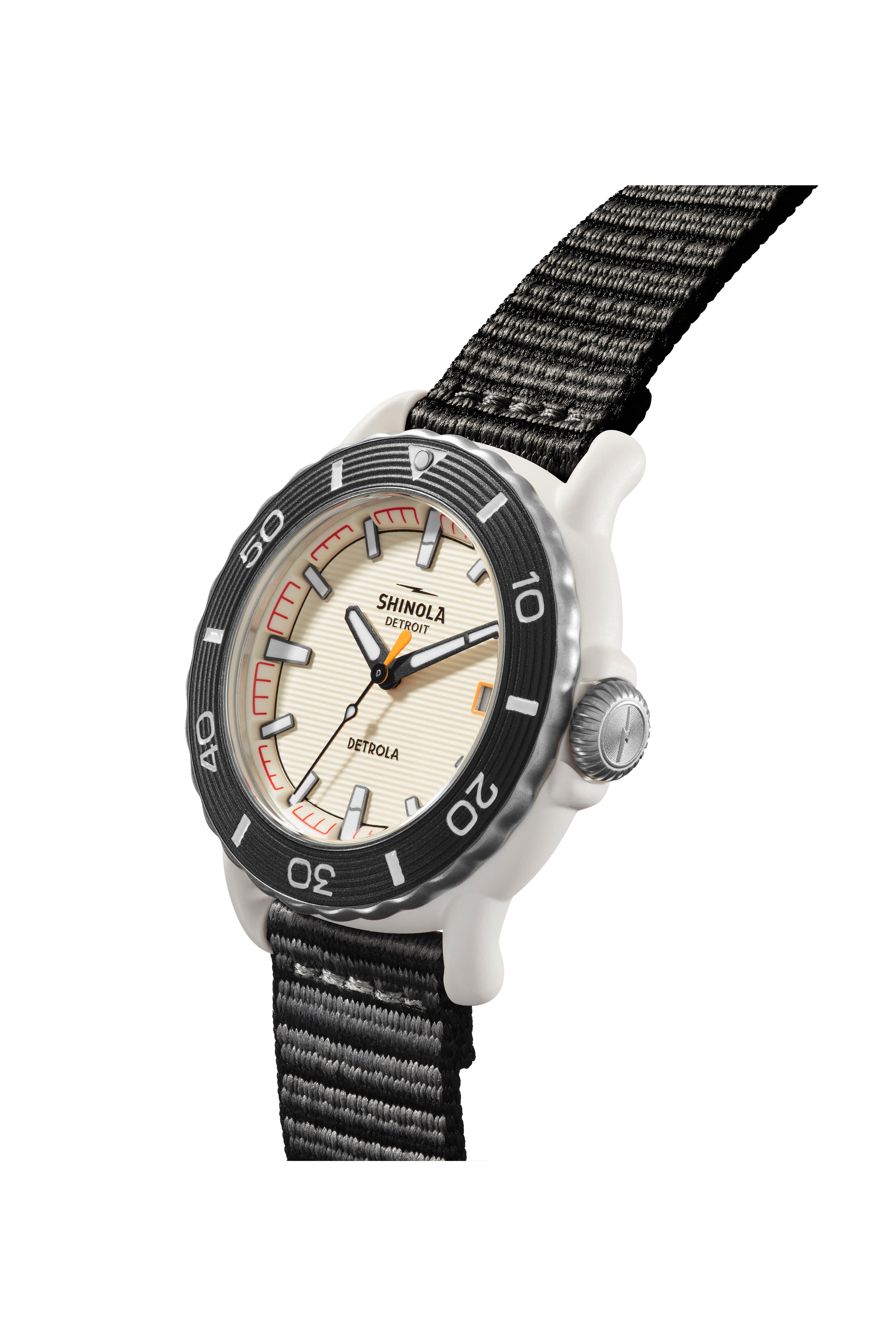 Stainless steel. Case size: 40mm. Adjustable buckle closure. Depth Rating: 10 ATM. Argonite 715 quartz movement. SuperLumi-Nova hands. Unidirectional rotating bezel, screw-down crown. Ocean bound plastic strap. Made in USA.