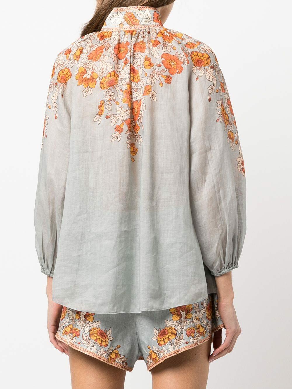 Banded collar. Button placket. Billow sleeves; elasticized cuffs. Imported. 100% ramie. Dry clean.