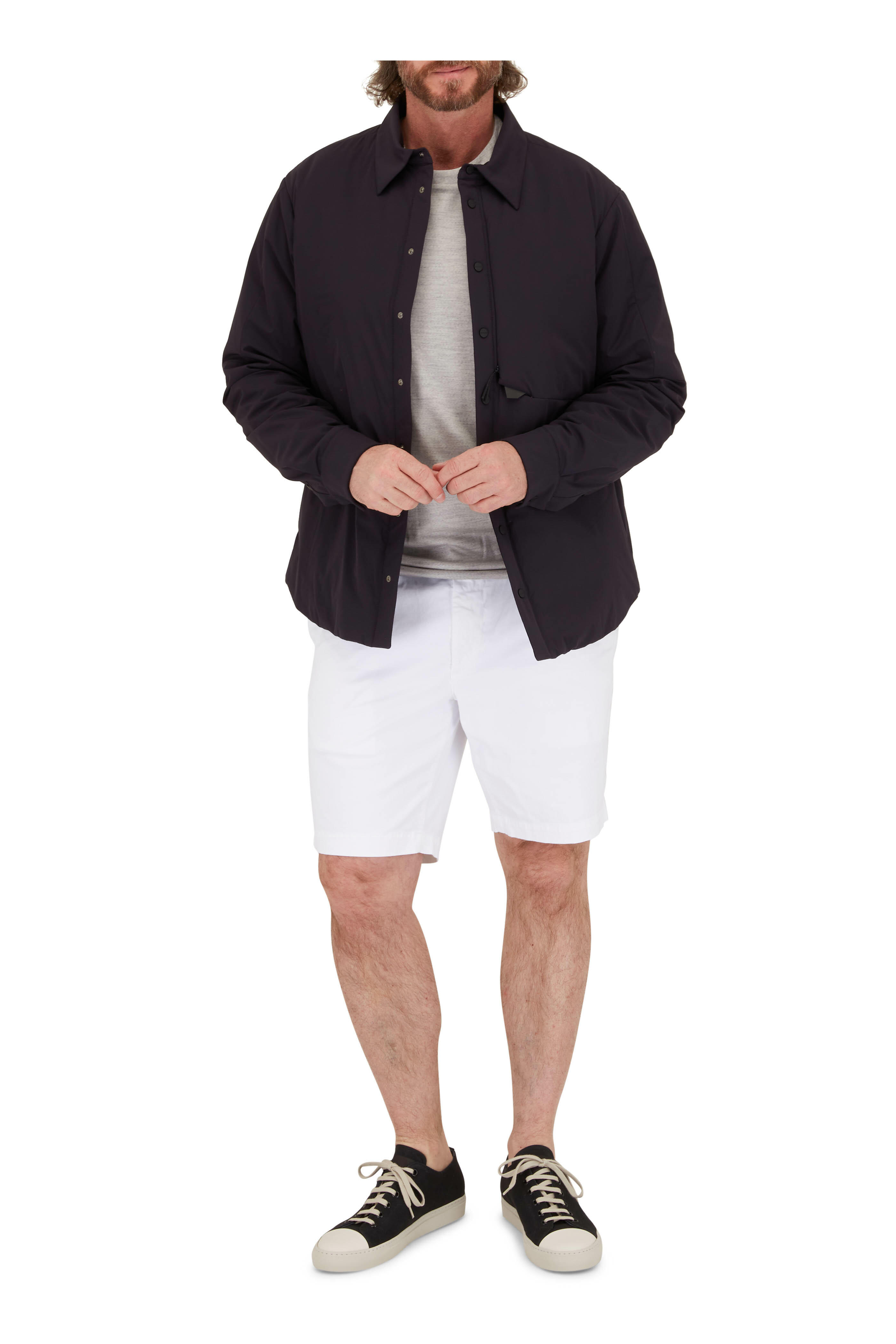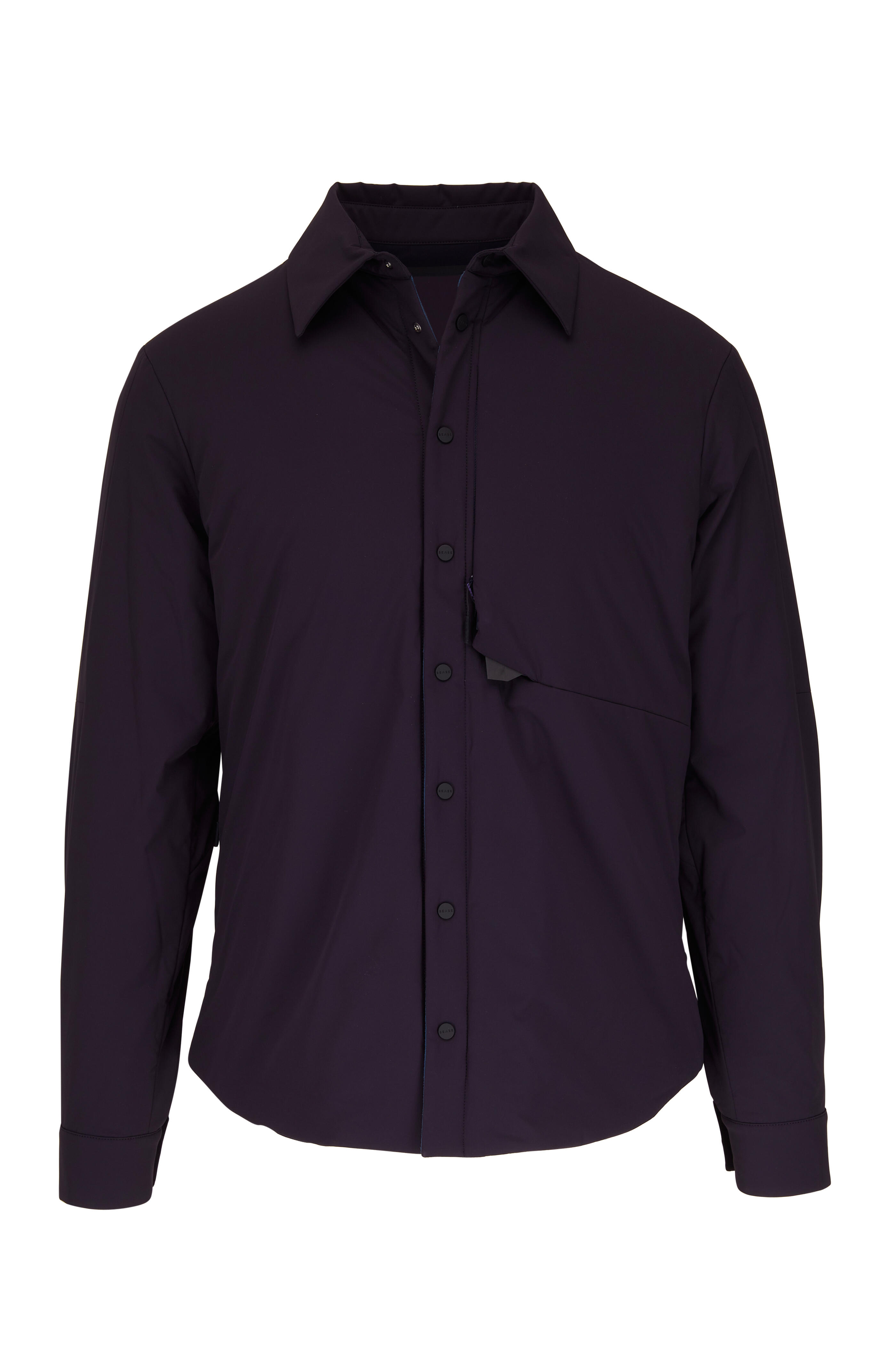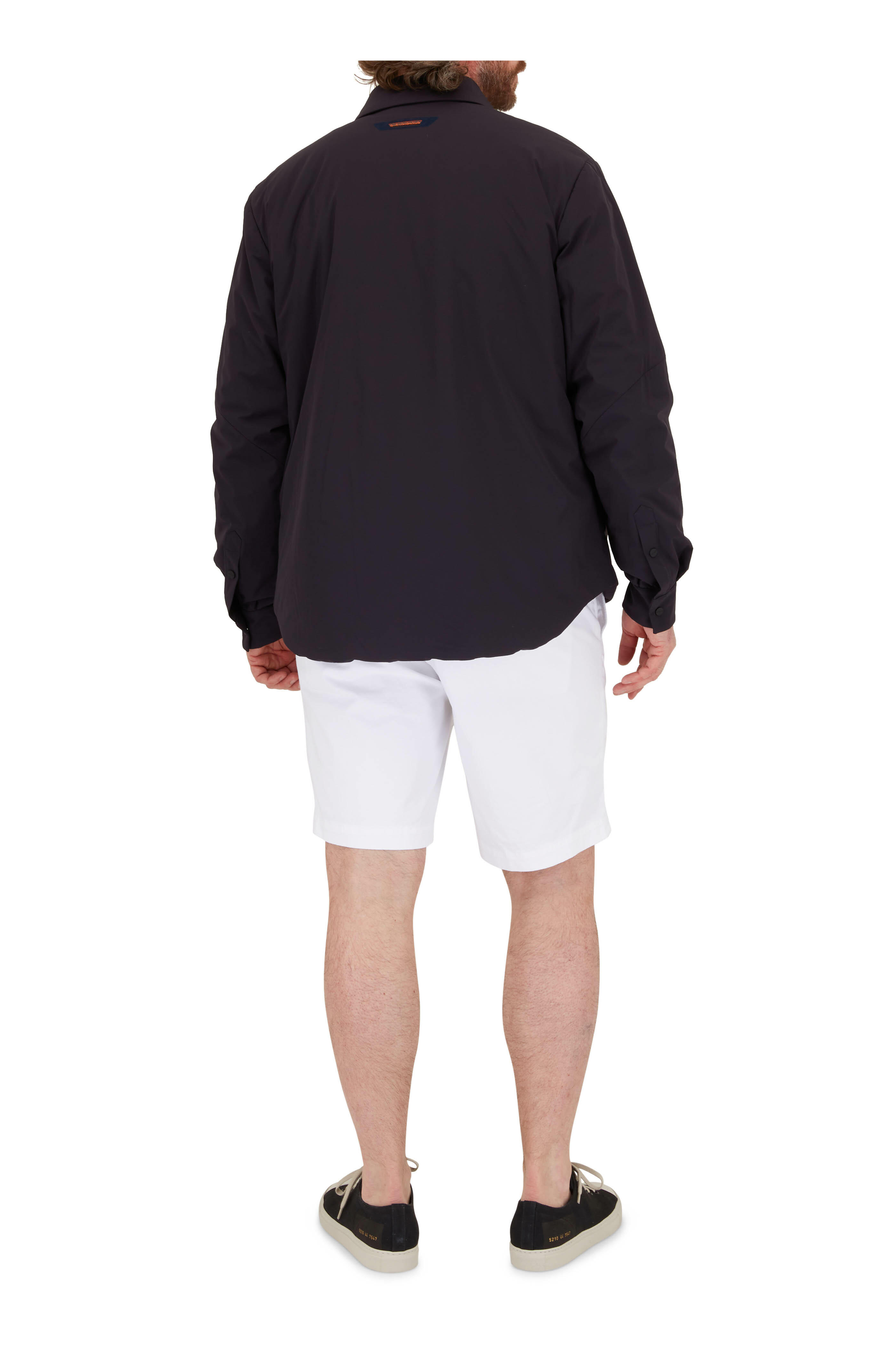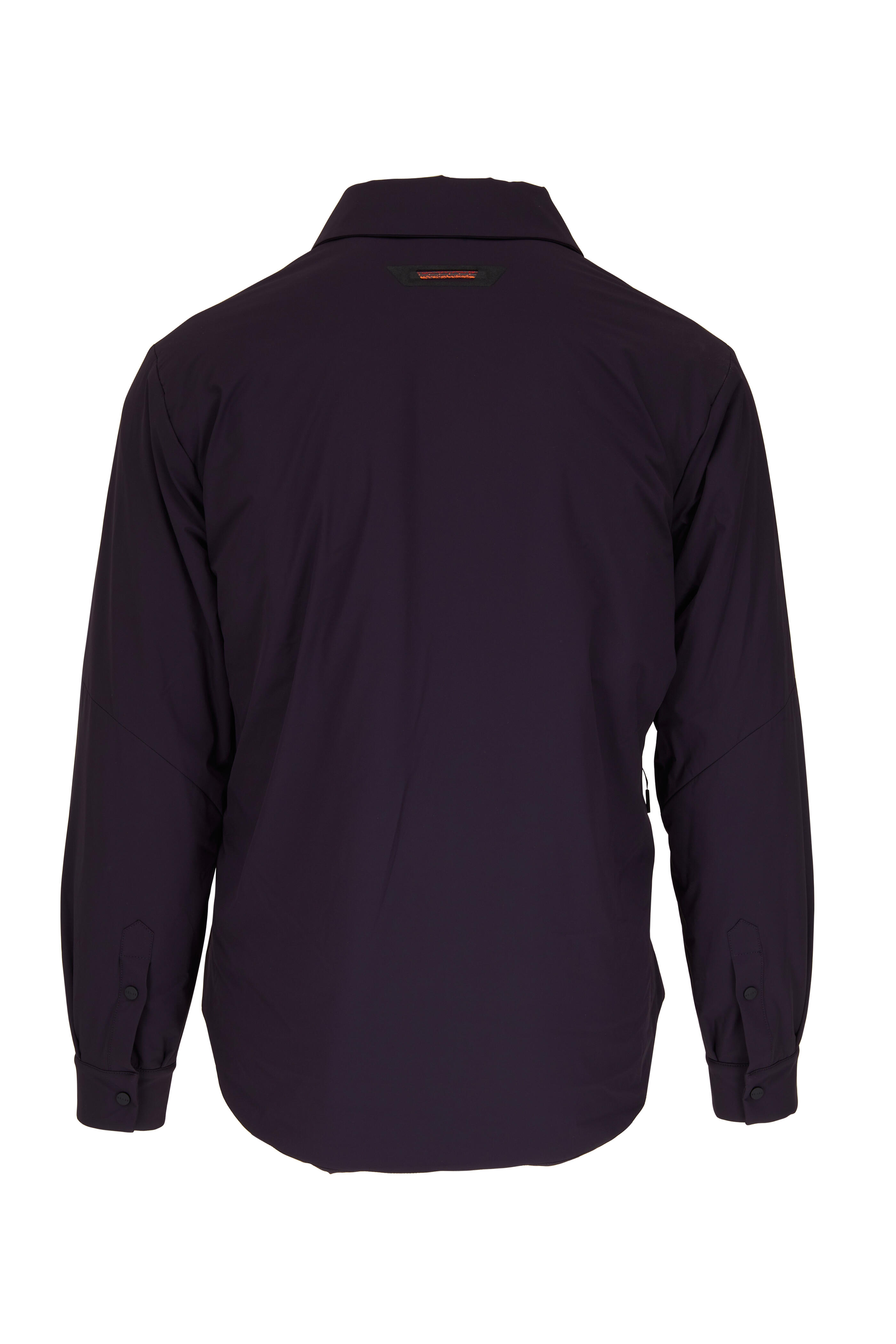 Spread collar. Exposed front button placket. Single button cuffs. Single concealed chest pocket with zip and velcro closures. Imported. 86% nylon, 14% spandex; lining: 73% nylon, 27% elastane. Machine wash.