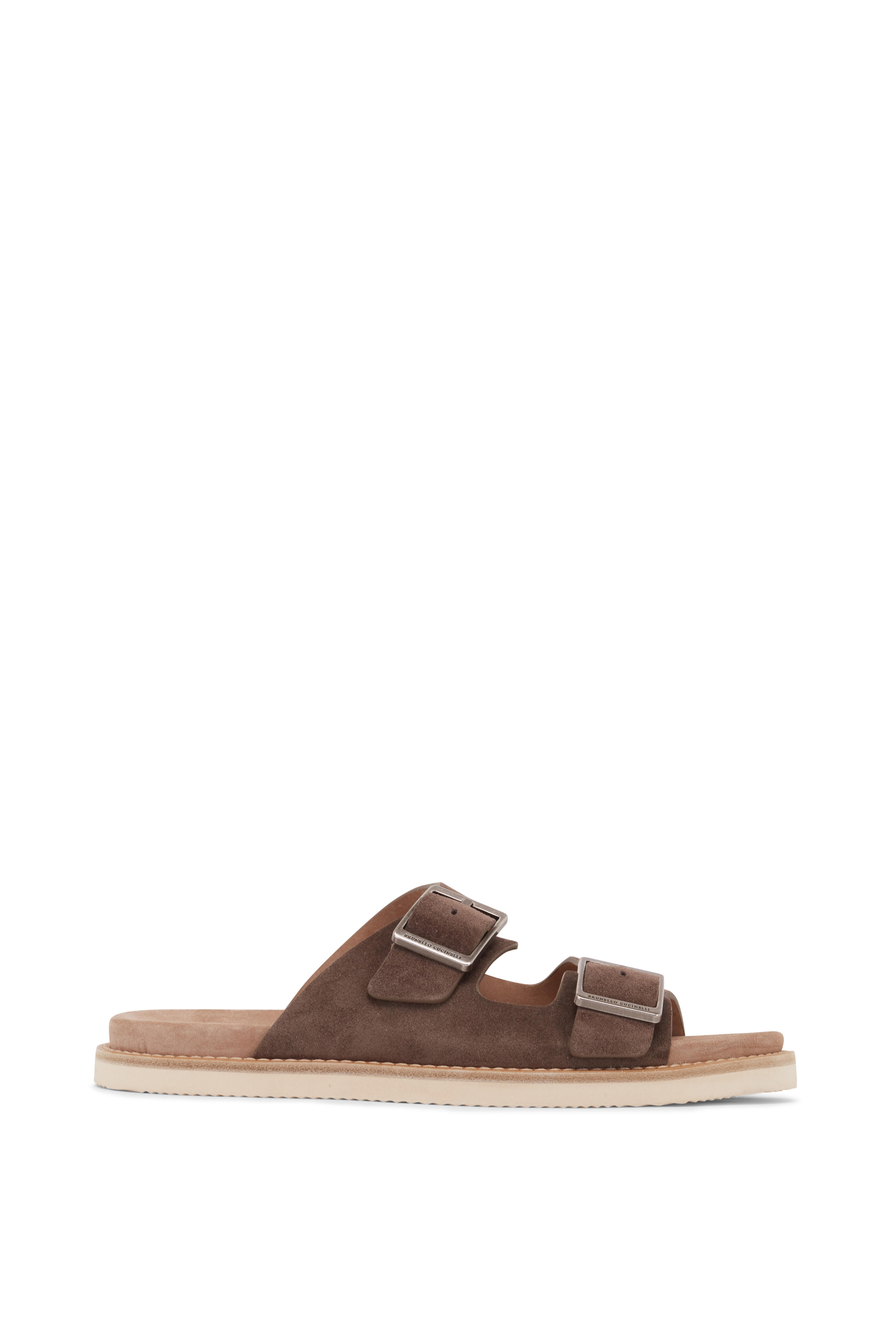 Suede upper. Open toe. Slide on style. Adjustable buckles at vamp. Molded footbed. Rubber sole. Made in Italy.