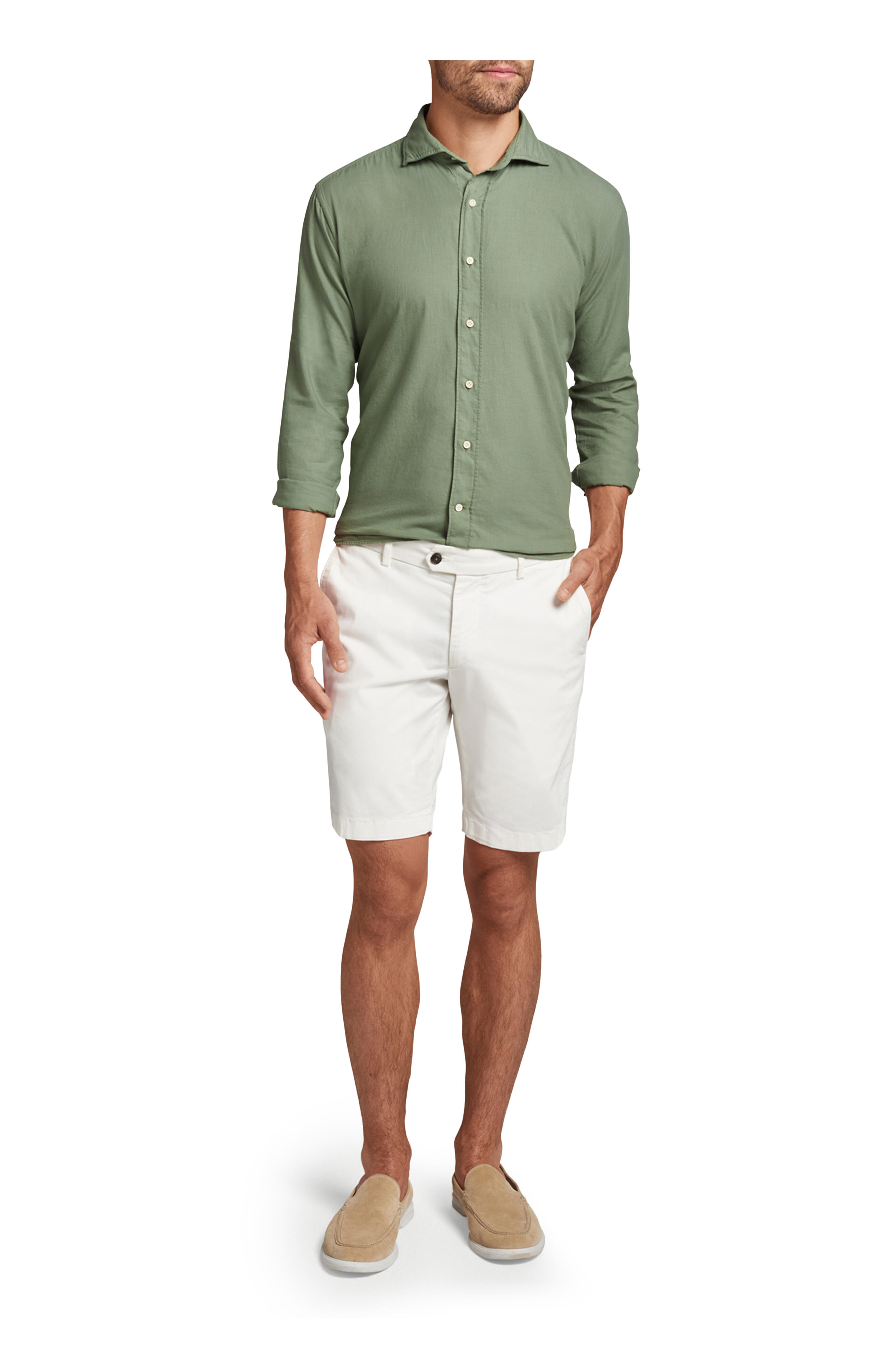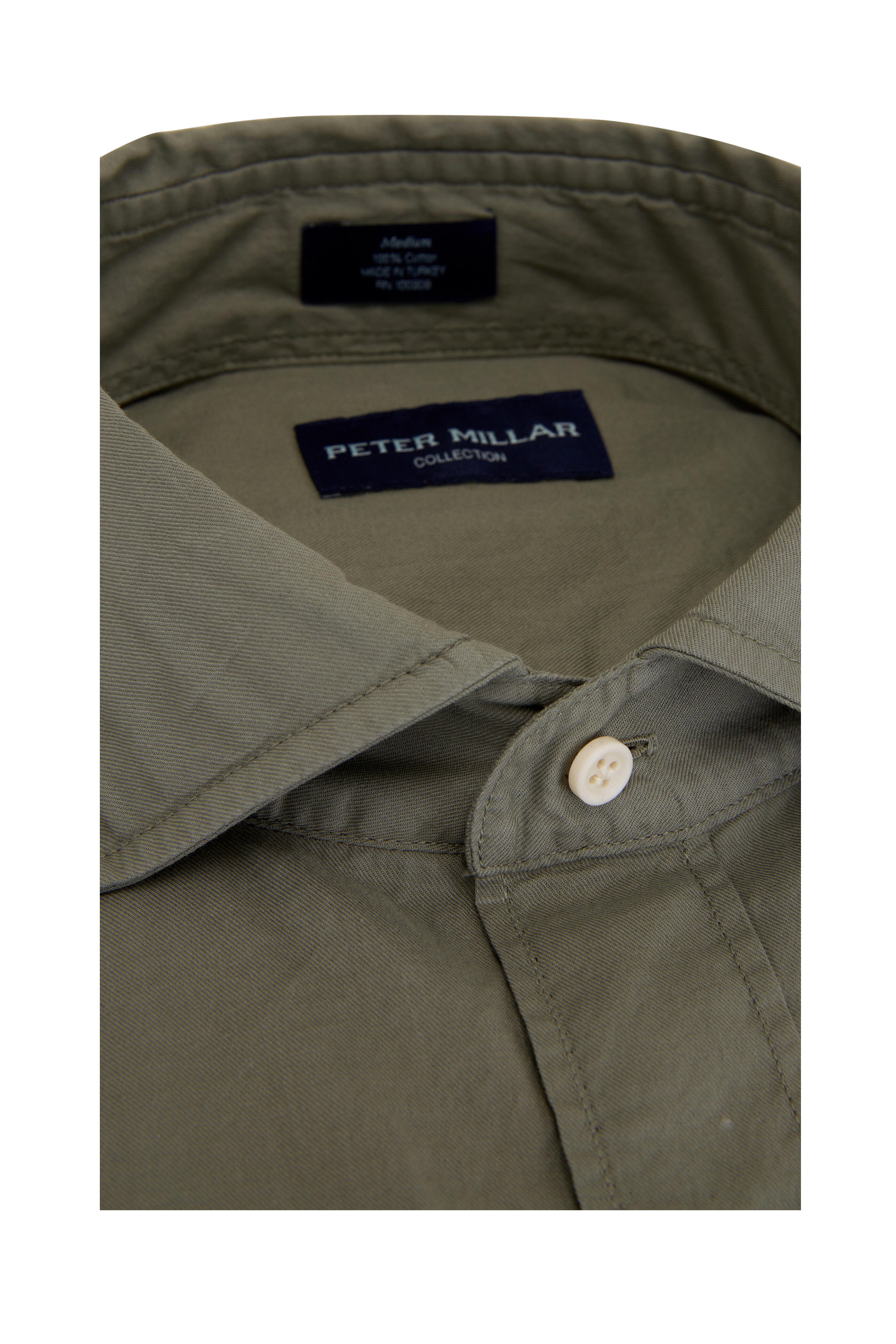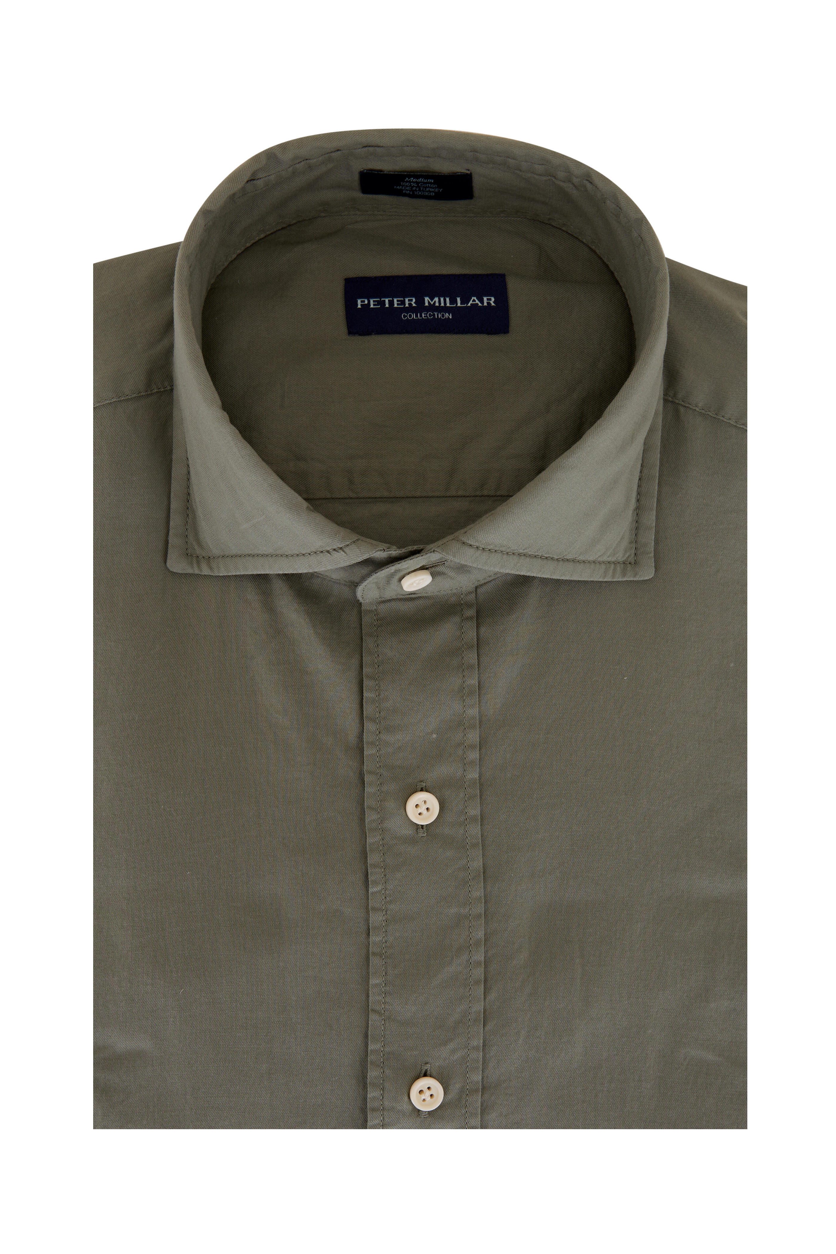 Spread collar. Front placket. Double-button mitered cuffs. Garment dyed. Imported. Tailored fit. Narrower fit throughout the sleeve. Fits slimmer in the shoulder, chest and waist. Enjoyed tucked or untuck. 100% cotton. Hand wash.