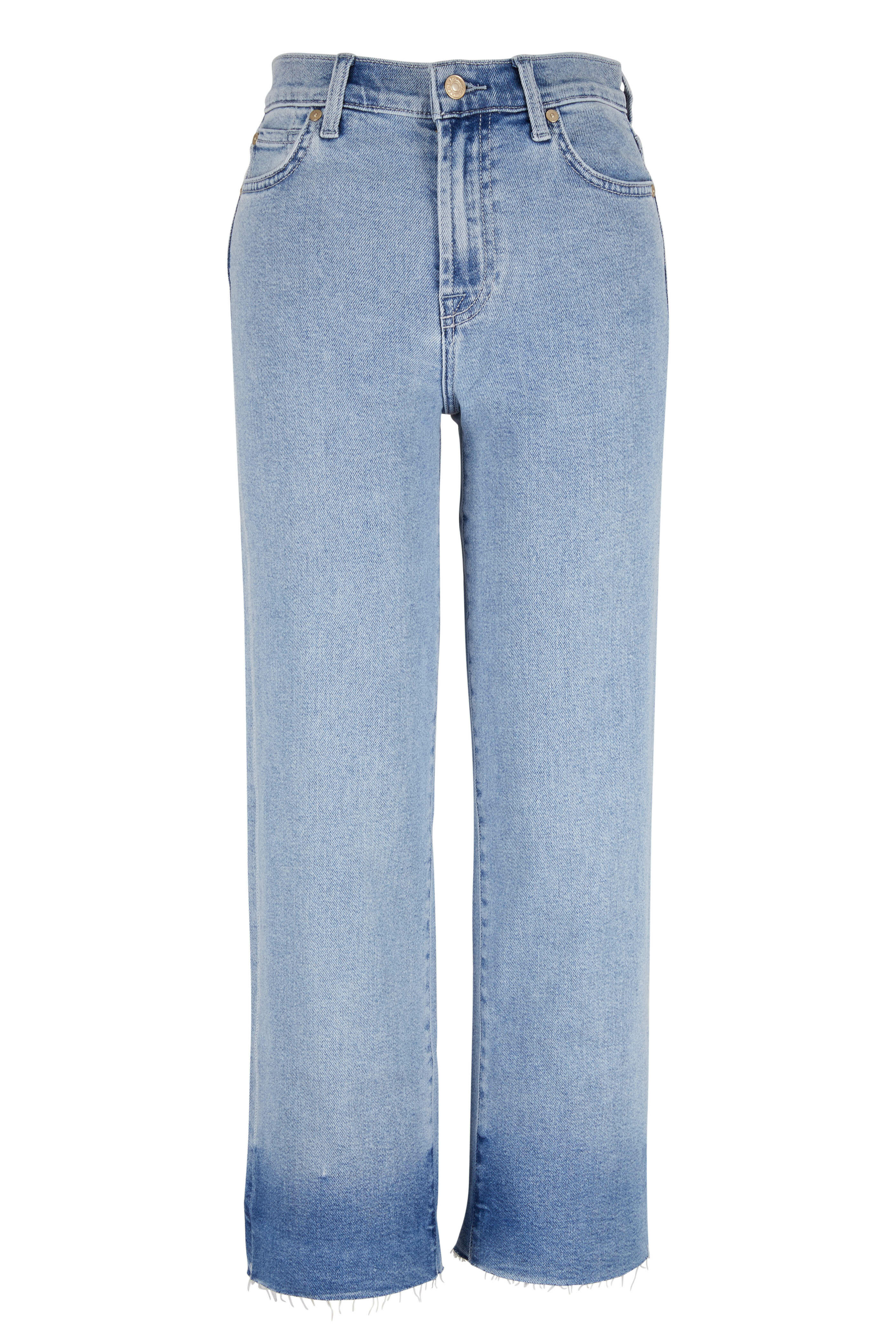 Belt loops. Zip and button fly. Five pocket styling. Raw edge hem with subtle dip dye at cuffs. Imported. Color: Luxevintagejones. Cropped, high-rise, wide leg. 10.8" rise. 26.5" inseam. 82% cotton, 13% modal, 4% elastrell, 1% elastane. Machine wash.