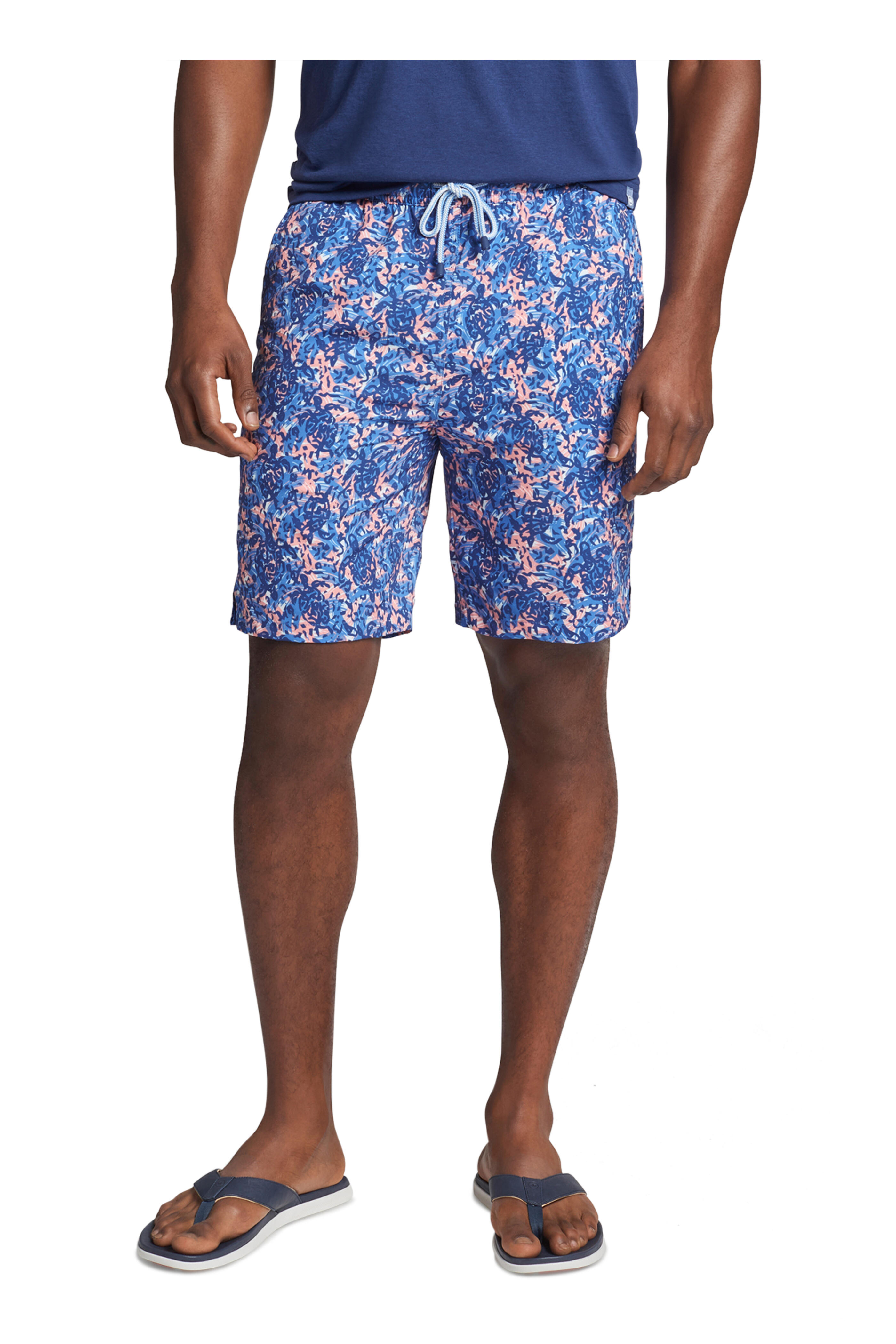 Elasticized, drawstring waist. Quarter-top pockets; back flap pocket. Imported. Classic fit. 8" inseam. 88% polyester, 12% spandex. Machine wash.