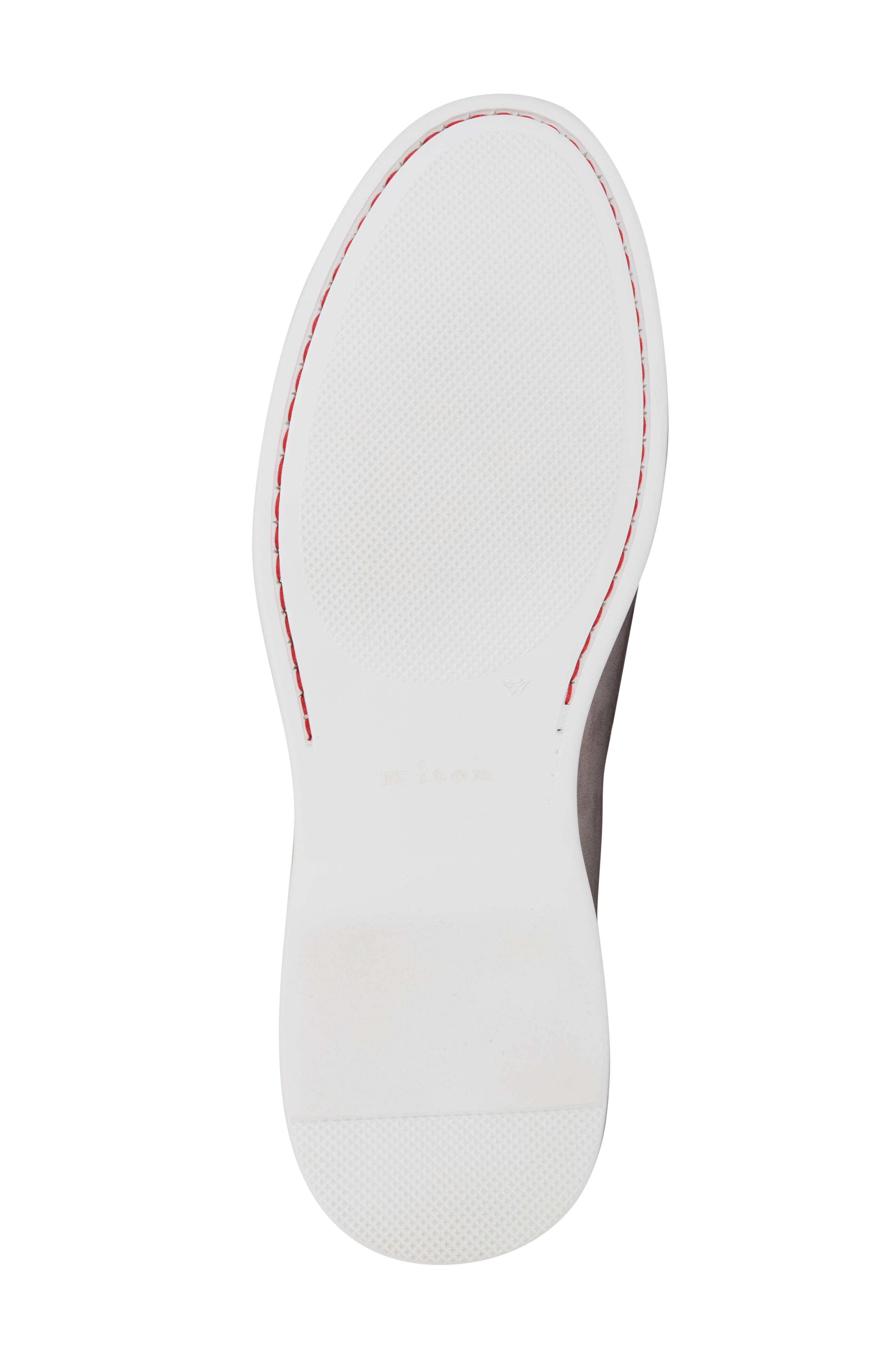 Suede upper. Moc toe. Penny strap at vamp. Leather lining and insole. Contrast rubber sole. Made in Italy.