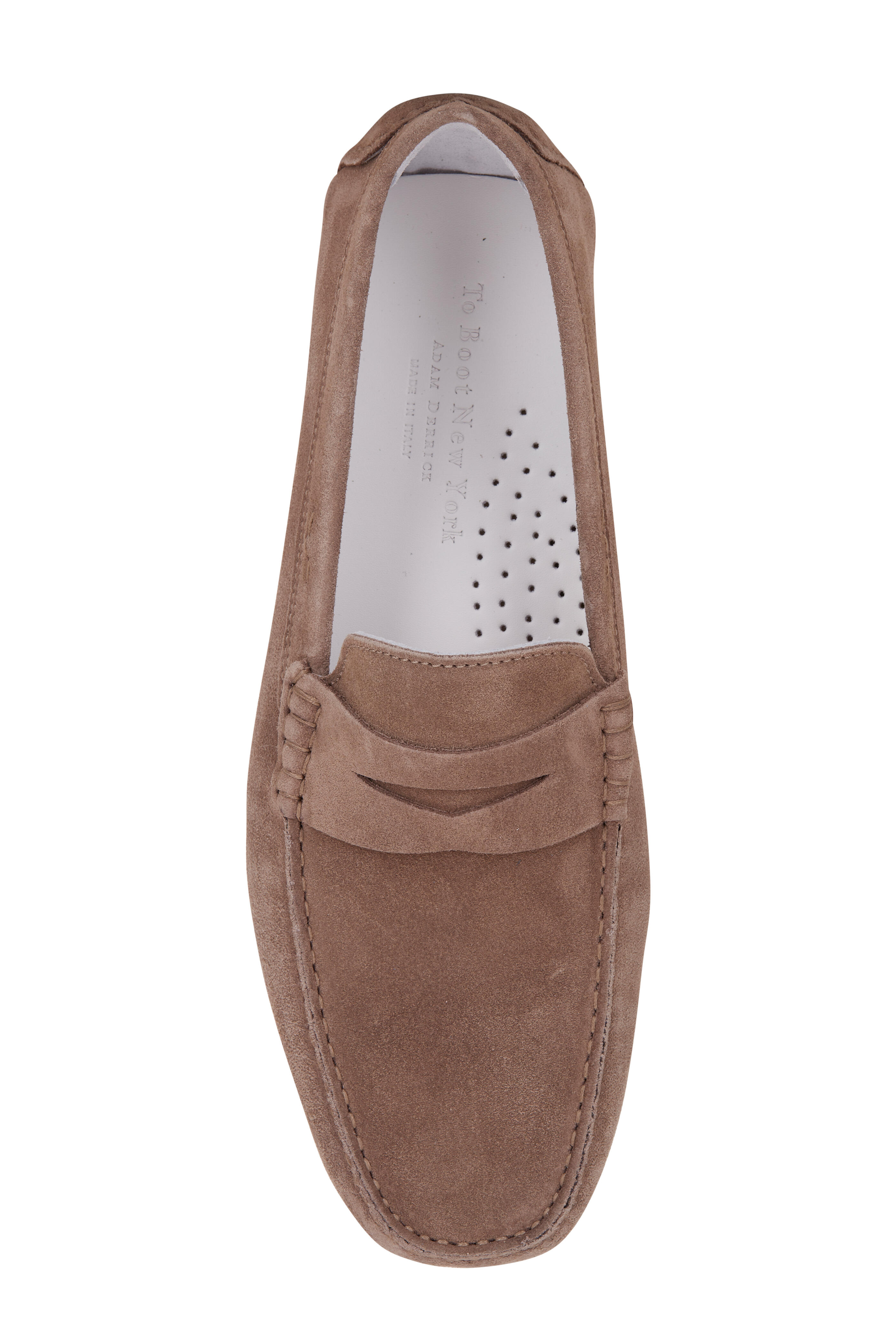 Suede upper. Apron toe. Penny strap at vamp. Leather lining and insole. Pebbled rubber sole. Made in Italy.