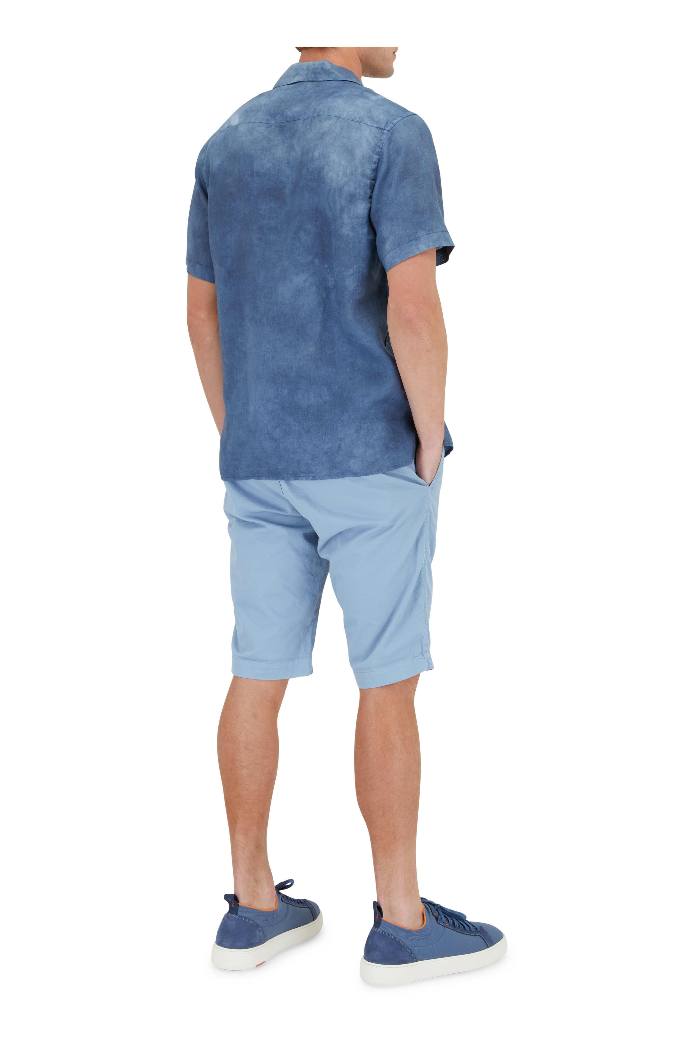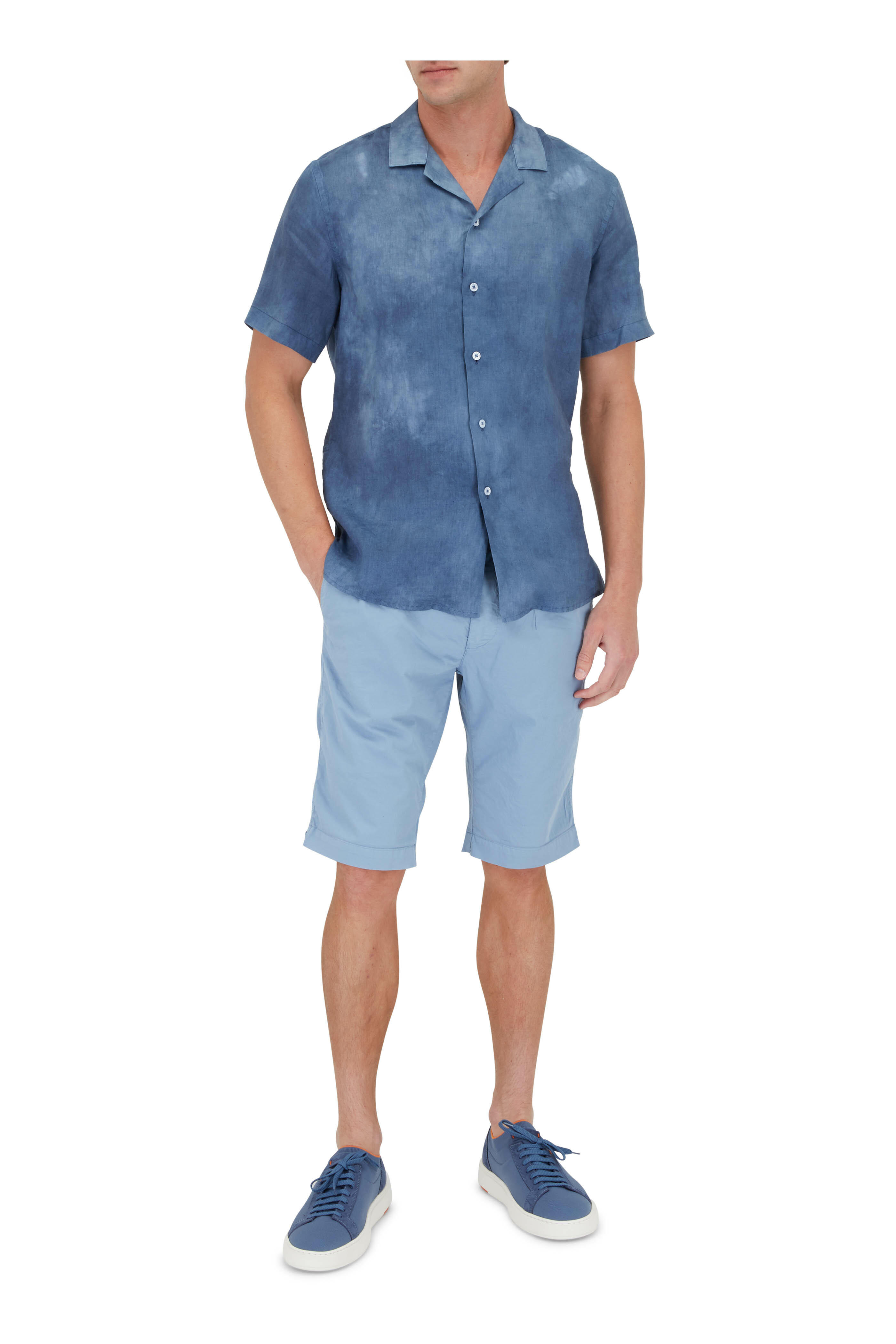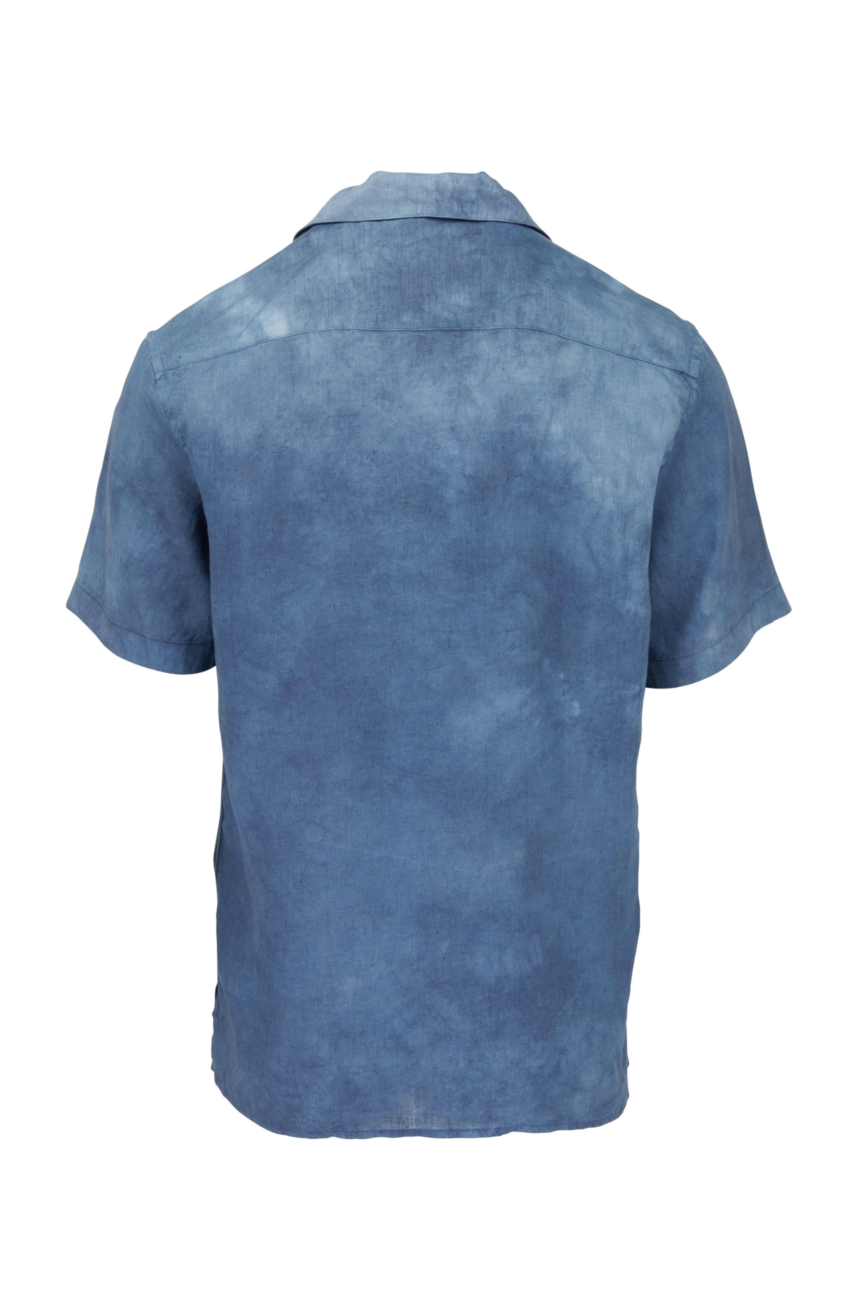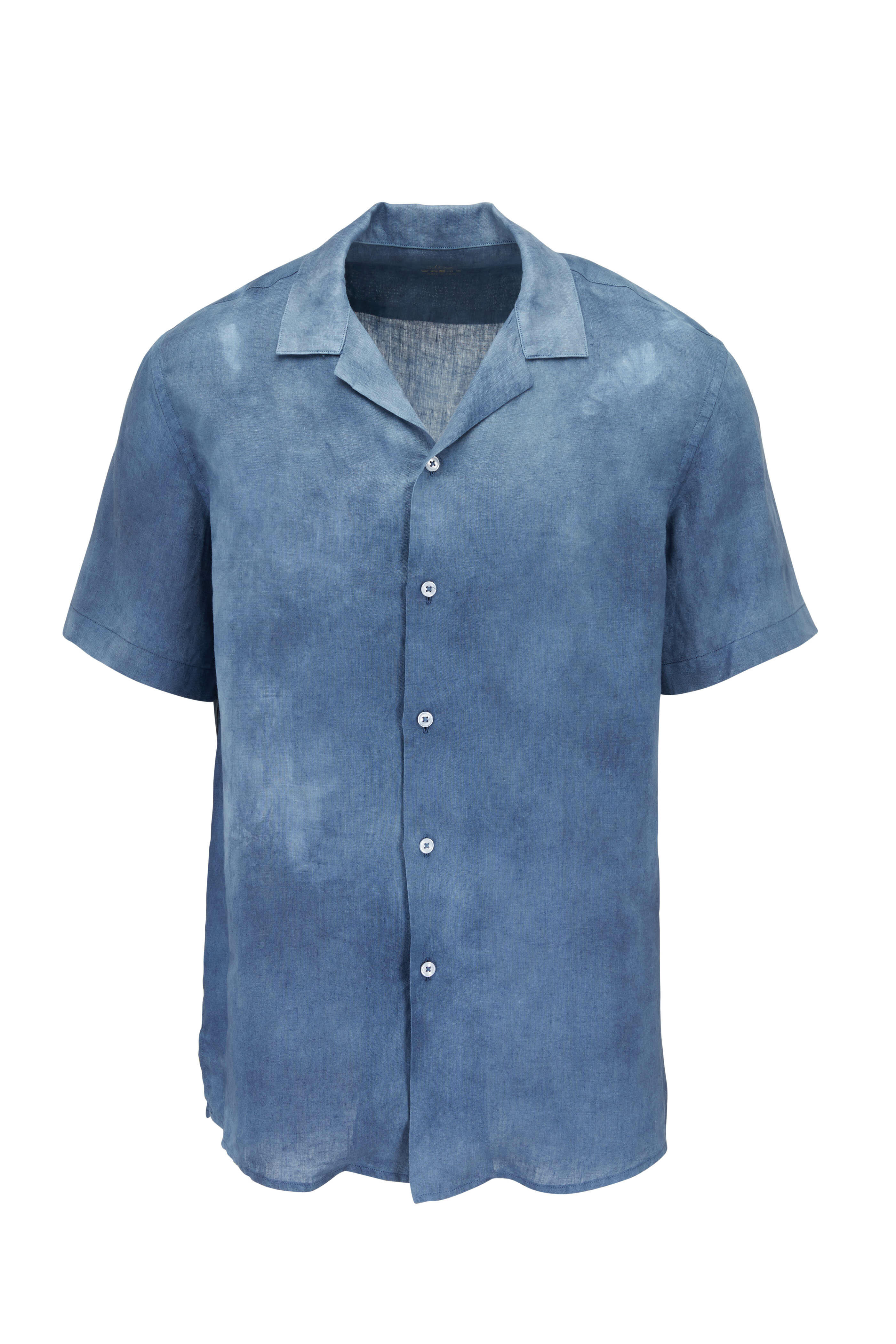 Spread collar. Front button placket. Short vented hem. Made in Italy. 100% linen. Machine wash.