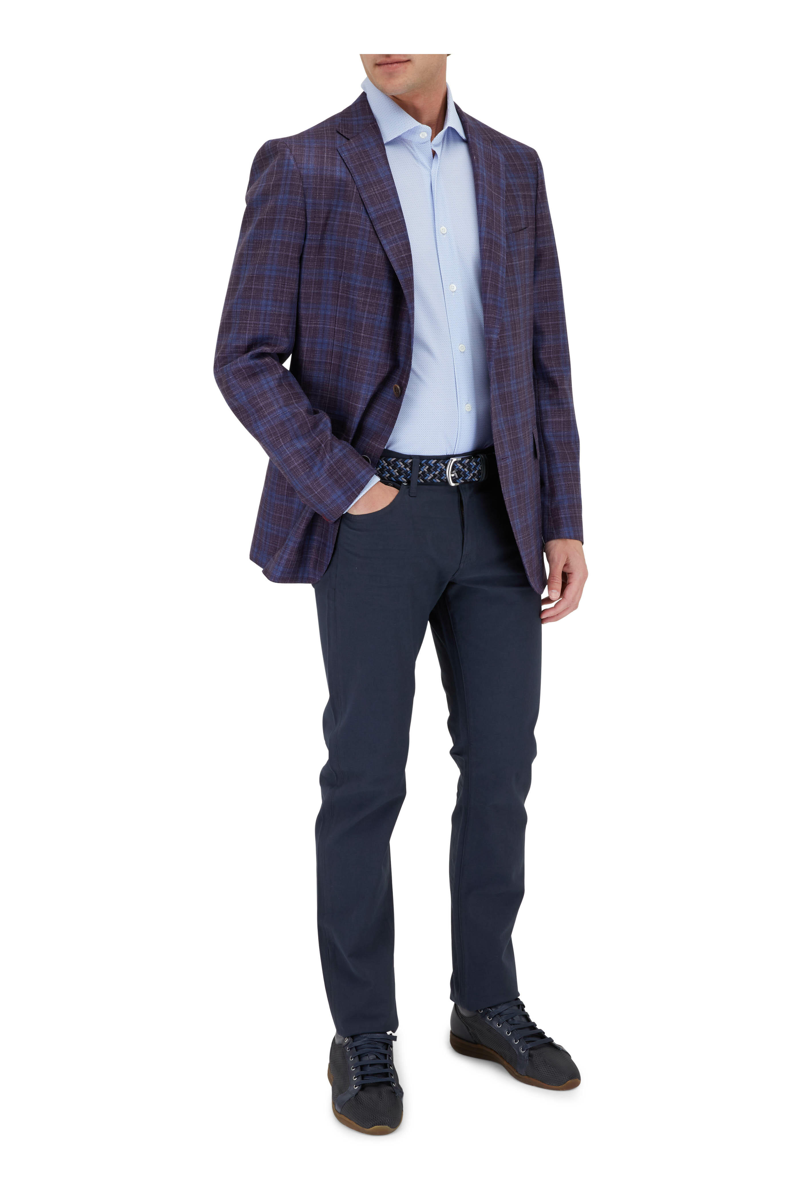 Spread collar. Single-button barrel cuff. French placket. Stretch. Imported. 74% polyamide, 26% elastane. Machine wash.